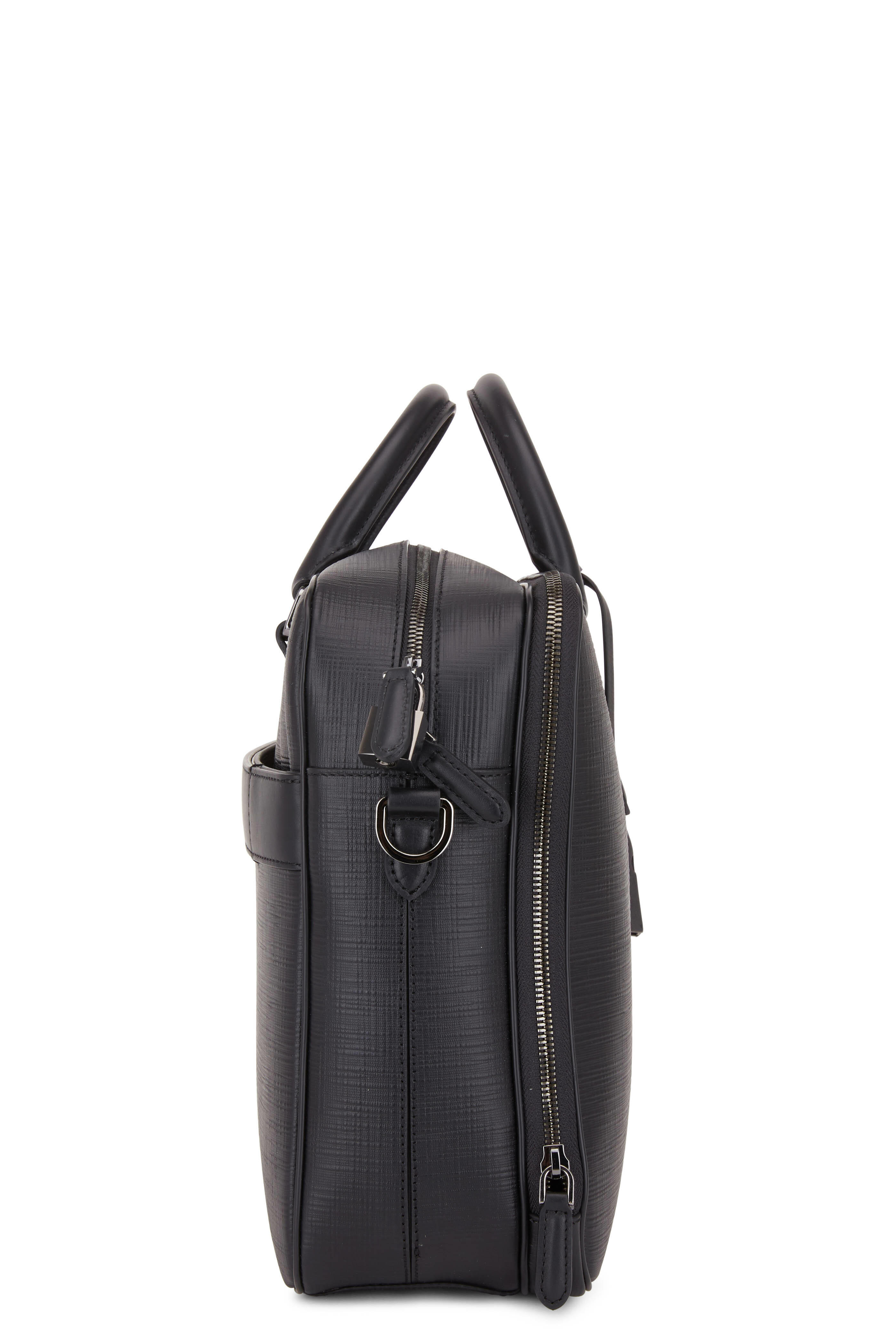 Textured calfskin leather. Dual rolled top handles. Detachable and adjustable shoulder strap. Top zip closure, lock and key. Two zipped compartments. Lined in suede. Made in Italy. Width: 15". Height: 11". Depth: 4 ½'.