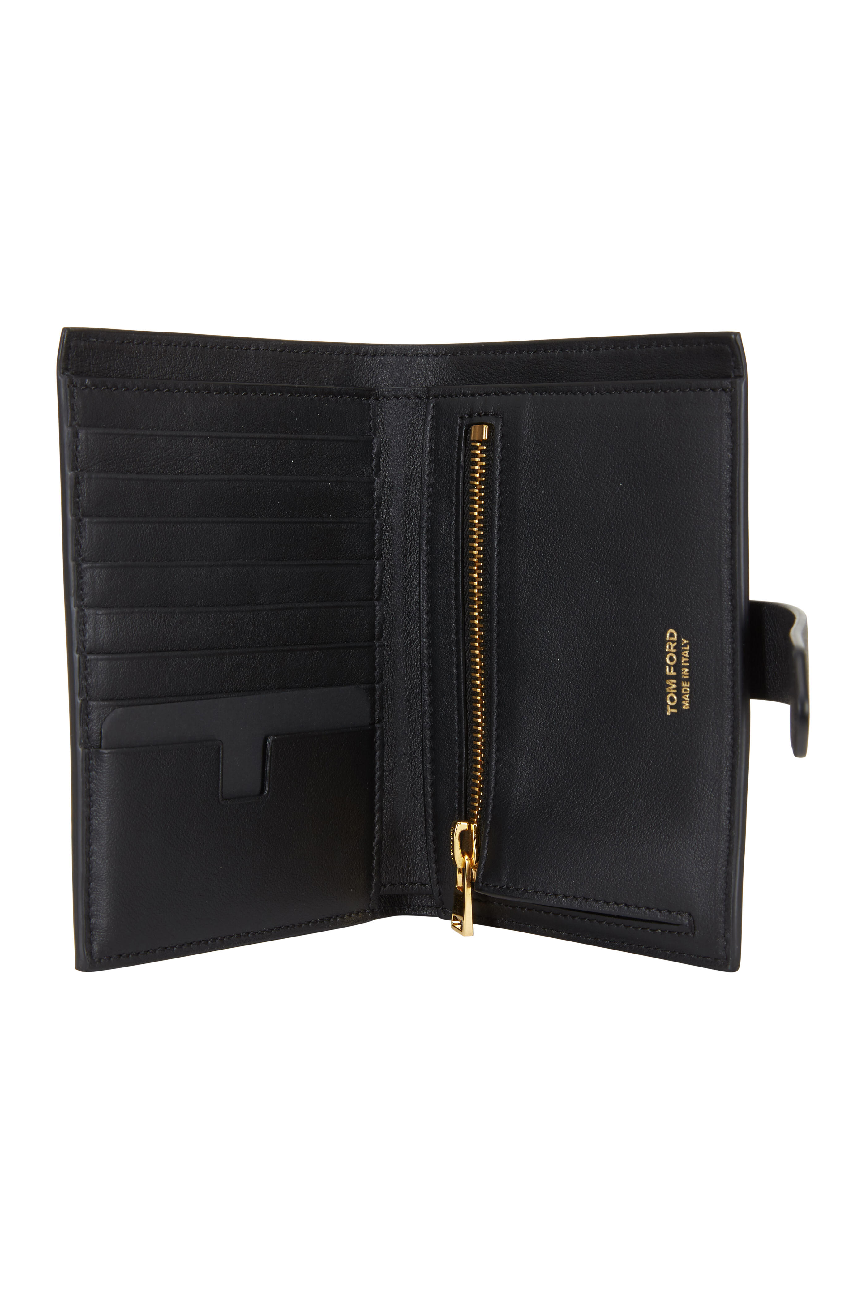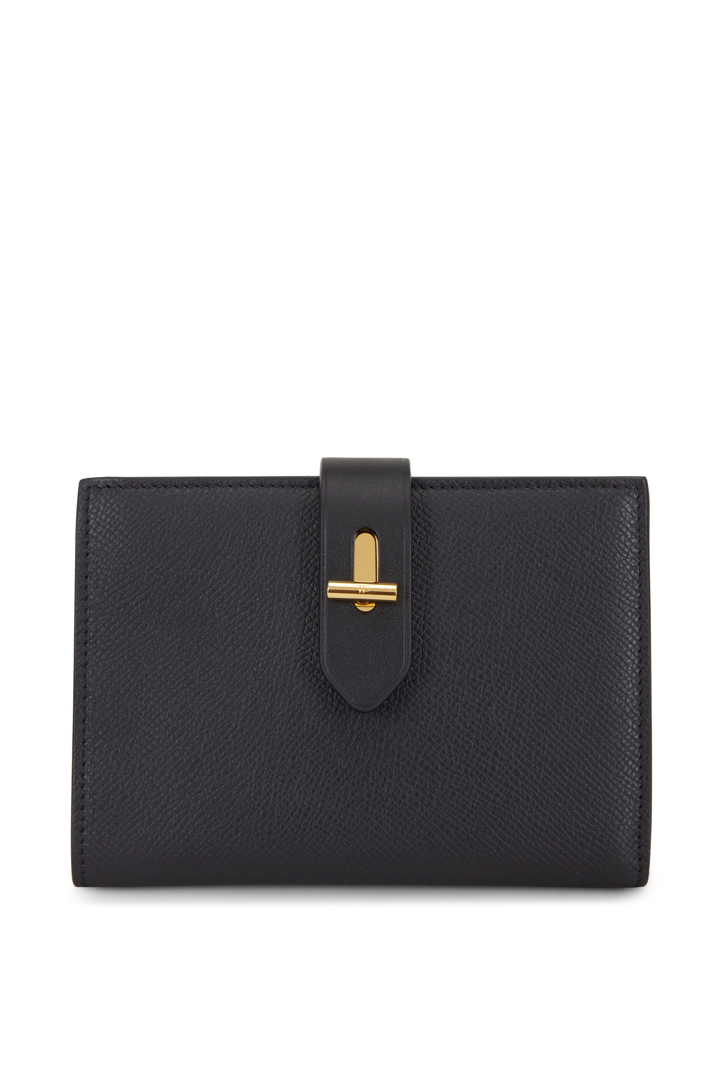 Grained calfskin leather. Fold-over, signature T turn-lock closure. Interior zip pocket, bill slot, two slit pockets, eight card slots. Lined in leather. Made in Italy. Width: 5 ½". Height: 4". Depth: 1".