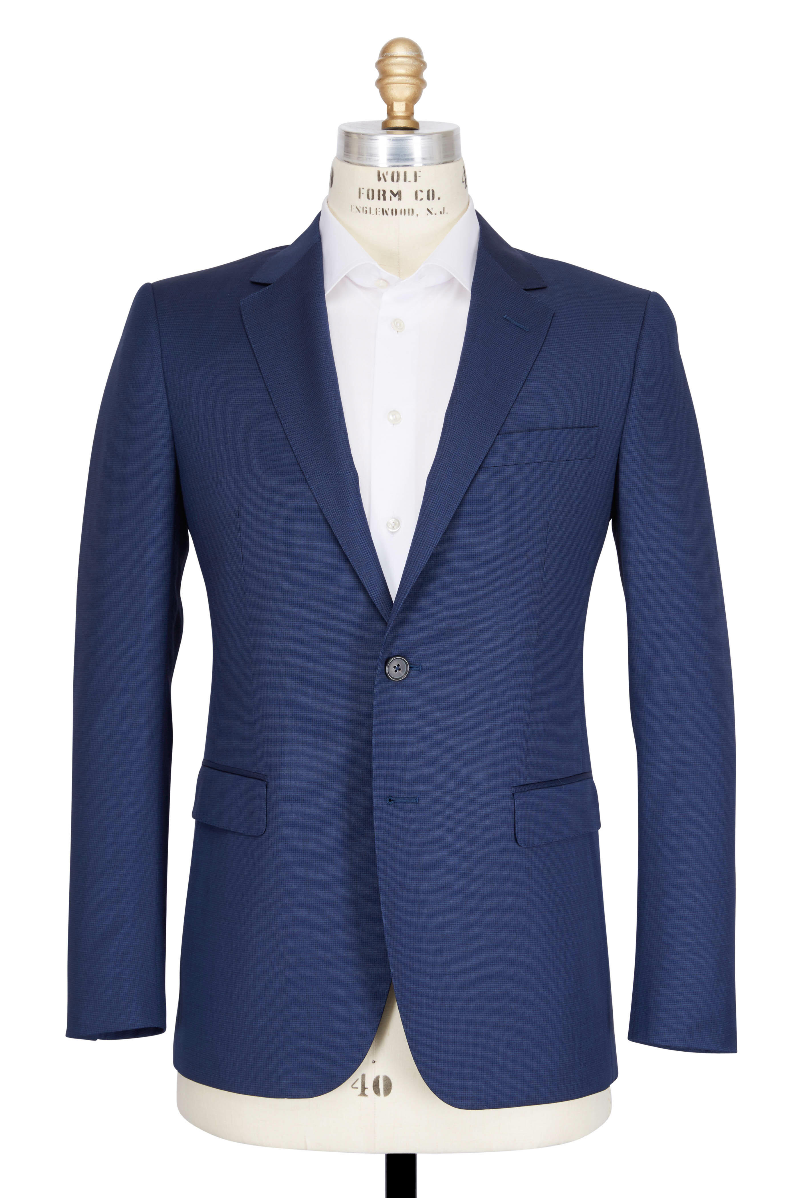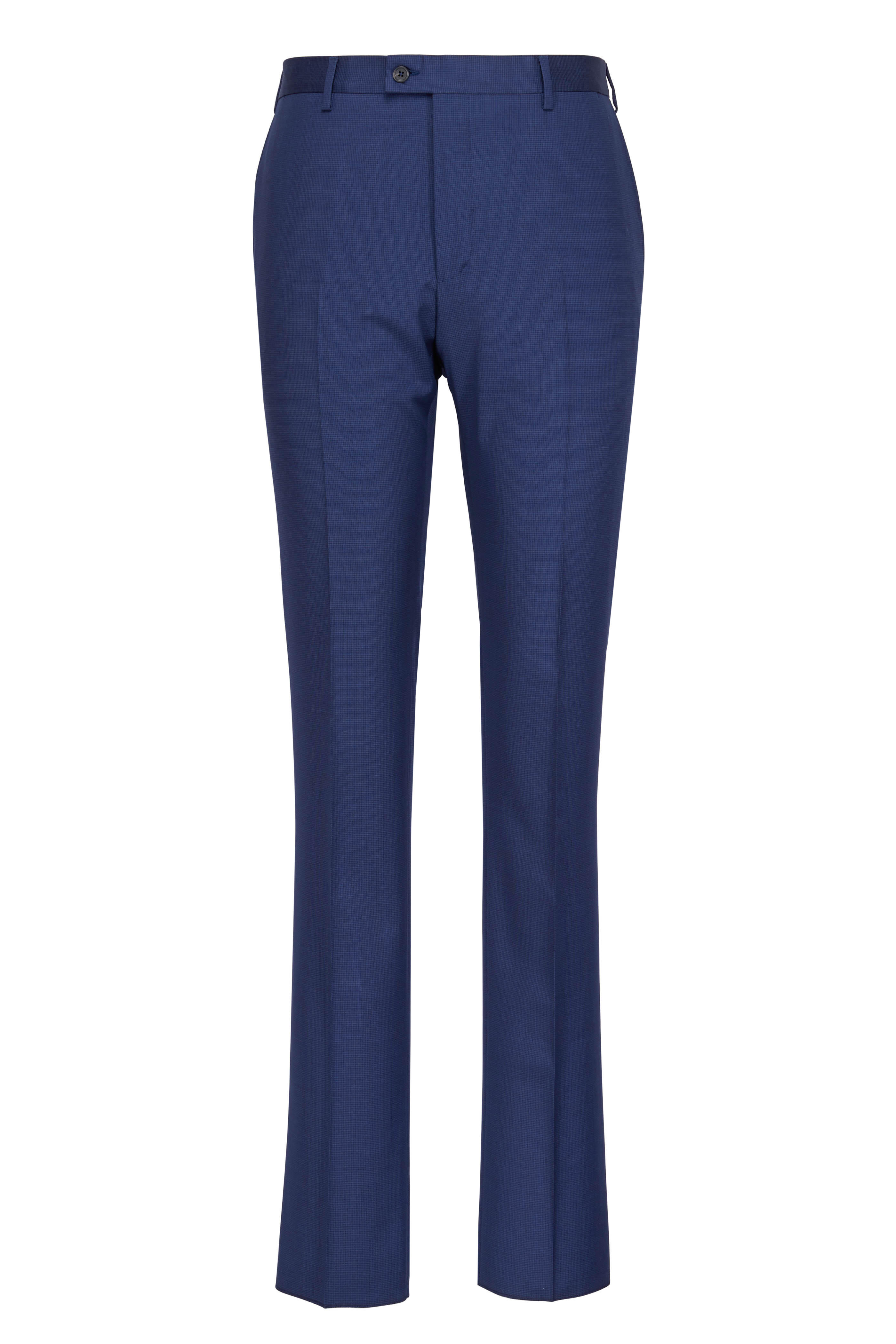 Made in Italy. Jacket: Notched lapels. Chest welt pocket, front flap pockets. Double vent. Pants: Button and zip fly closure. Four pocket style. 100% wool. Dry clean.