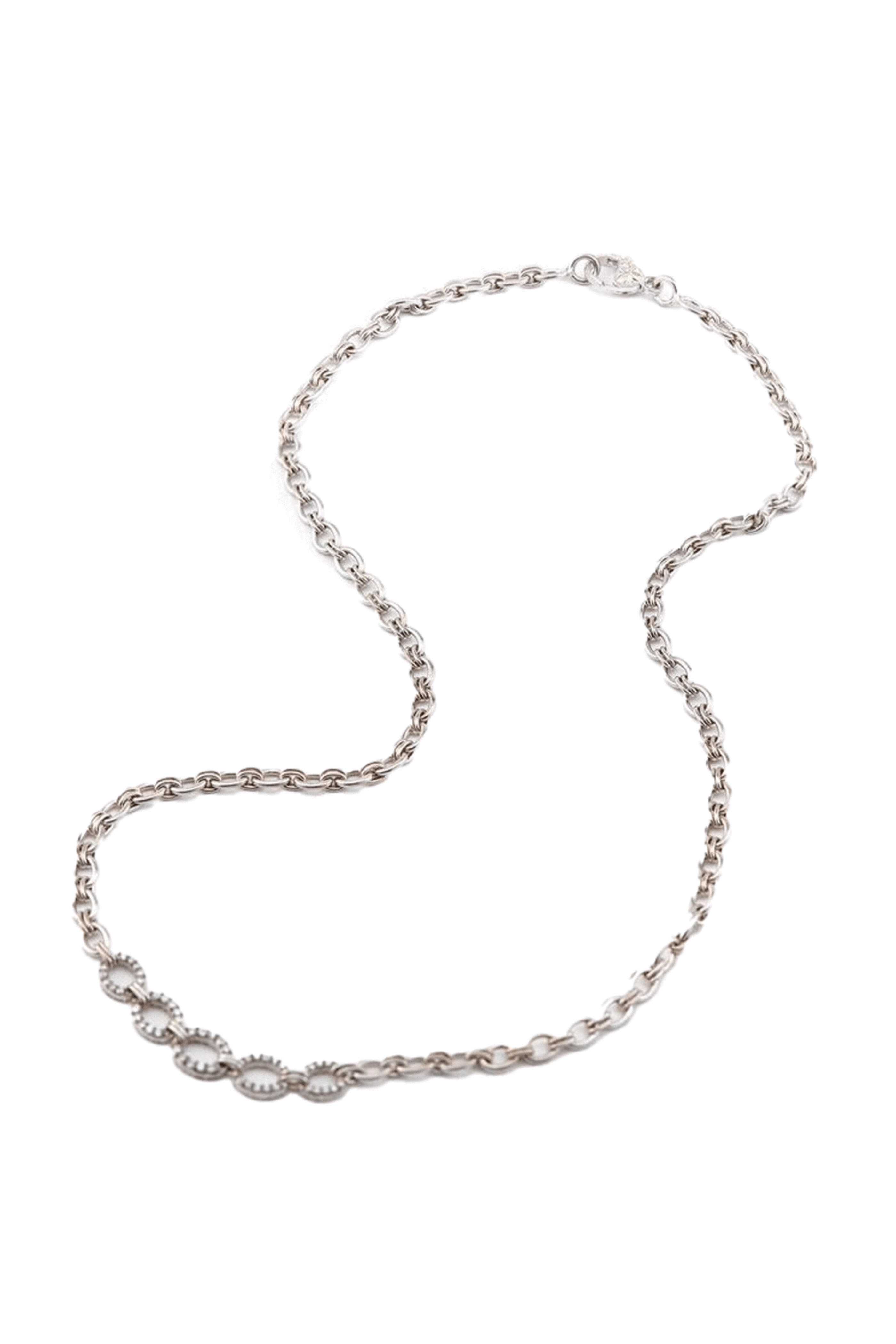 Sylva & Cie Idia Link Chain Necklace. 18k white gold. Diamond 0.85 total carat weight. Round, brilliant cut diamond. Five diamond rondel charms. Link chain. 18 L. Lobster claw clasps. Made in the USA.