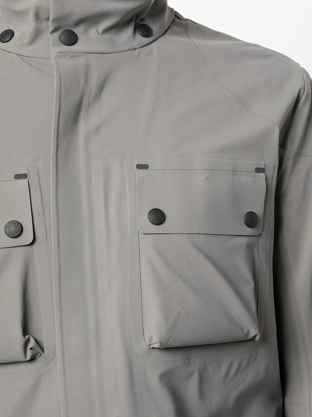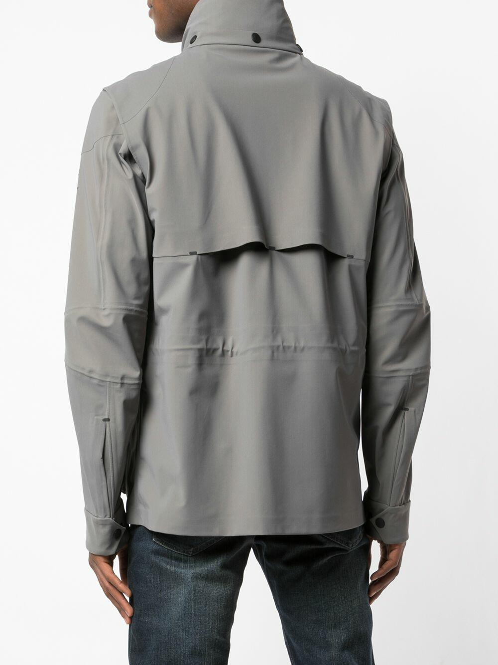 Concealed lightweight hood. Two-way front zip closure. Chest button pockets, lower button flap pockets. Imported. 72% polyamide, 19% elastane, 9% polyurethane. Machine wash.