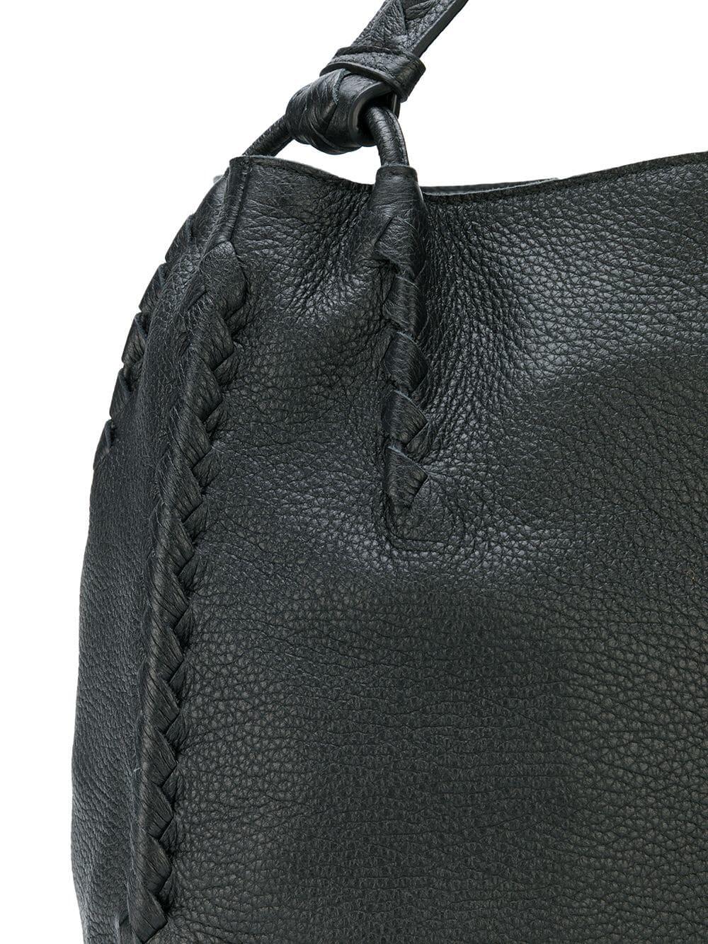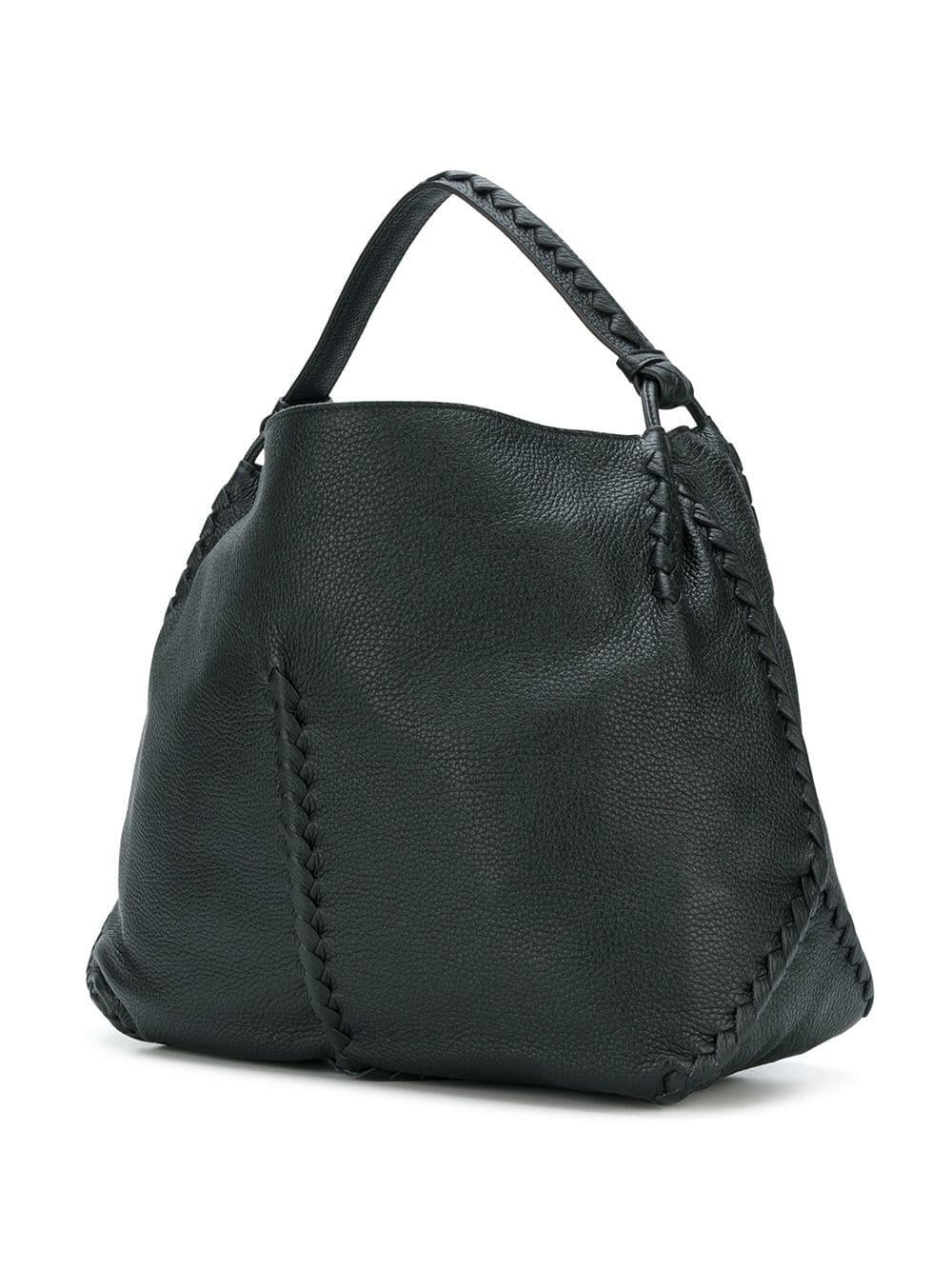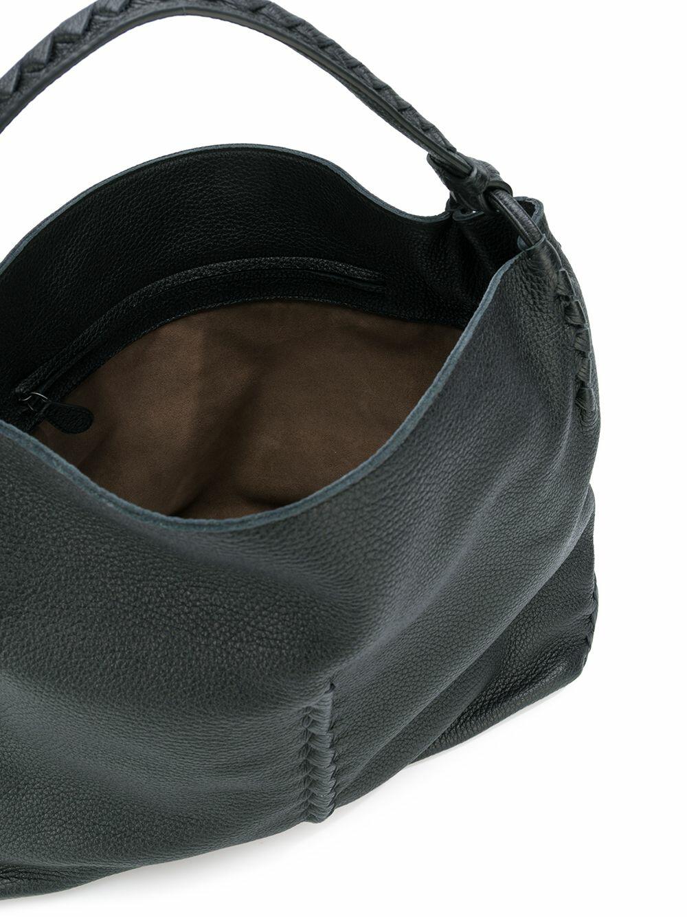 Grained cervo leather. Flat shoulder strap. Fold-over top. Signature intrecciato detail. One interior zip and one phone pocket. Lined in suede. Made in Italy. Width: 16". Height: 12". Depth: 7". Handle drop: 7".