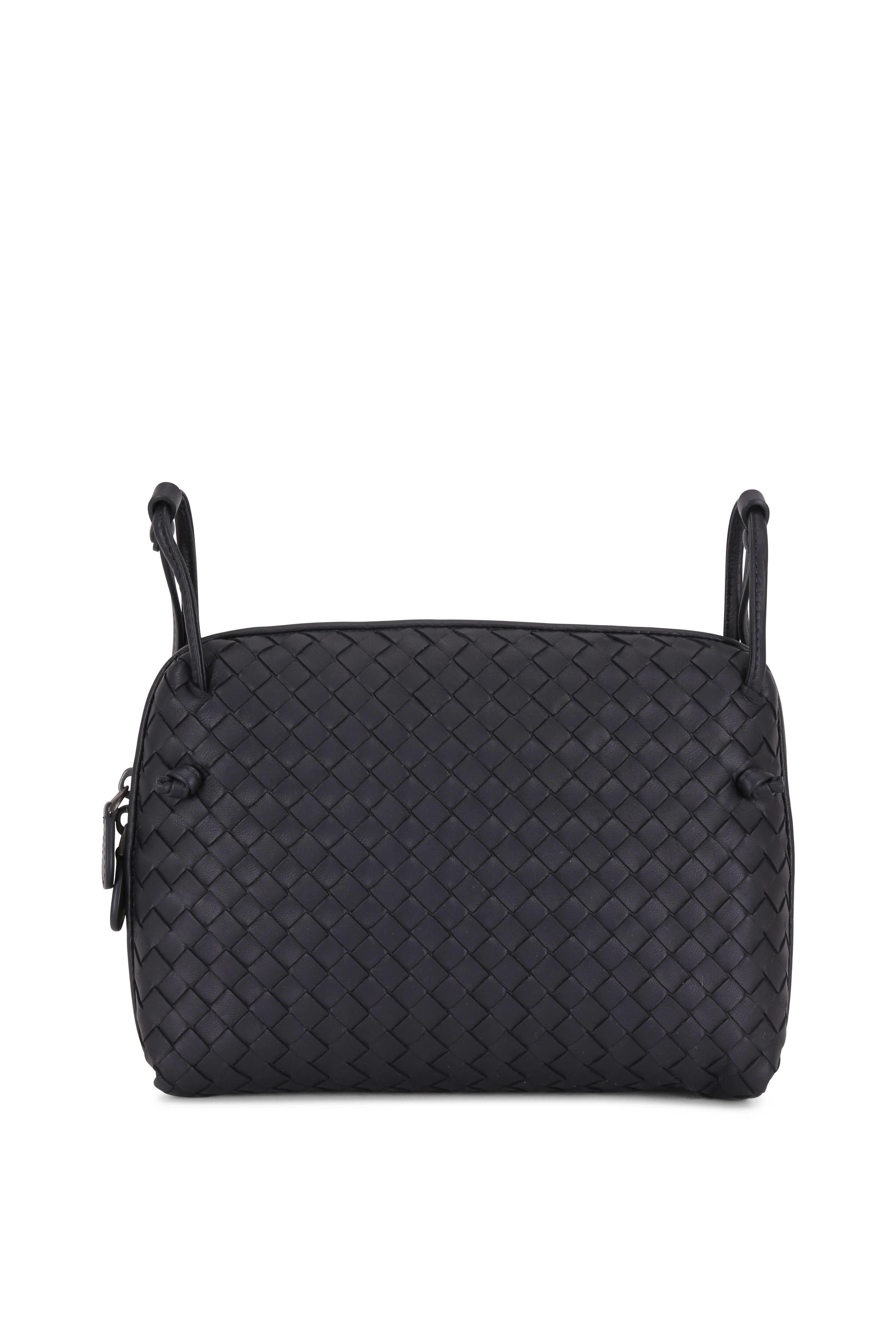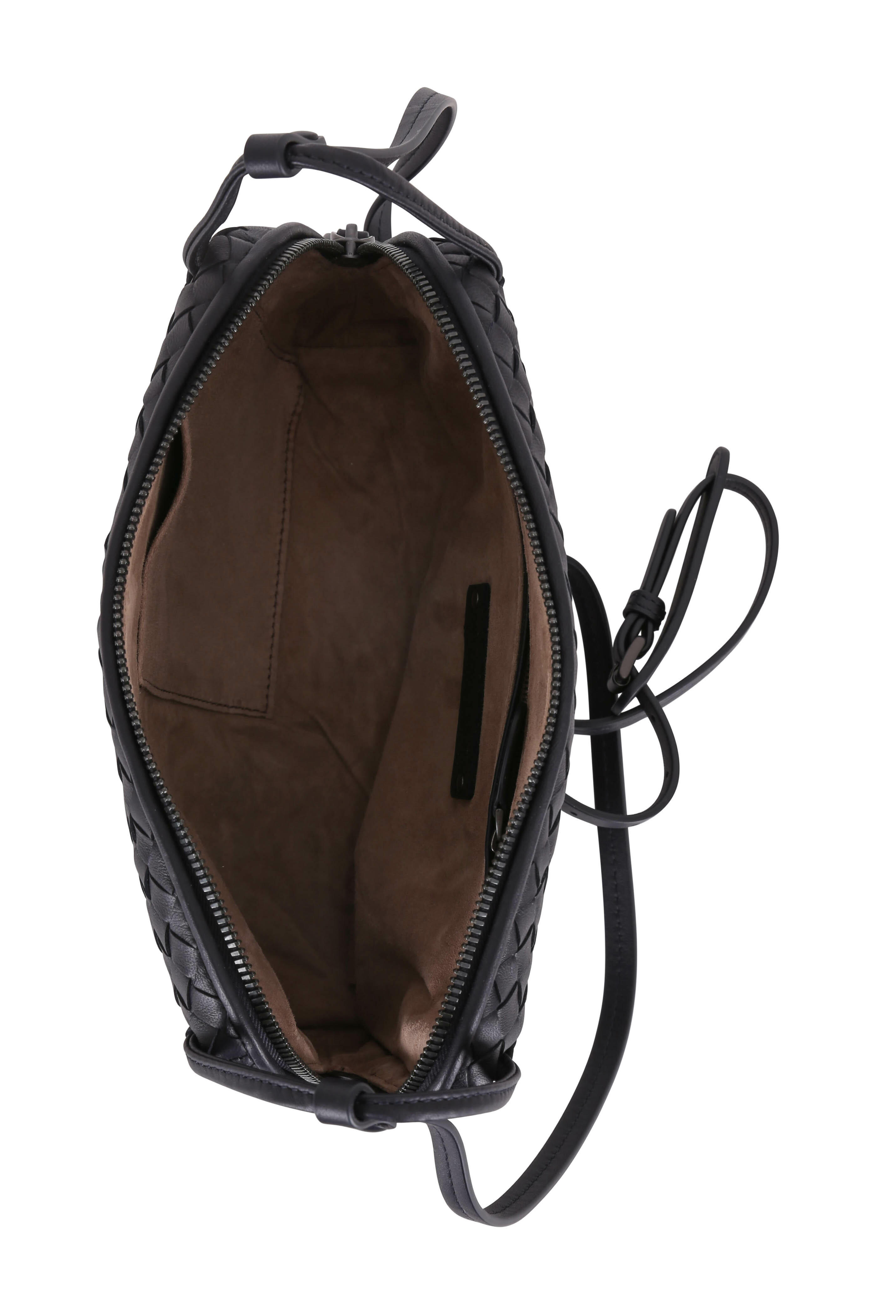 Woven lambskin leather. Adjustable shoulder strap. Top two-way zip closure. One interior zip and one open pocket. Lined in suede. Made in Italy. Width: 9". Height: 8". Depth: 2". Strap drop: 24".