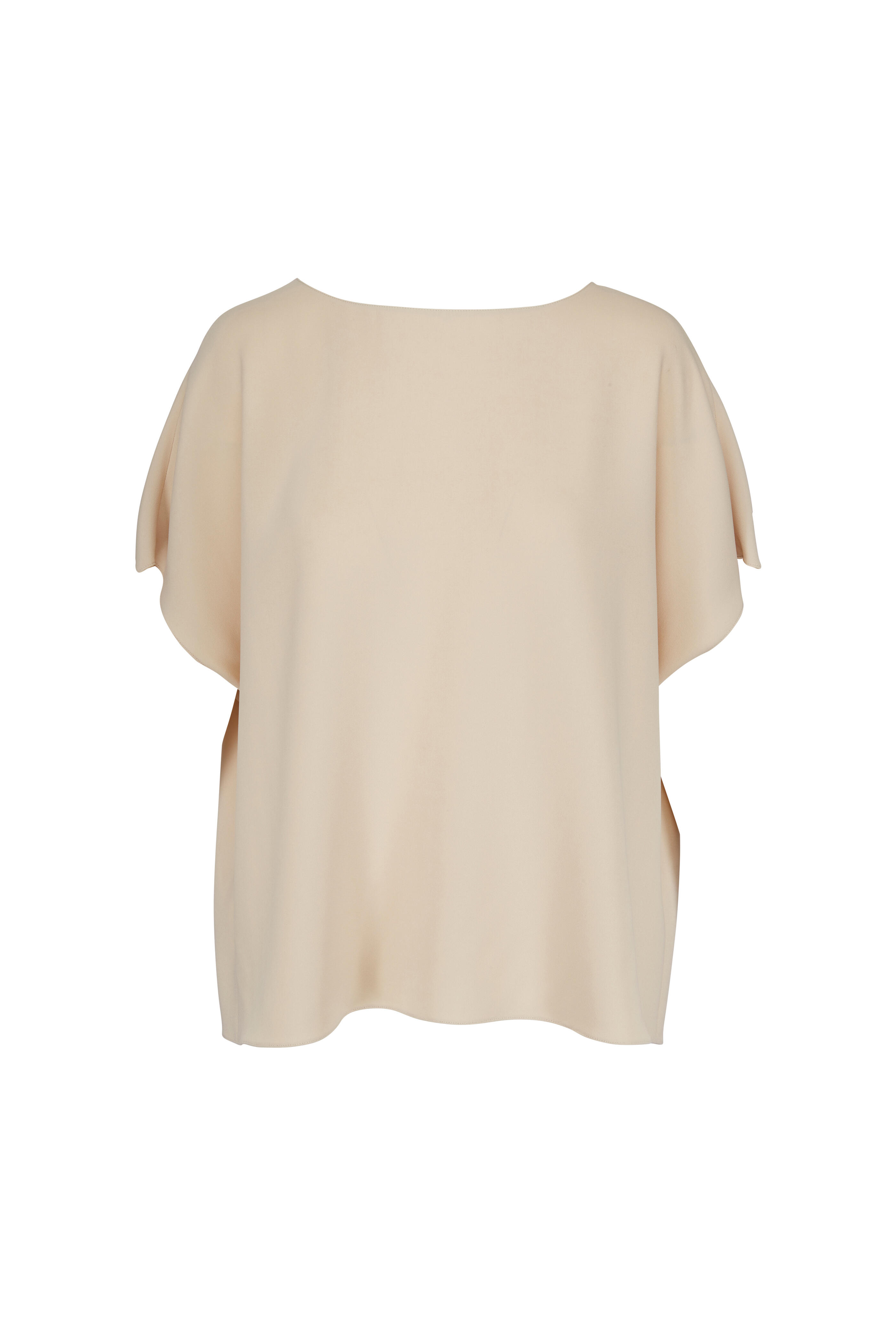 Viscose/spandex. Crew neckline. Short, dolman sleeves. Made in the USA. Relaxed fit. Dry clean.