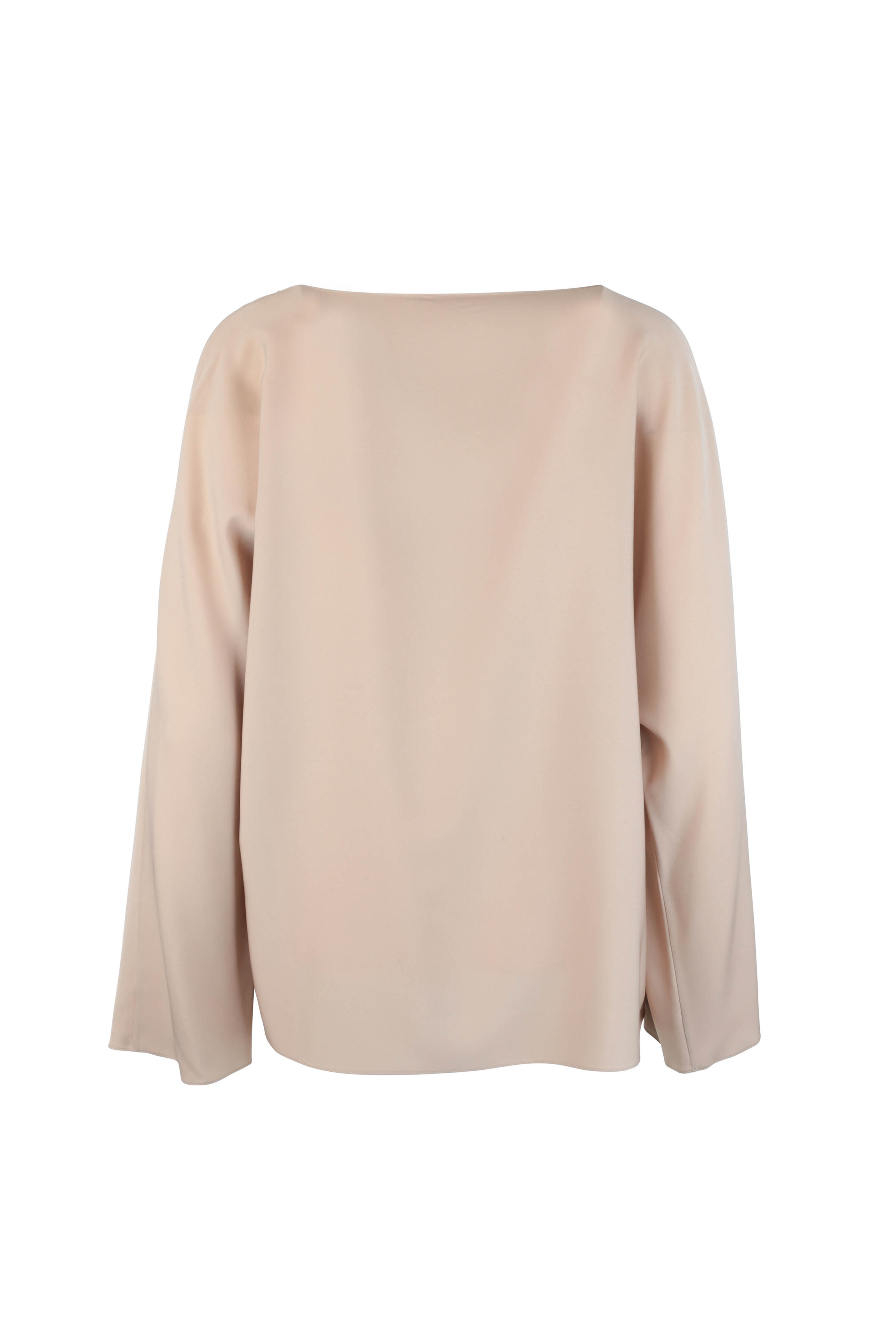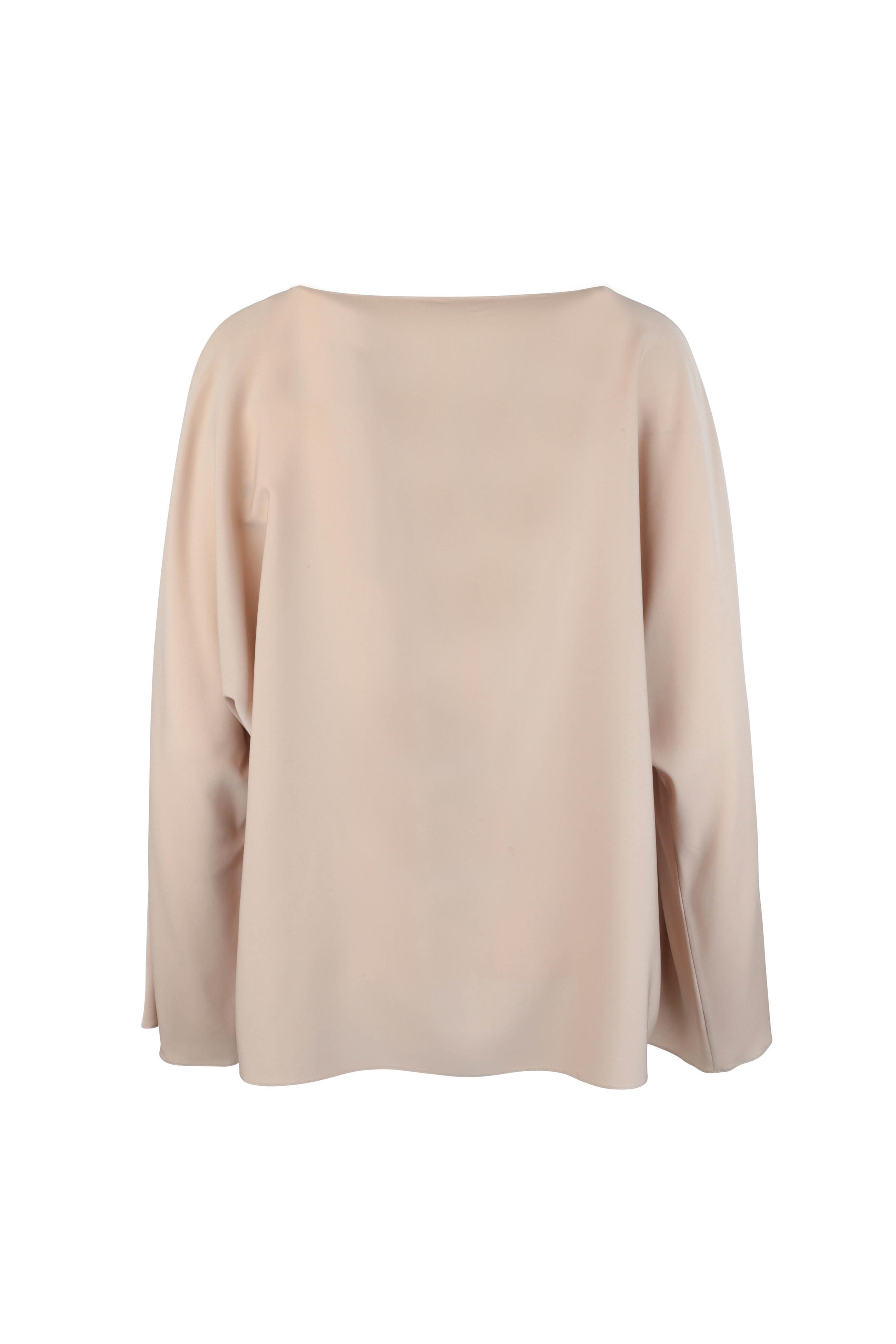 Bateau neckline. Slip over style. Long bell sleeves. Made in the USA. 93% silk, 7% elastane. Dry clean.