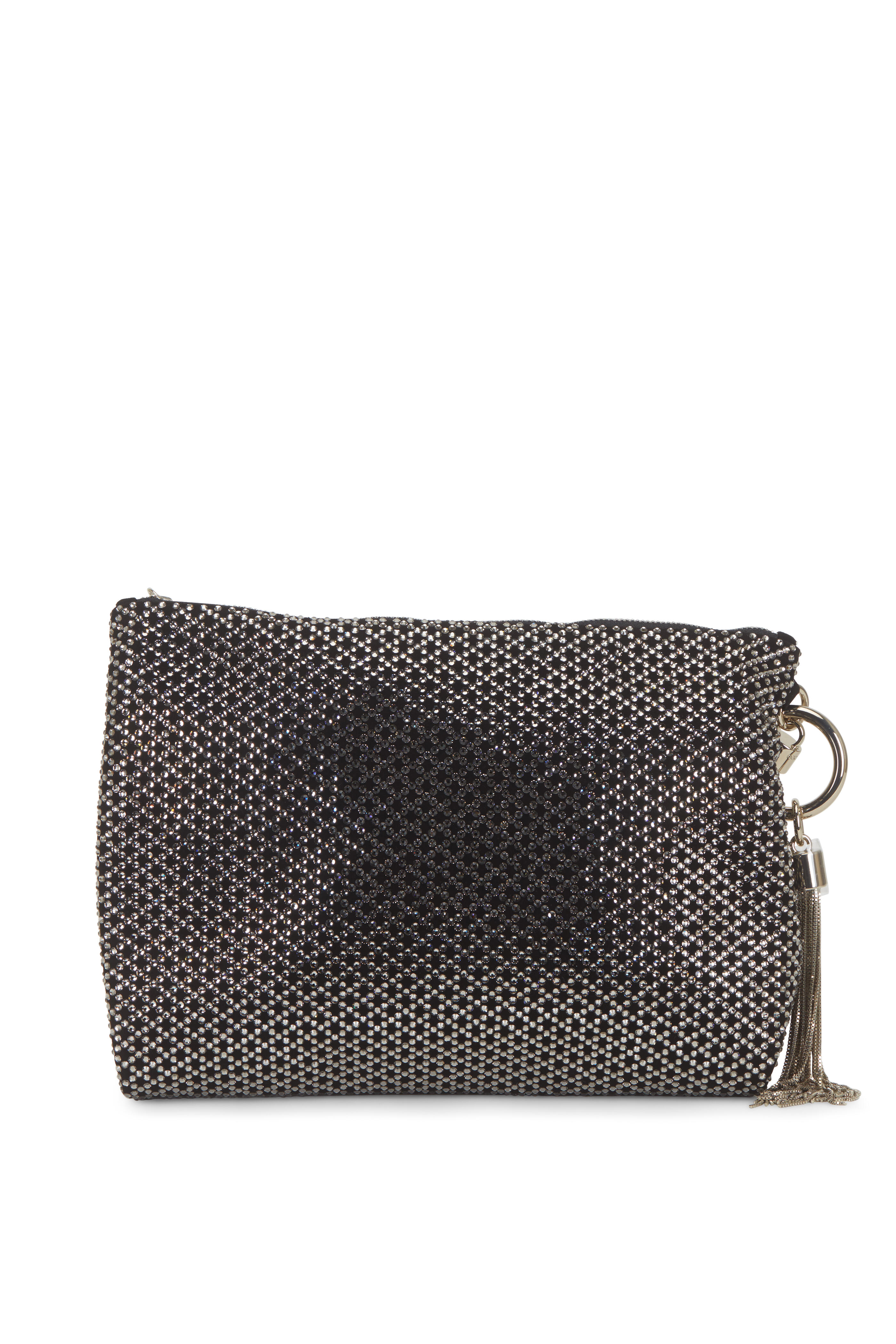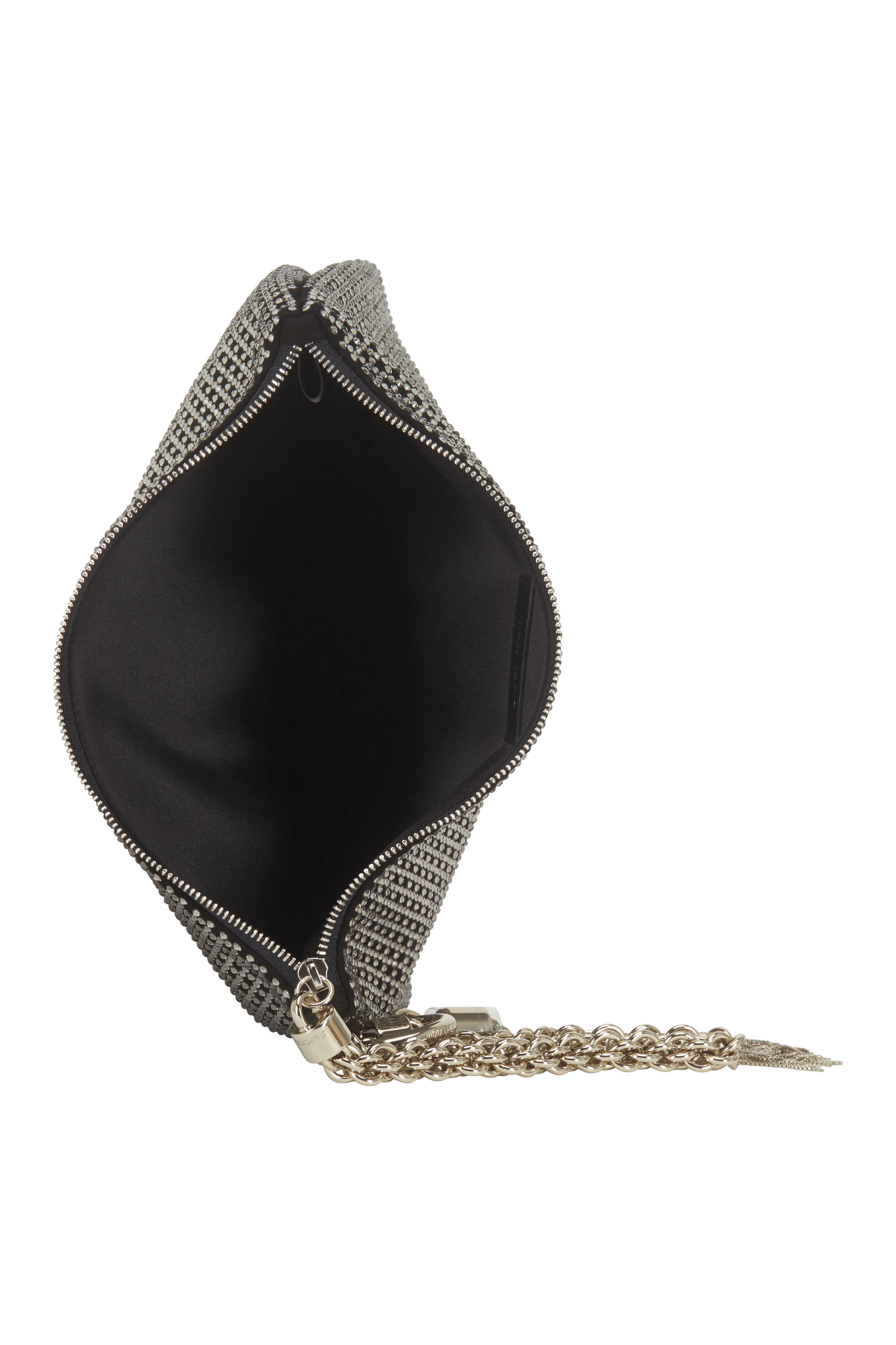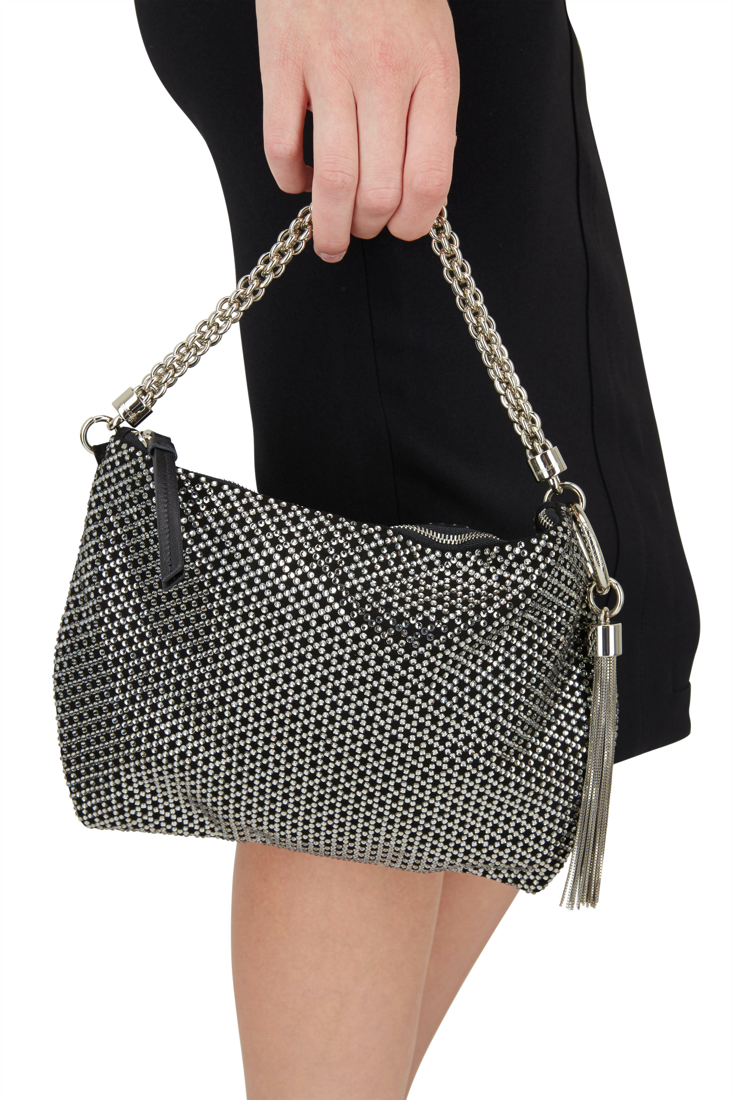 Nappa suede. Gunmetal chain strap. Top zip closure. Tassle detail at side. Diamond crystal embellishment. Lined in satin. Made in Italy. Width: 10". Height: 8". Depth: 2". Strap drop: 5".