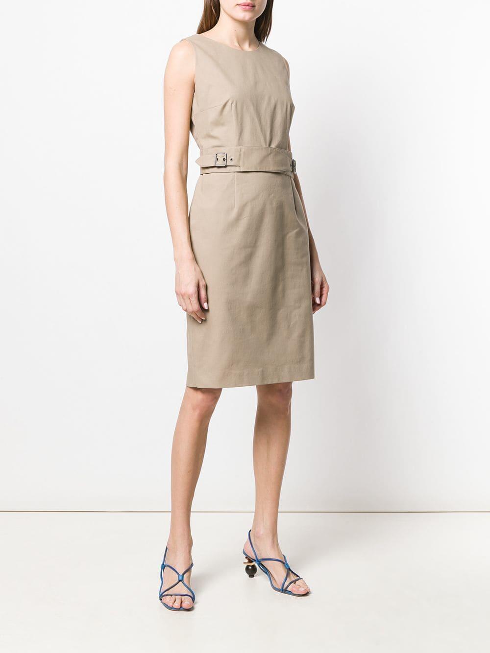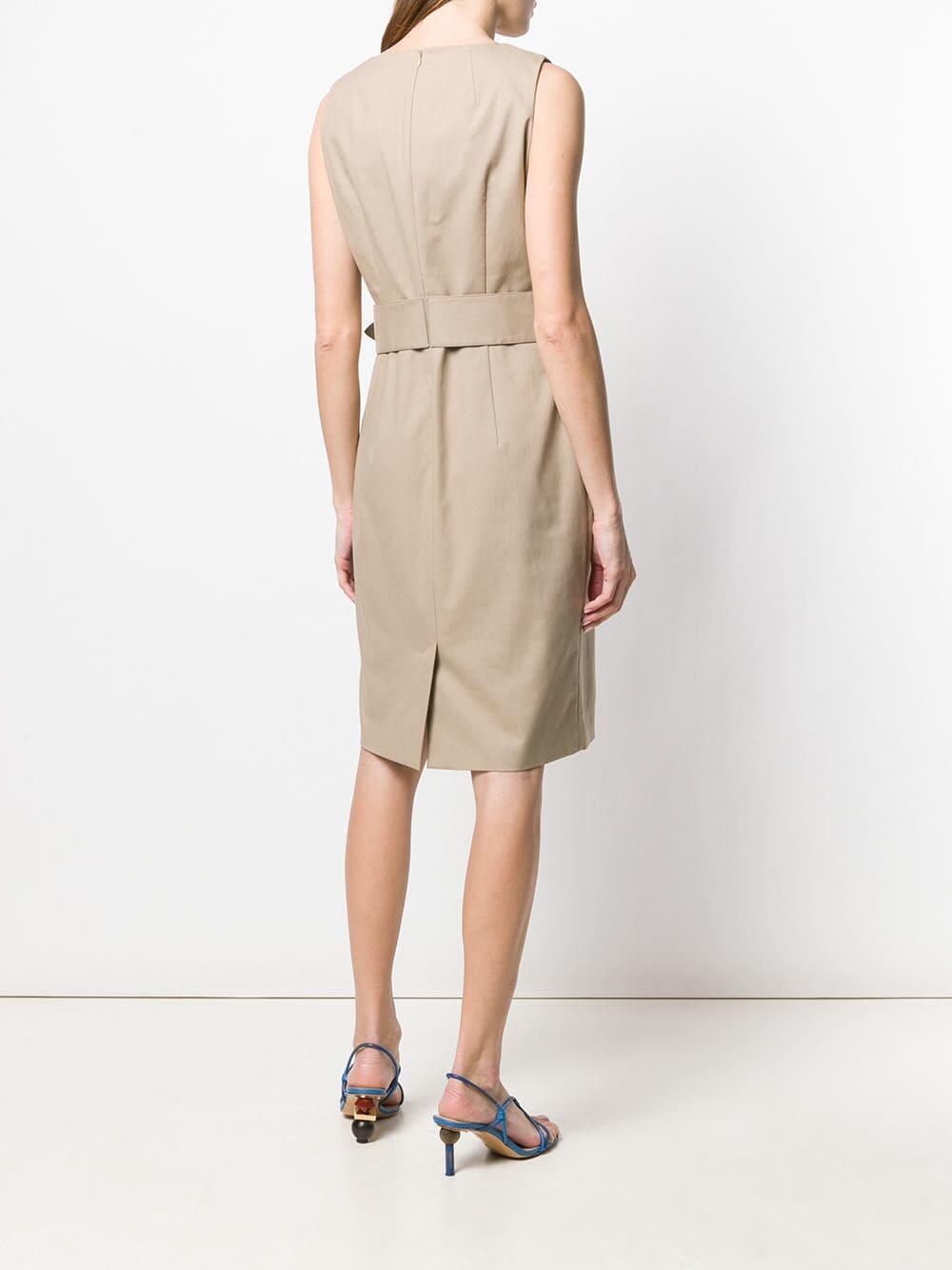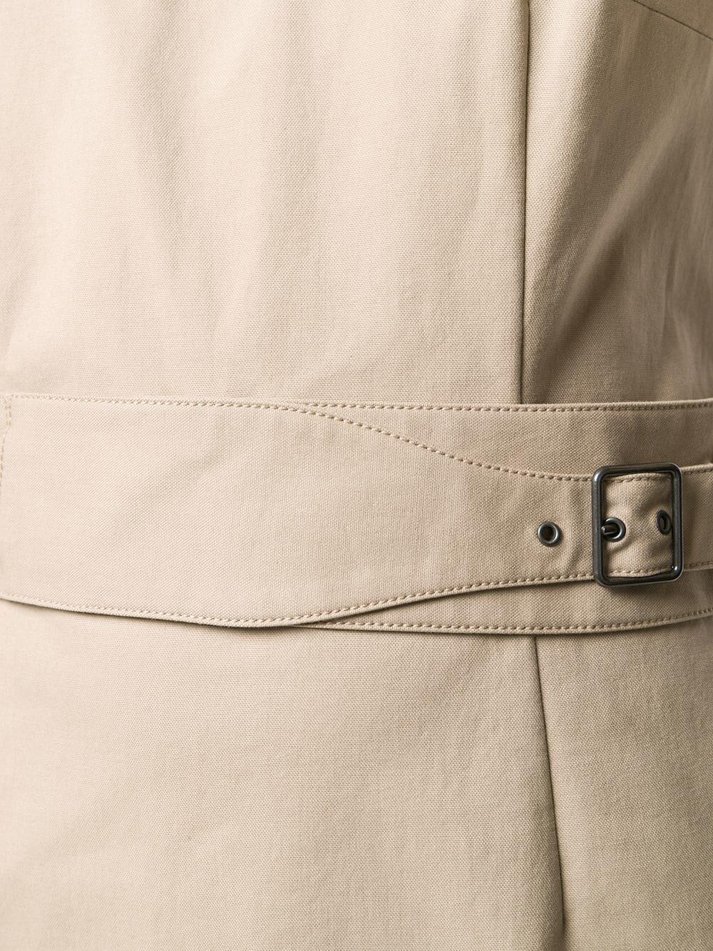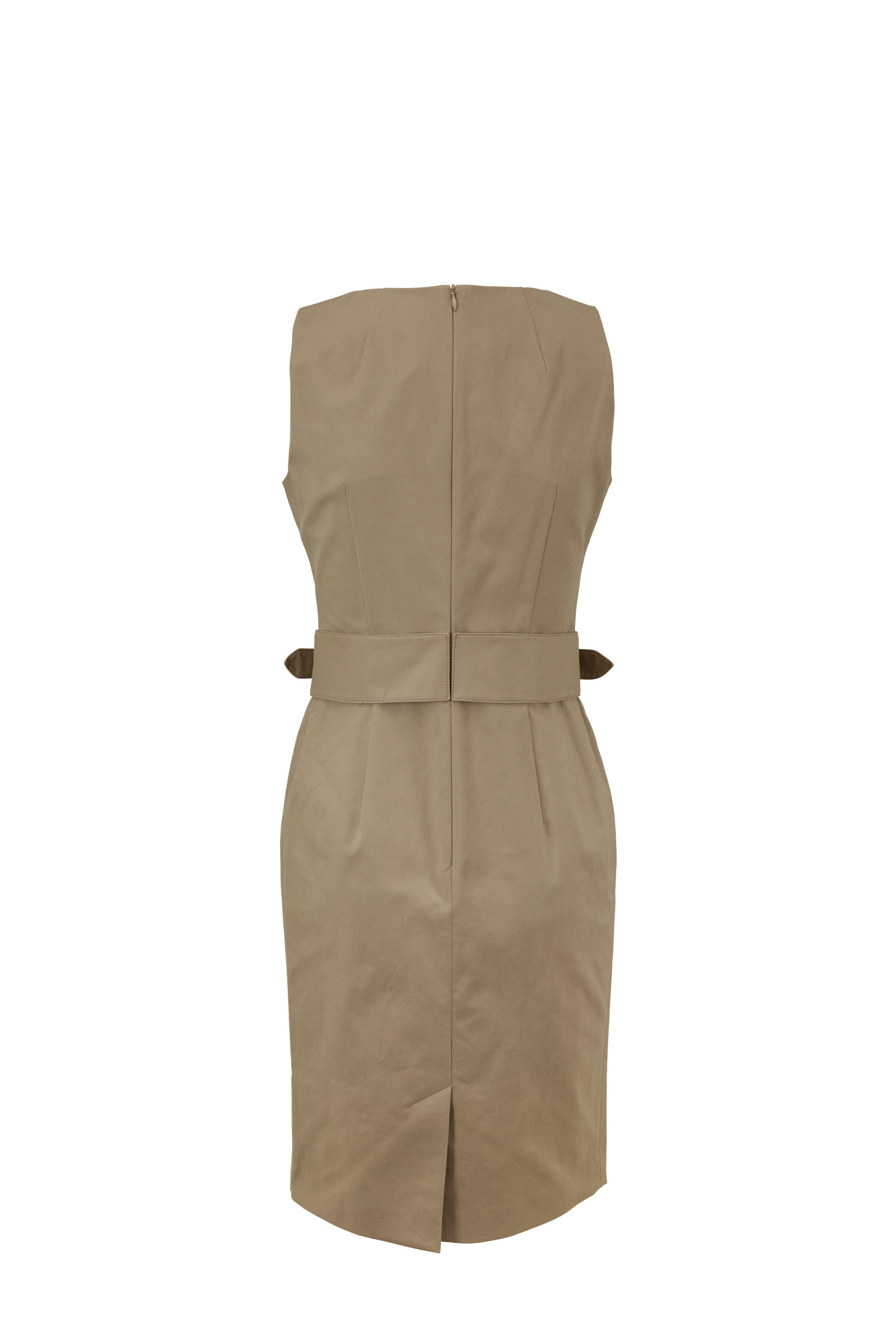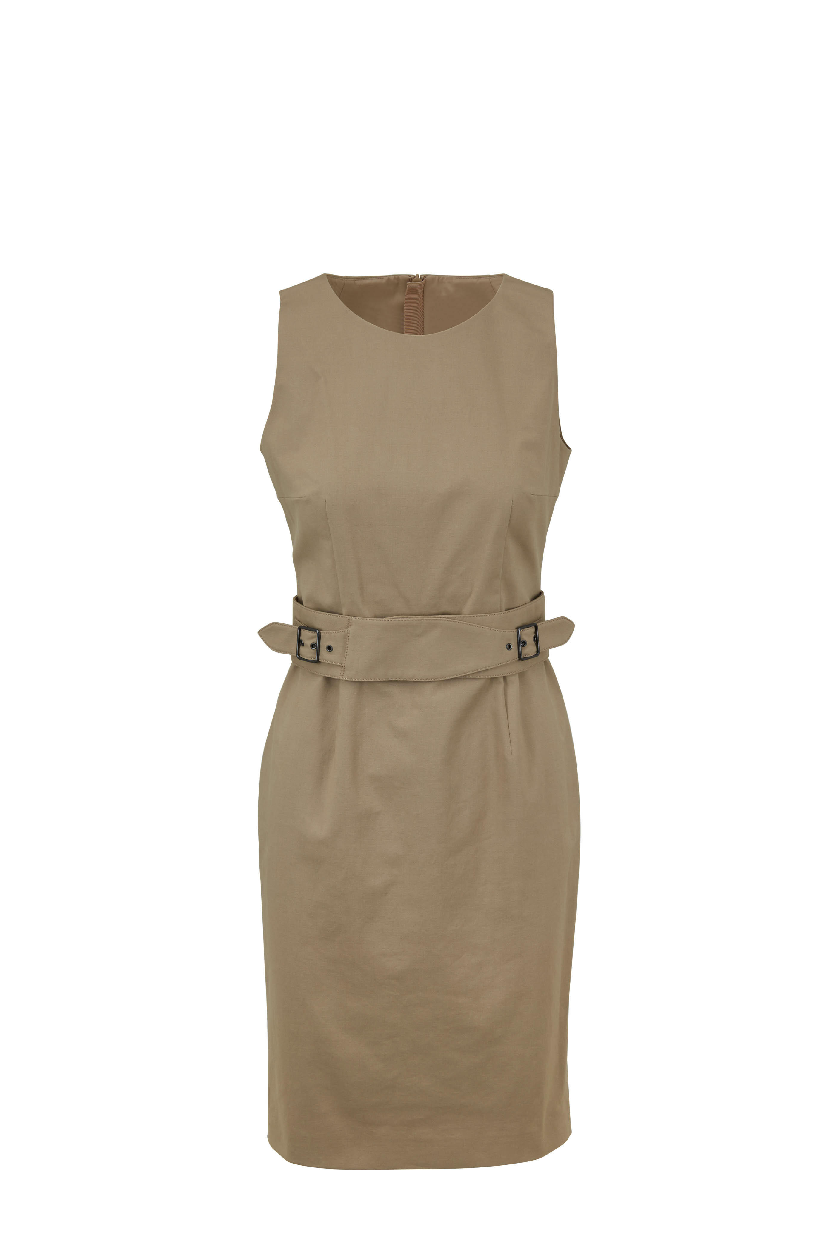 Round neckline. Concealed back zip closure; attached double buckle belt. Back vent. Imported. 38½" shoulder to hem. 97% cotton, 3% elastane. Dry clean.