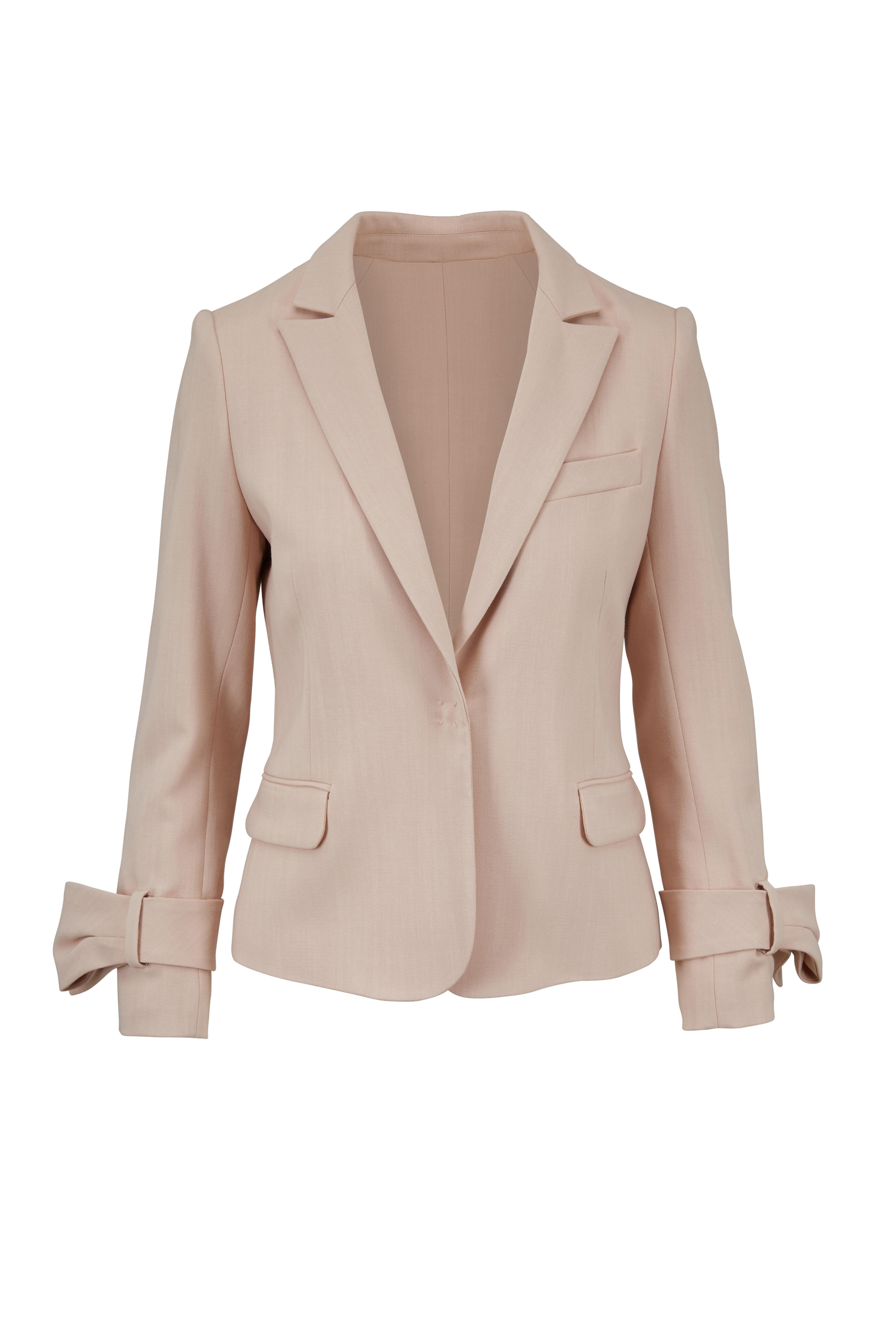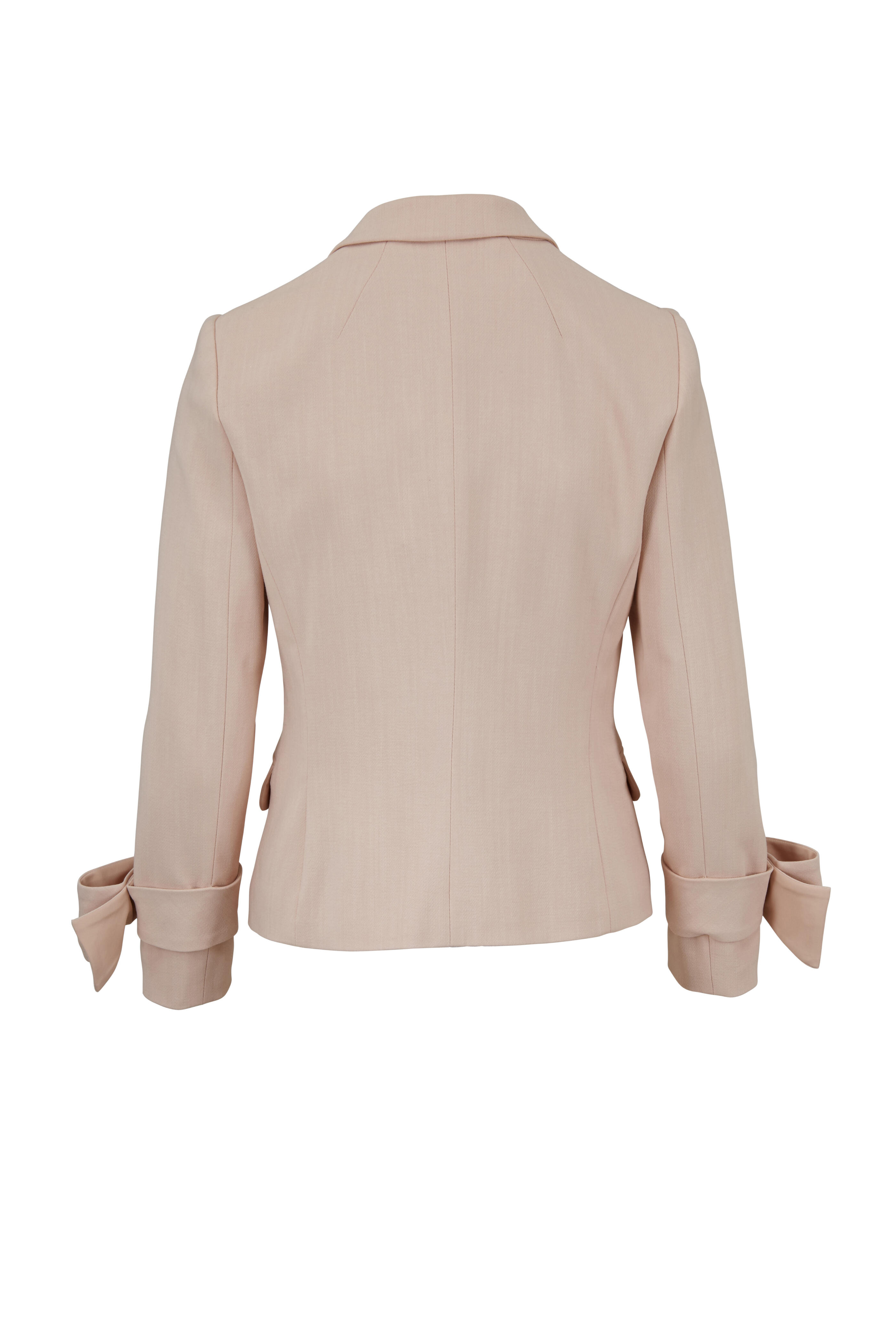 Peak lapels. Concealed front snap closure. Lower flap pockets; chest welt pocket. Bow detail cuffs. Imported. 90% viscose, 8% wool, 2% elastane. Dry clean.