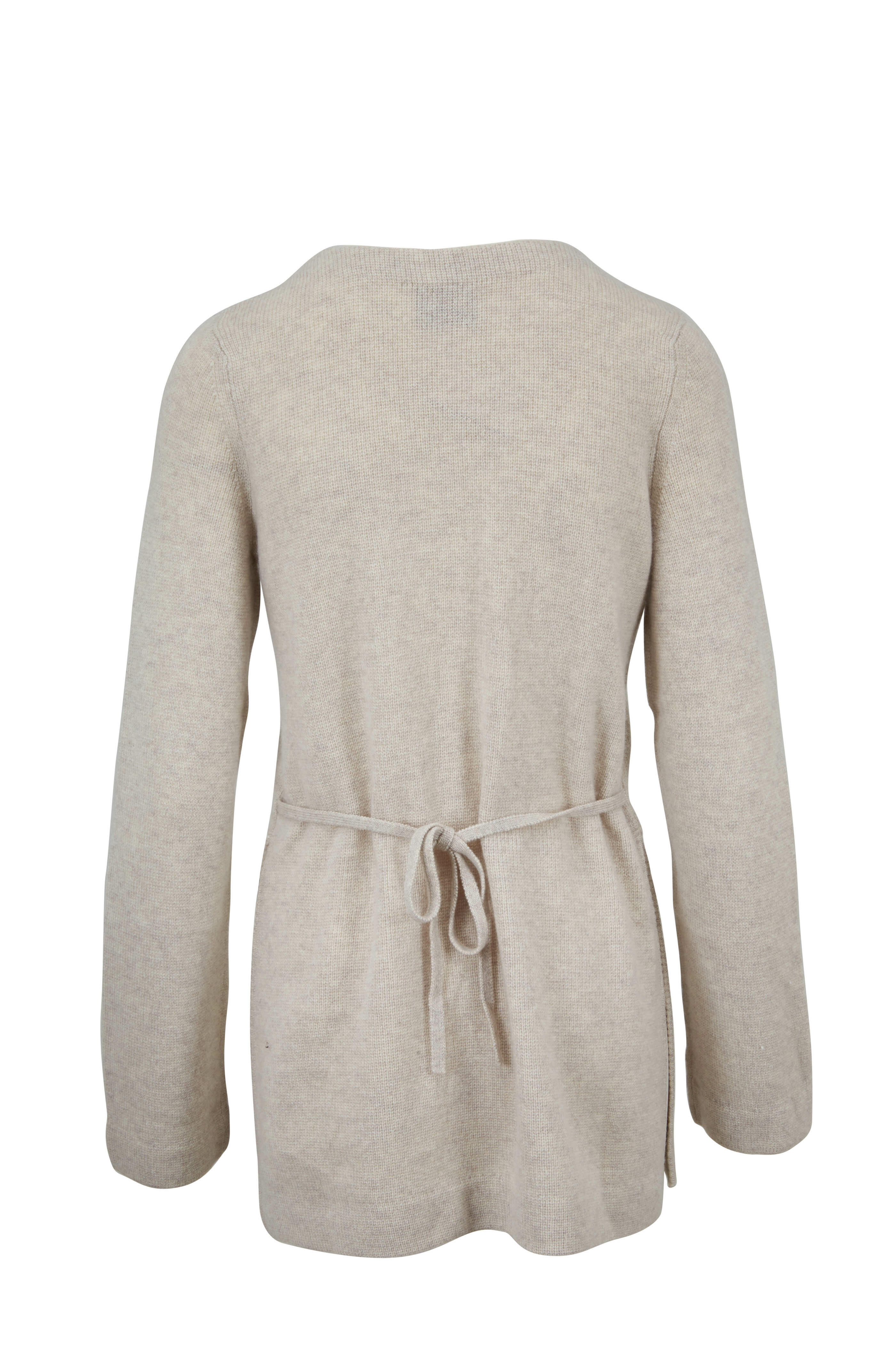 Round neckline. Vented hem; self belt. Imported. 100% cashmere. Hand wash.