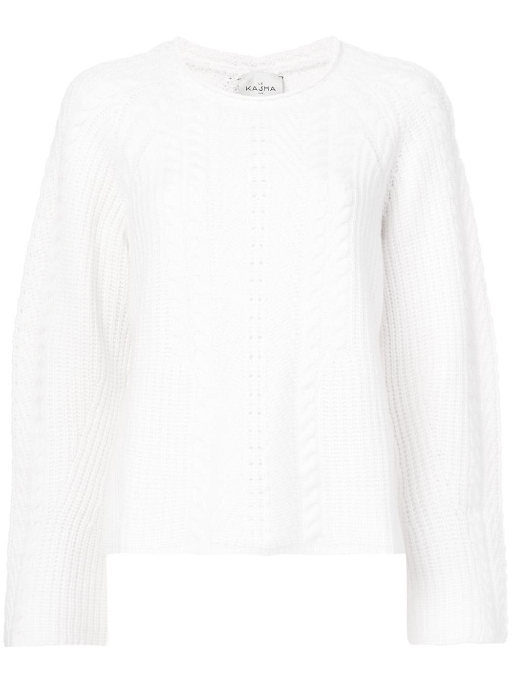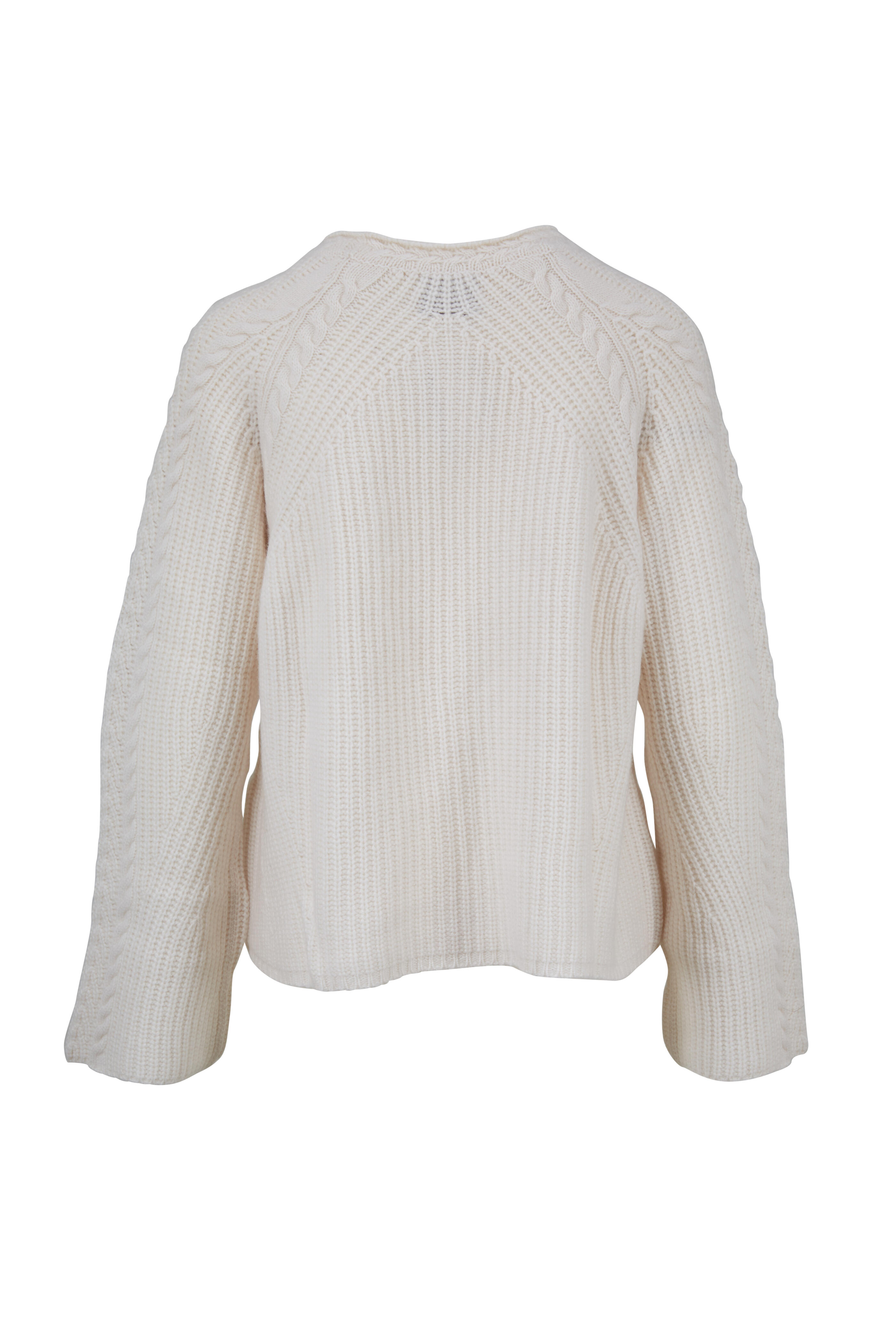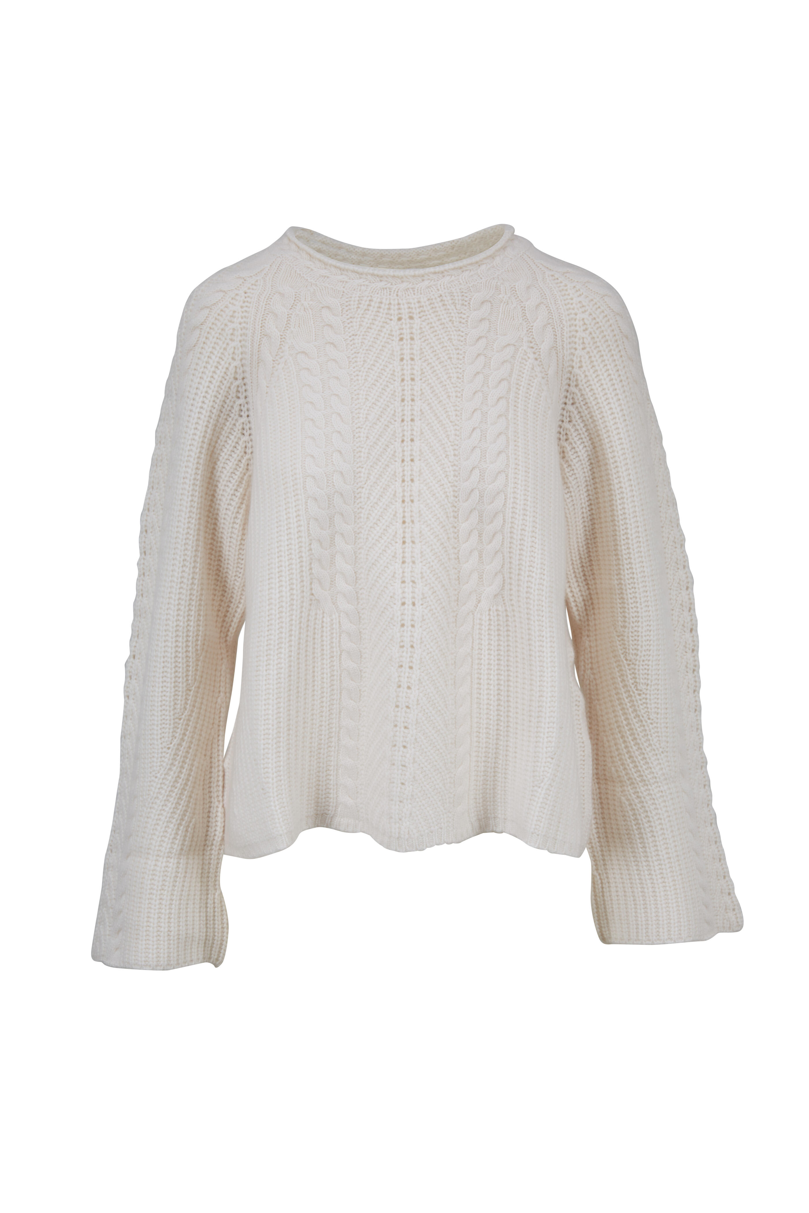 Round neckline. Long bell sleeves. Imported. 100% cashmere. Hand wash.