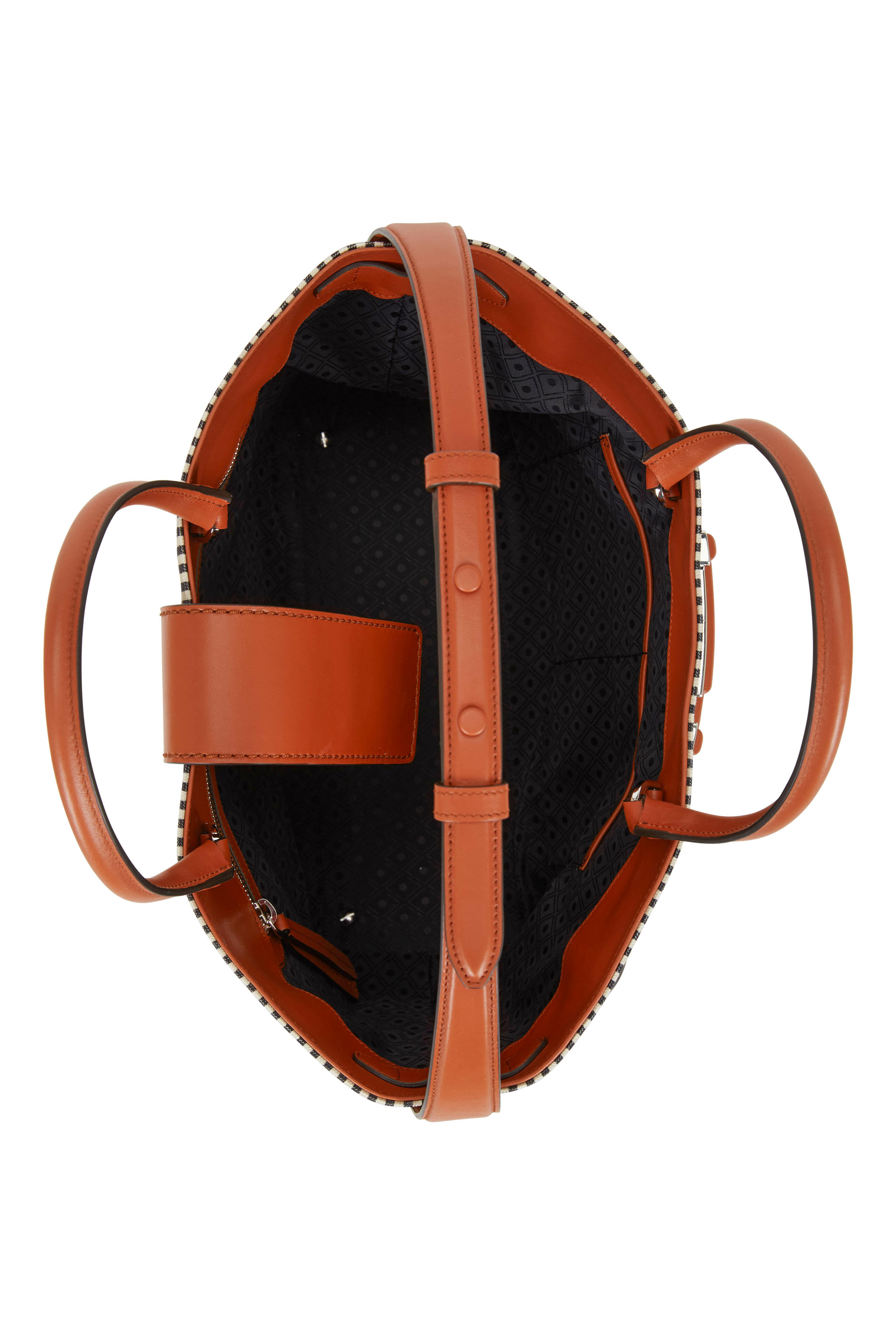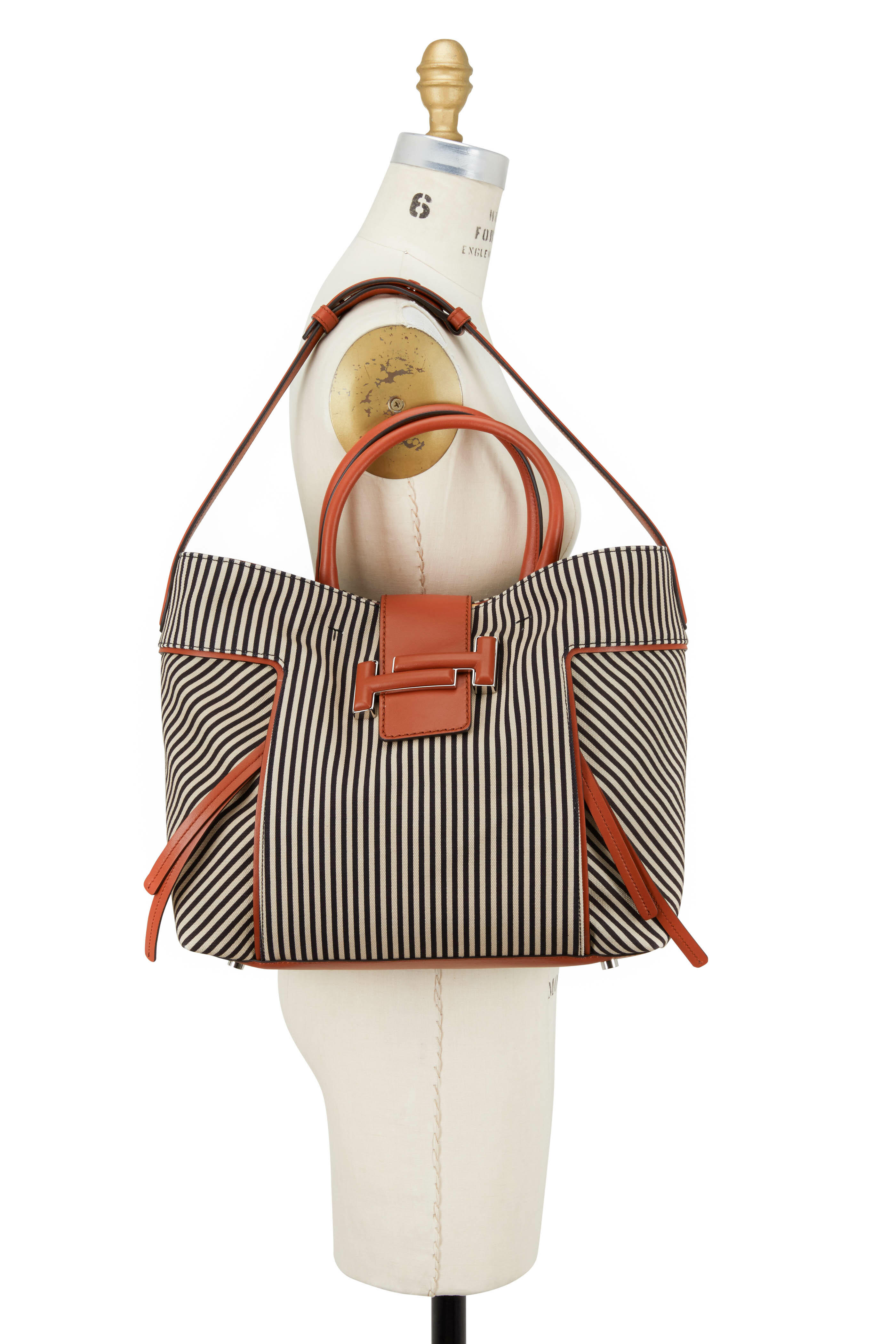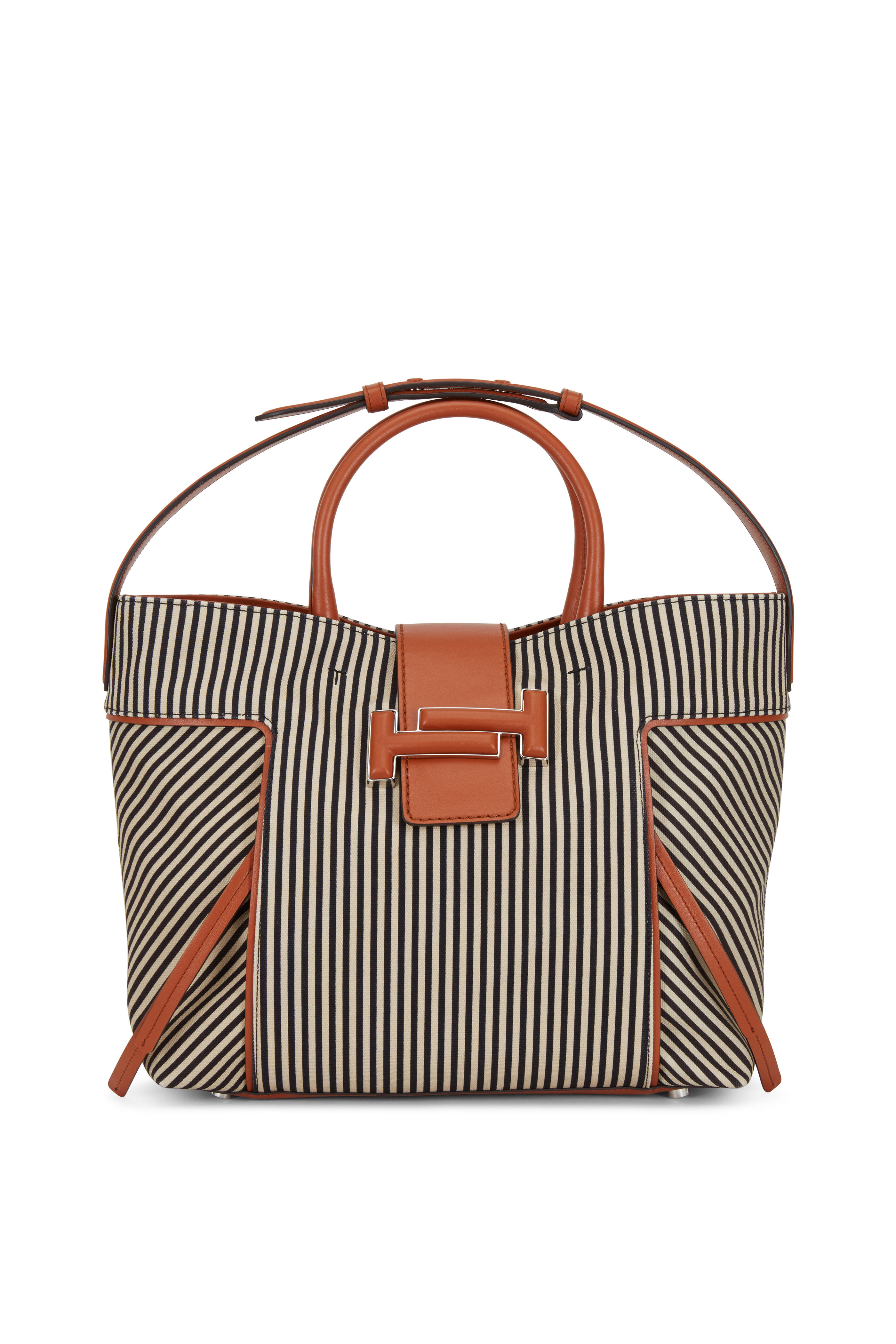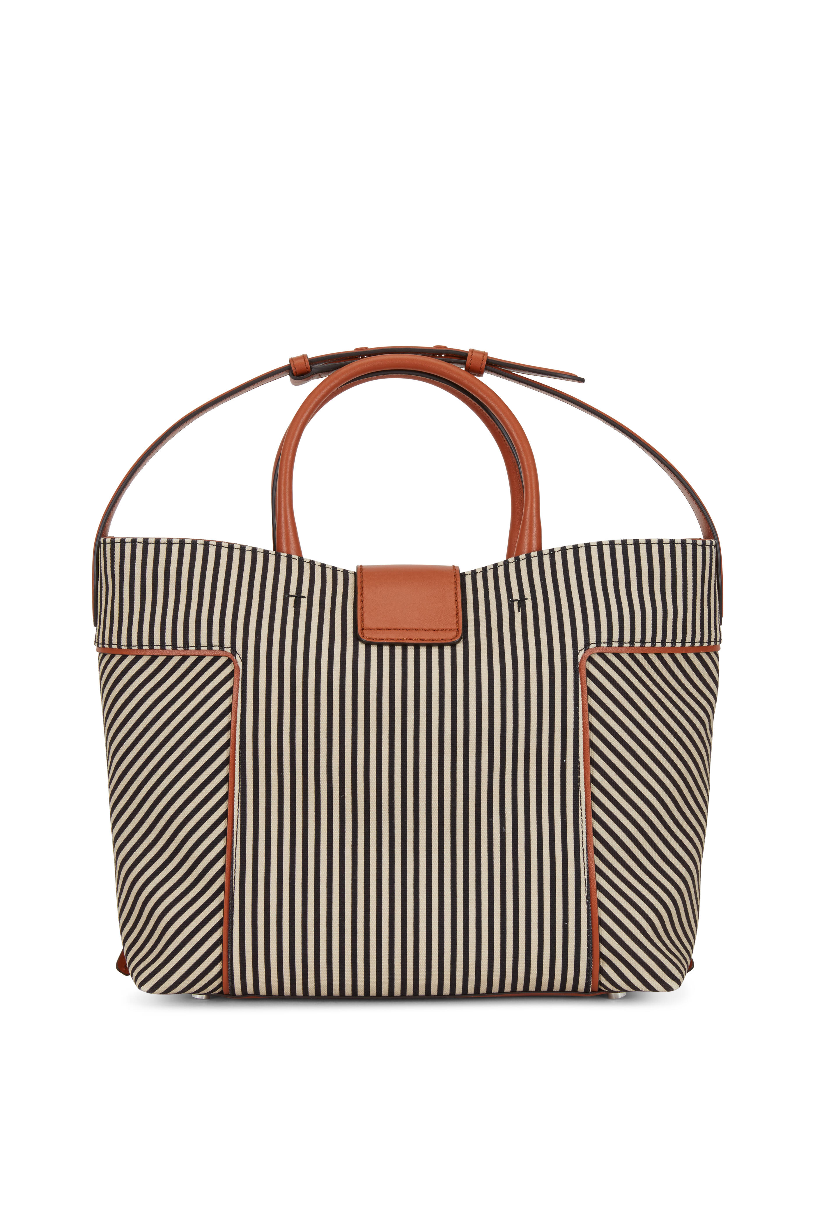 Canvas with leather trim. Dual rolled top handles. Adjustable shoulder strap. Pull-through tab closure; logo detail. Exterior front zip pocket. One interior zip and two open pockets. Lined in canvas. Protective metal feet. Made in Italy. Width: 13". Height: 11". Depth: 5". Handle drop: 5". Adjustable strap drop: 8".