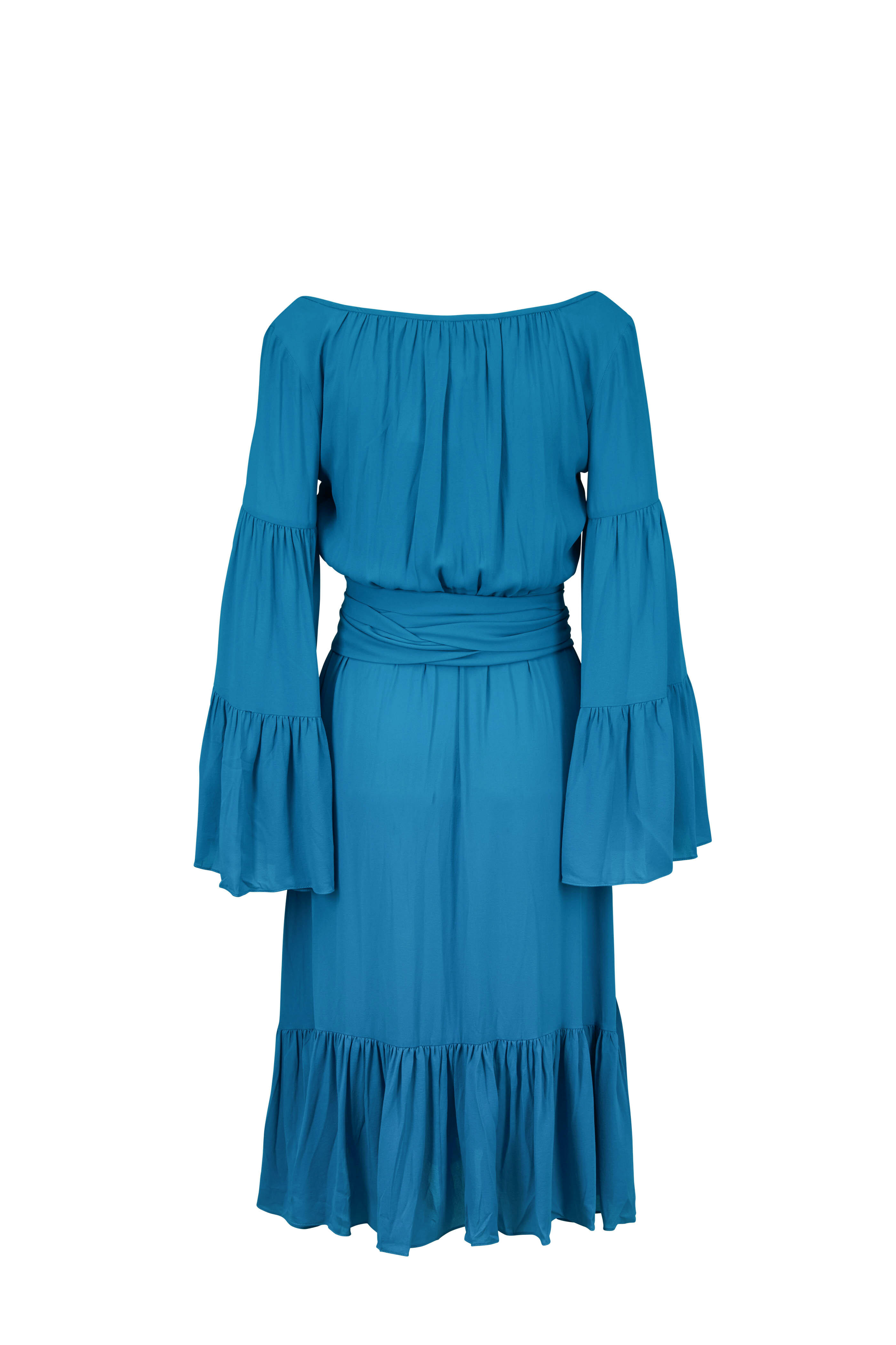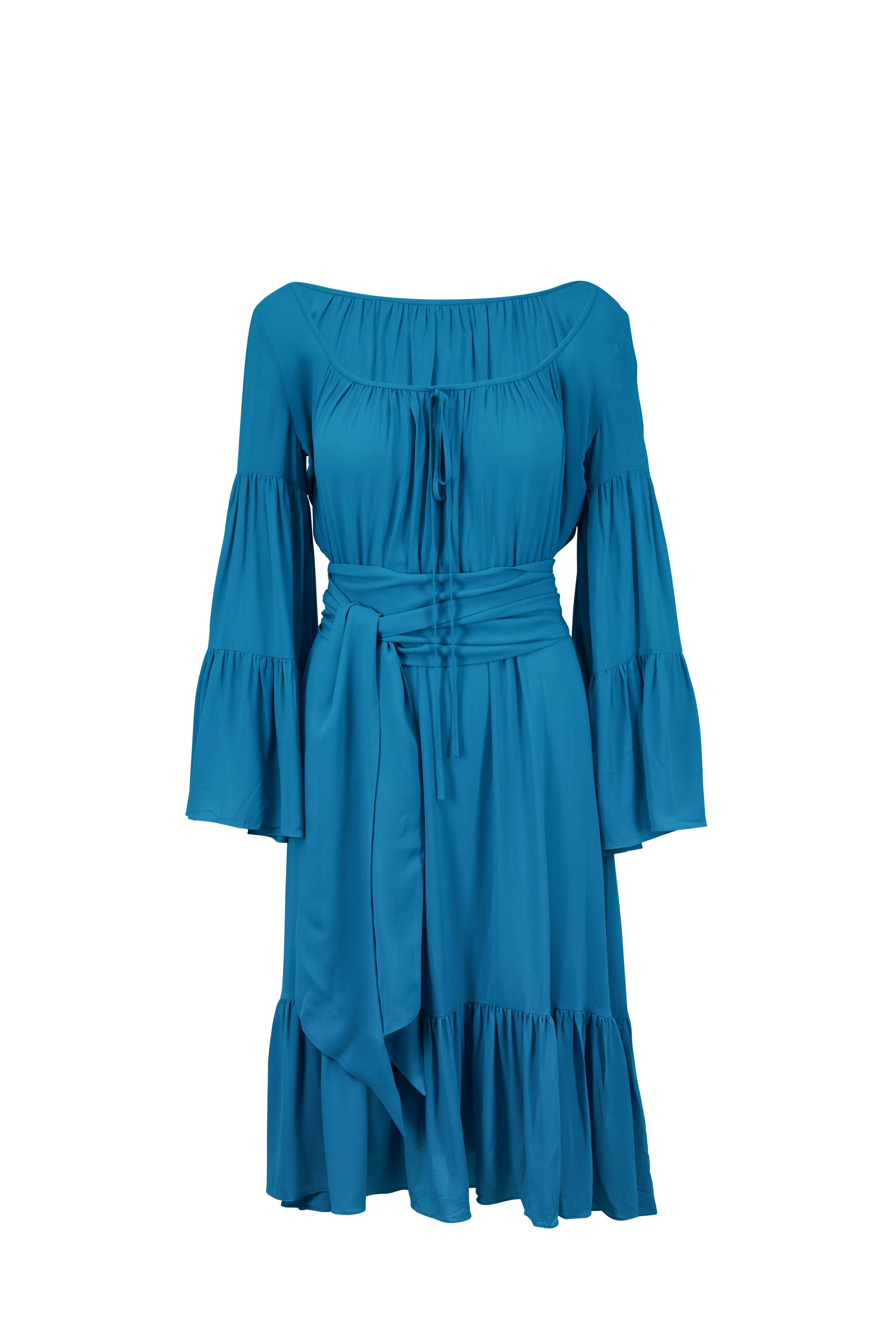 Scoop neckline; self tie detail at front. Slip-over style. Tiered bell sleeves. Removable self tie sash at waist. Flounce hem. Made in Italy. 44" shoulder to hem. 100% silk. Dry clean.