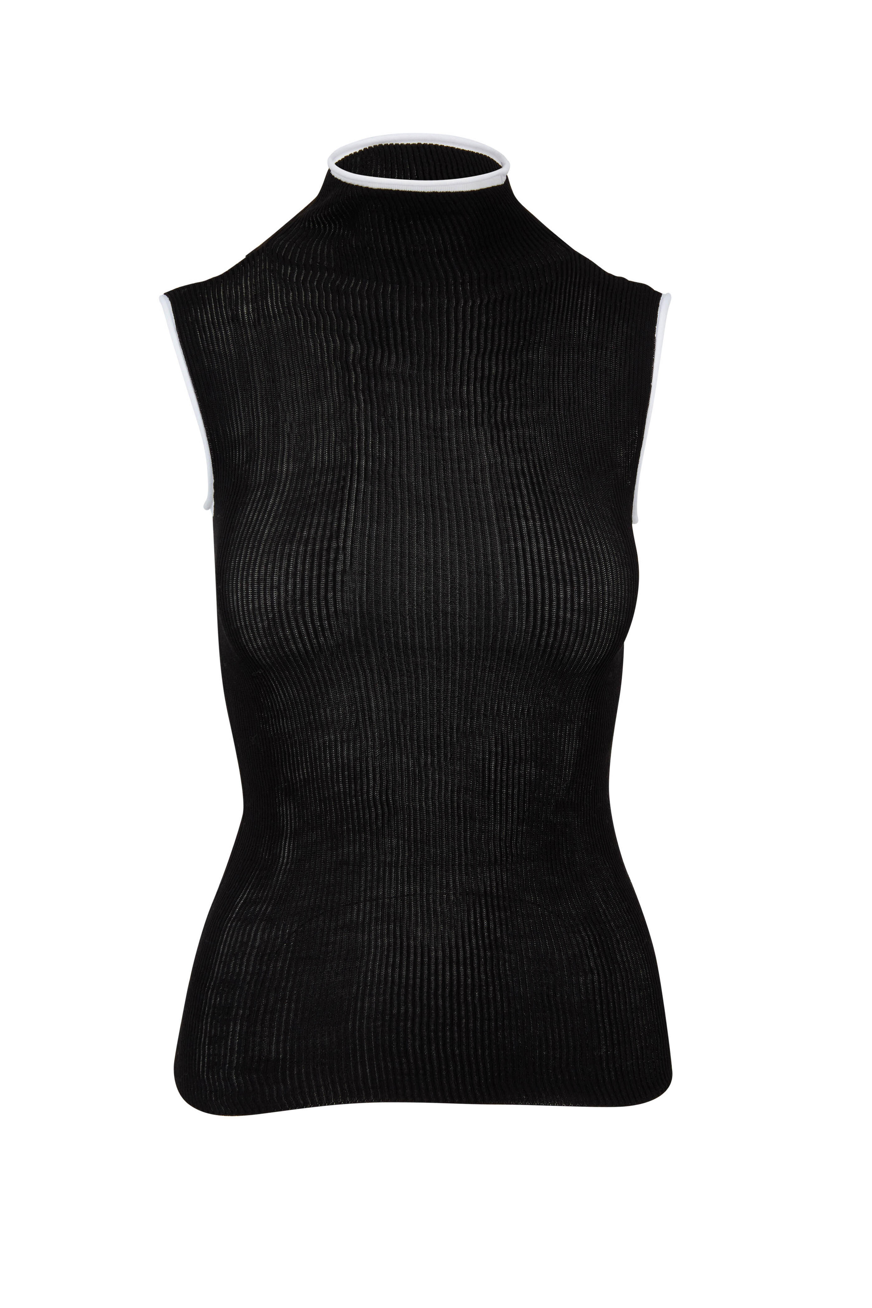 Turtleneck. Contrast trim on neck and cuffs. Imported with Italian yarn. 100% cotton. Dry clean.
