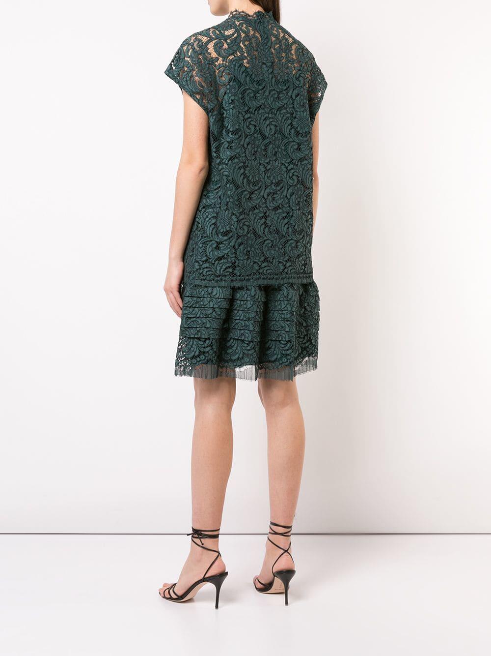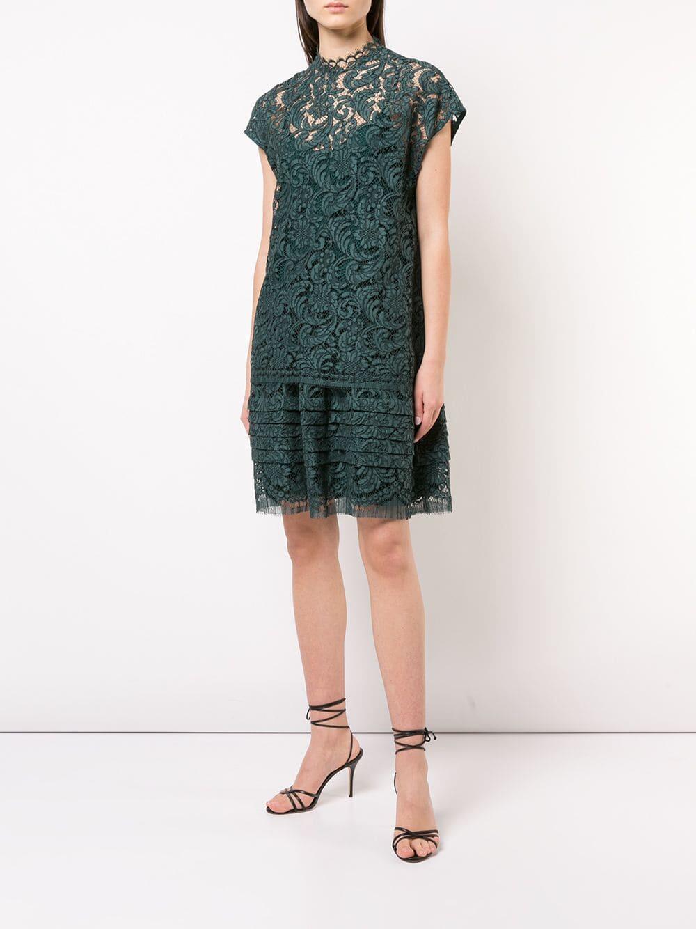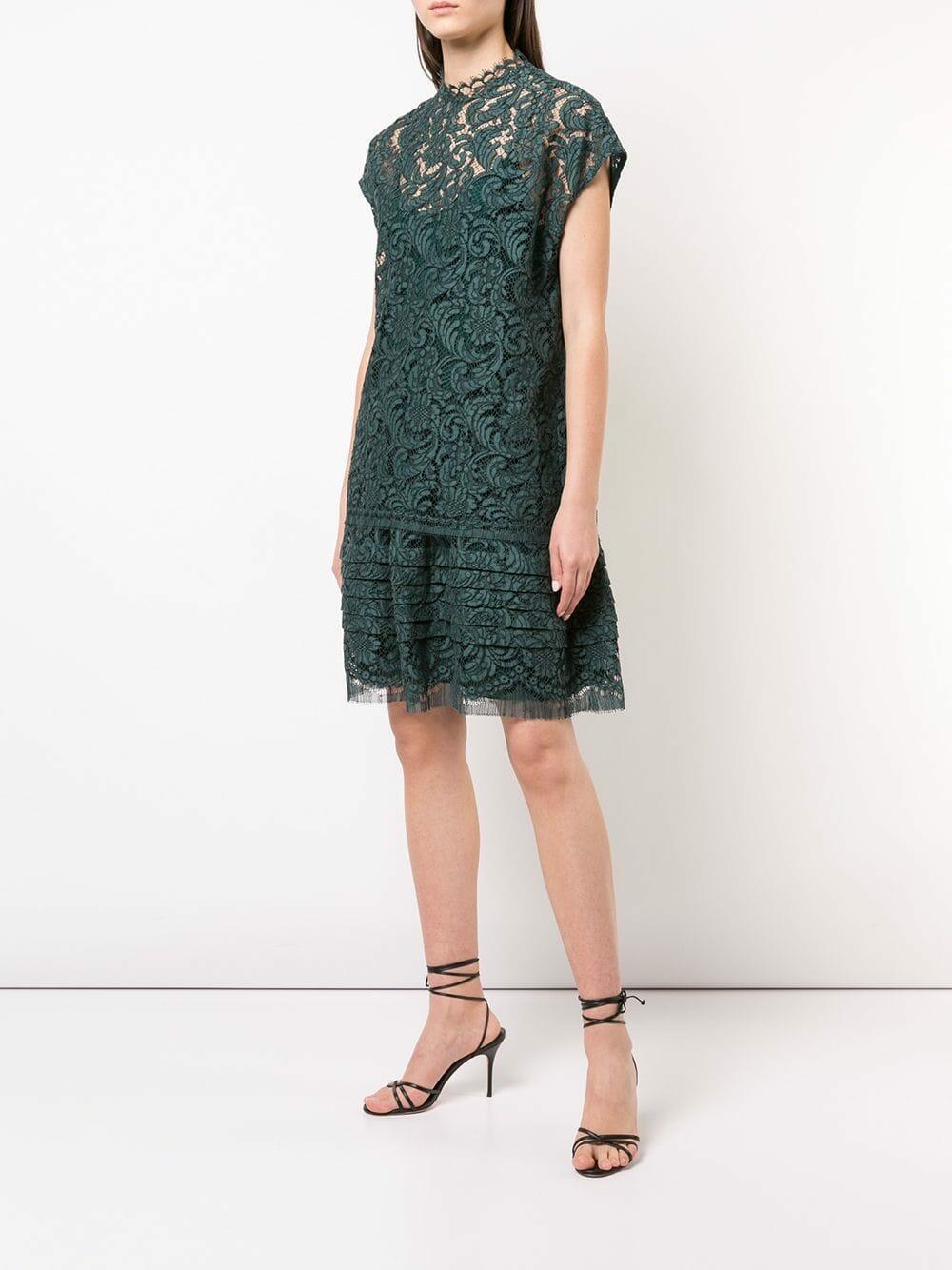 Mock neckline. Concealed back zip closure. Cap sleeves. Tiered hem. Made in the USA. 38" shoulder to hem. 74% cotton, 18% viscose, 8% nylon; lining: 100% silk. Dry clean.