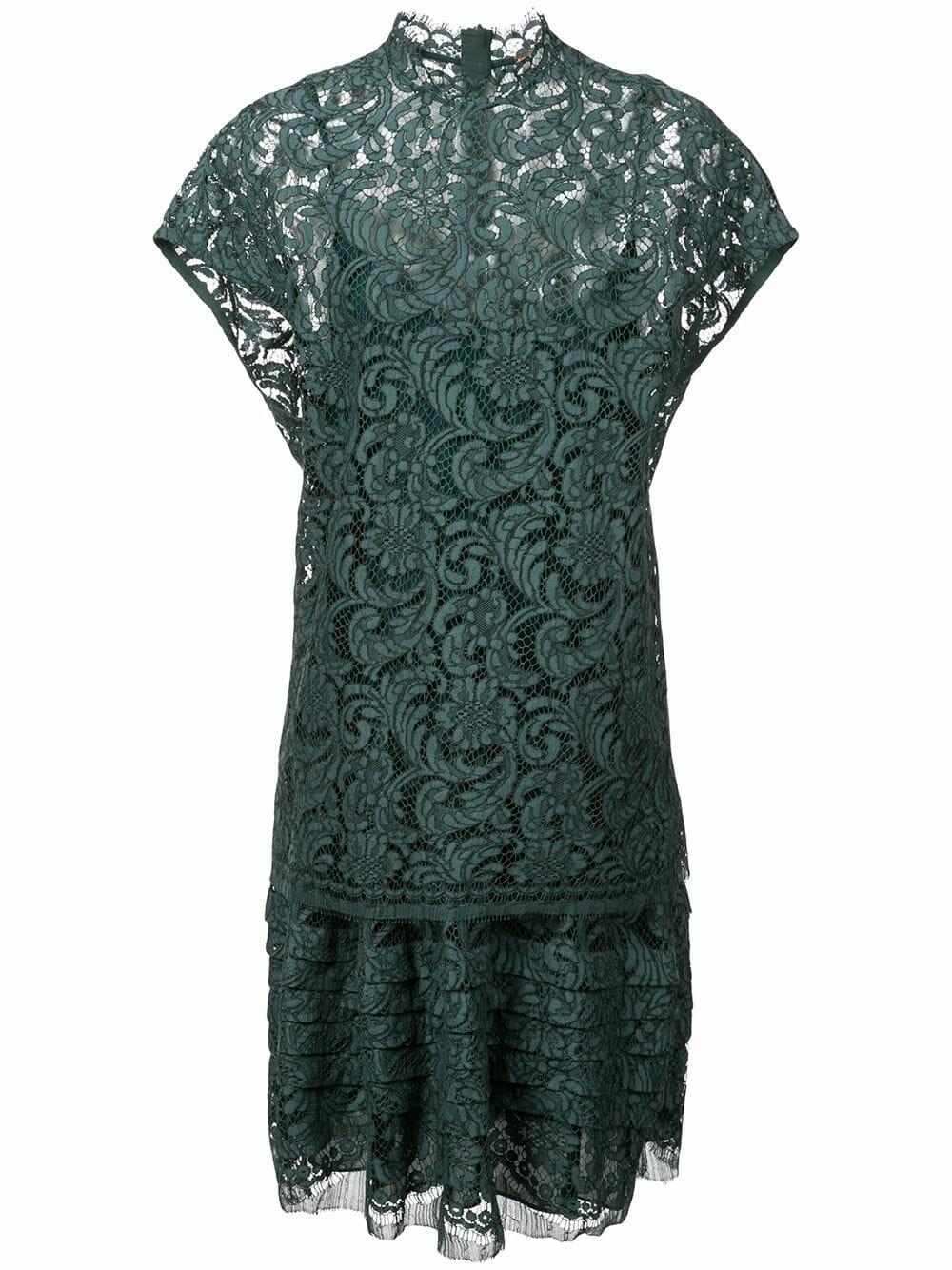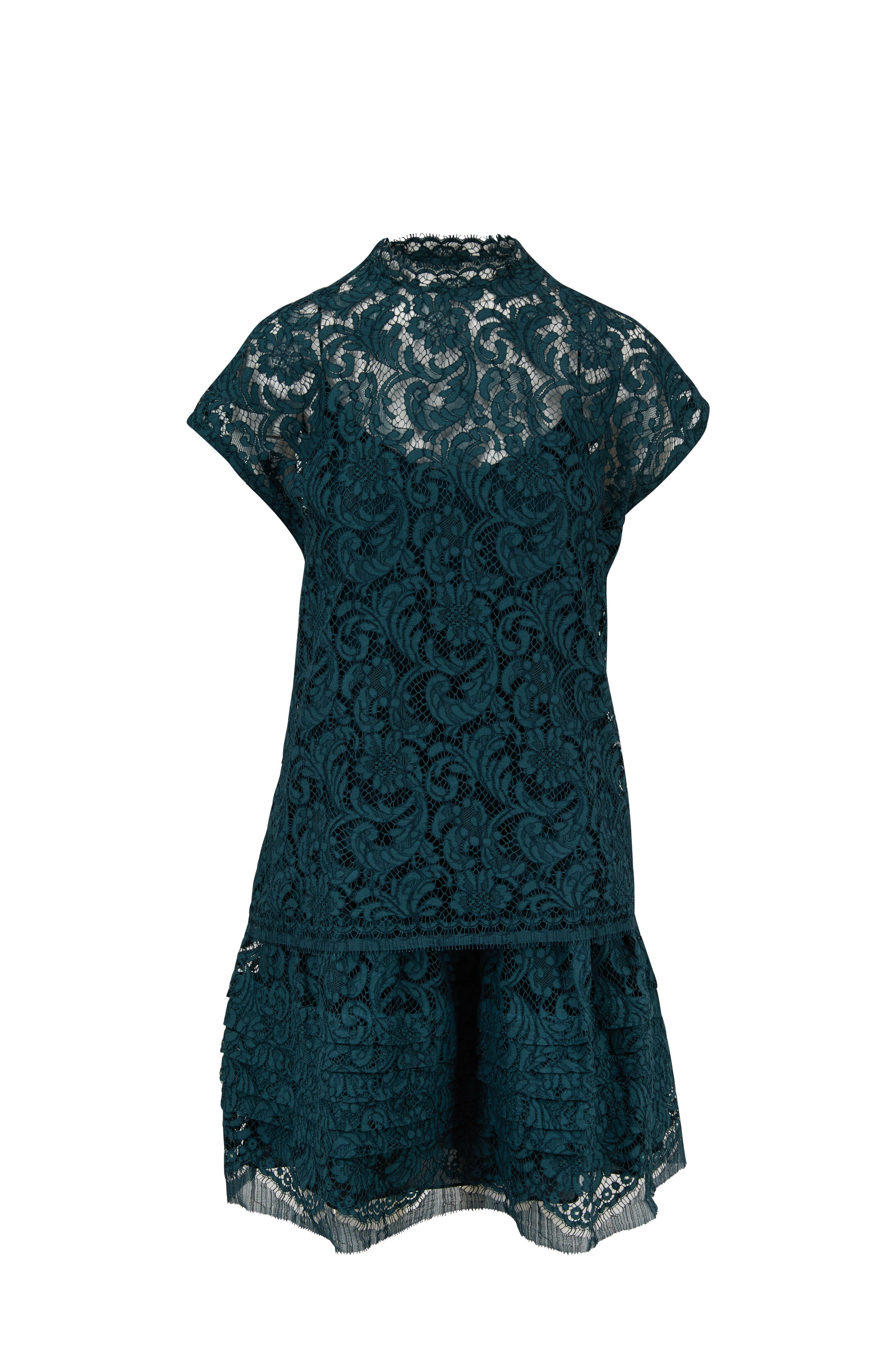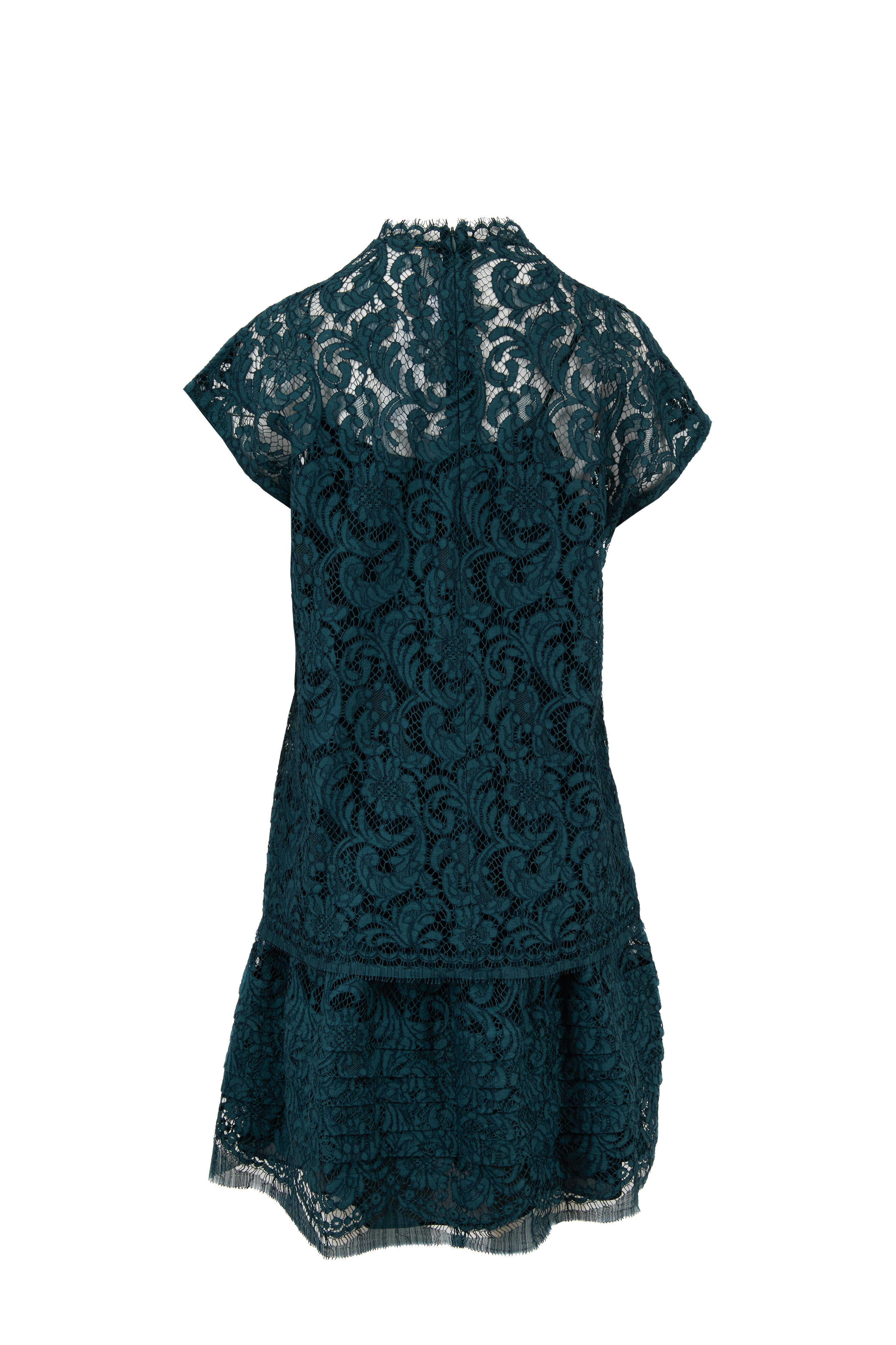 Mock neckline. Concealed back zip closure. Cap sleeves. Tiered hem. Made in the USA. 38" shoulder to hem. 74% cotton, 18% viscose, 8% nylon; lining: 100% silk. Dry clean.