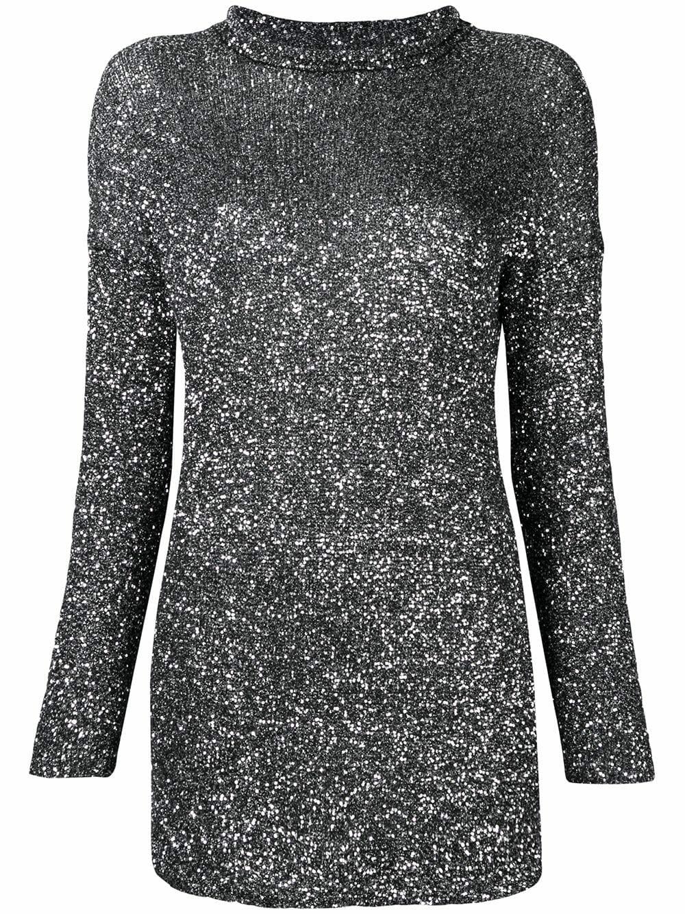 Rolled, round neckline. Slip over style. Drop shoulders. Straight hem. Made in Italy. 31" shoulder to hem. 90% polyester, 5% polyamide, 5% polyethylene. Dry clean.