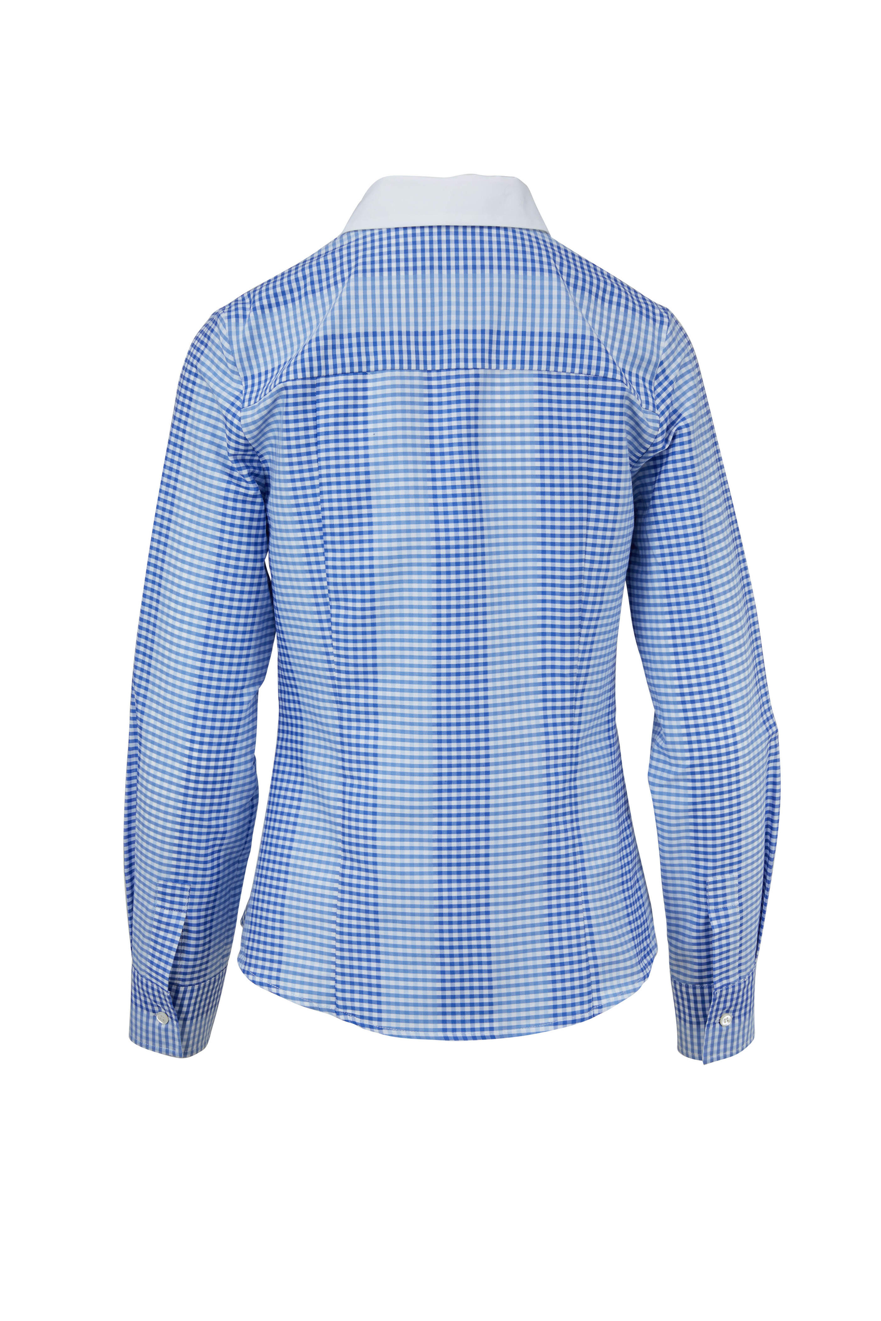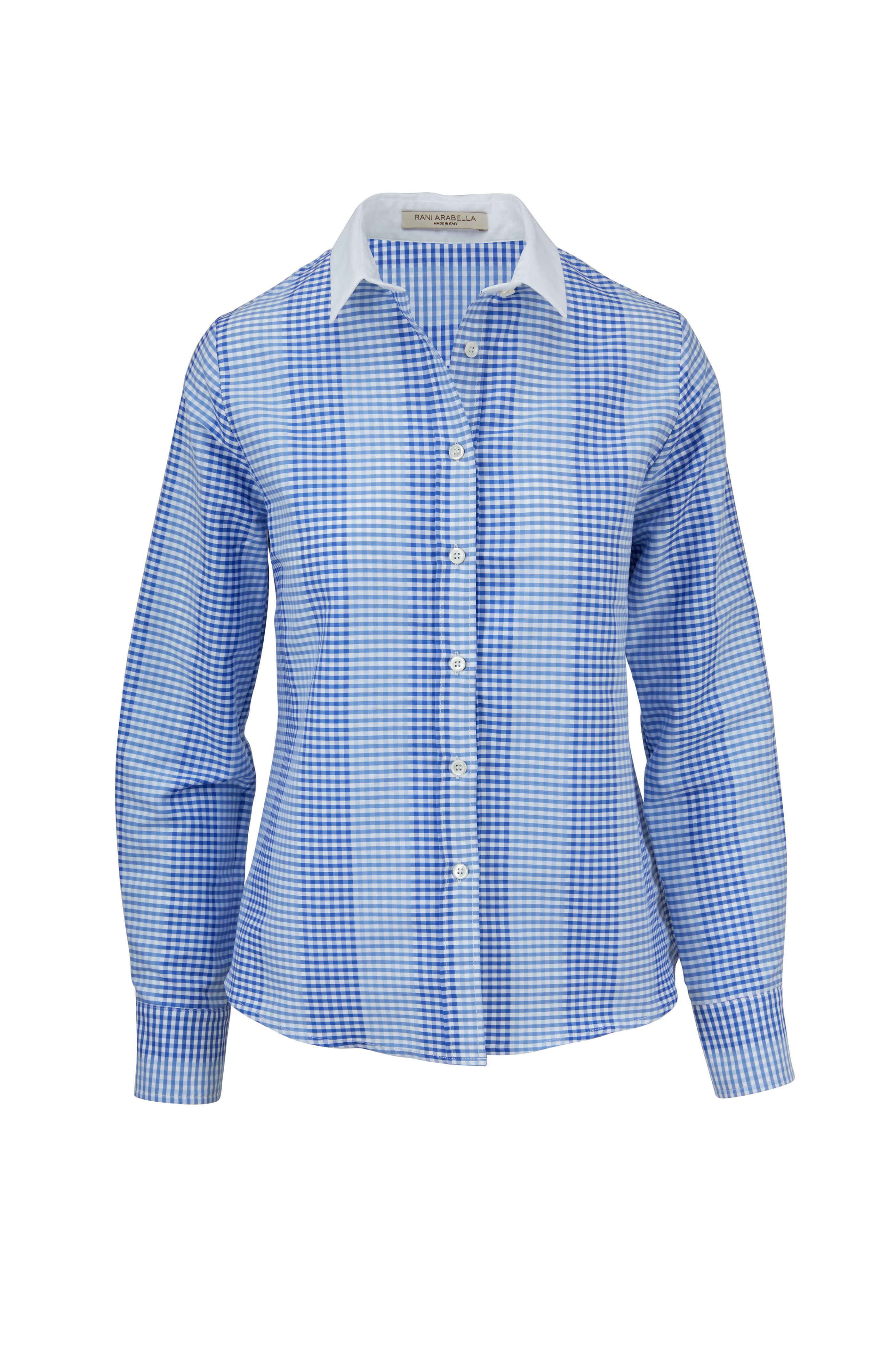 Contrast spread collar. Front button placket. Single button squared cuffs. Made in Italy. 100% cotton. Dry clean.