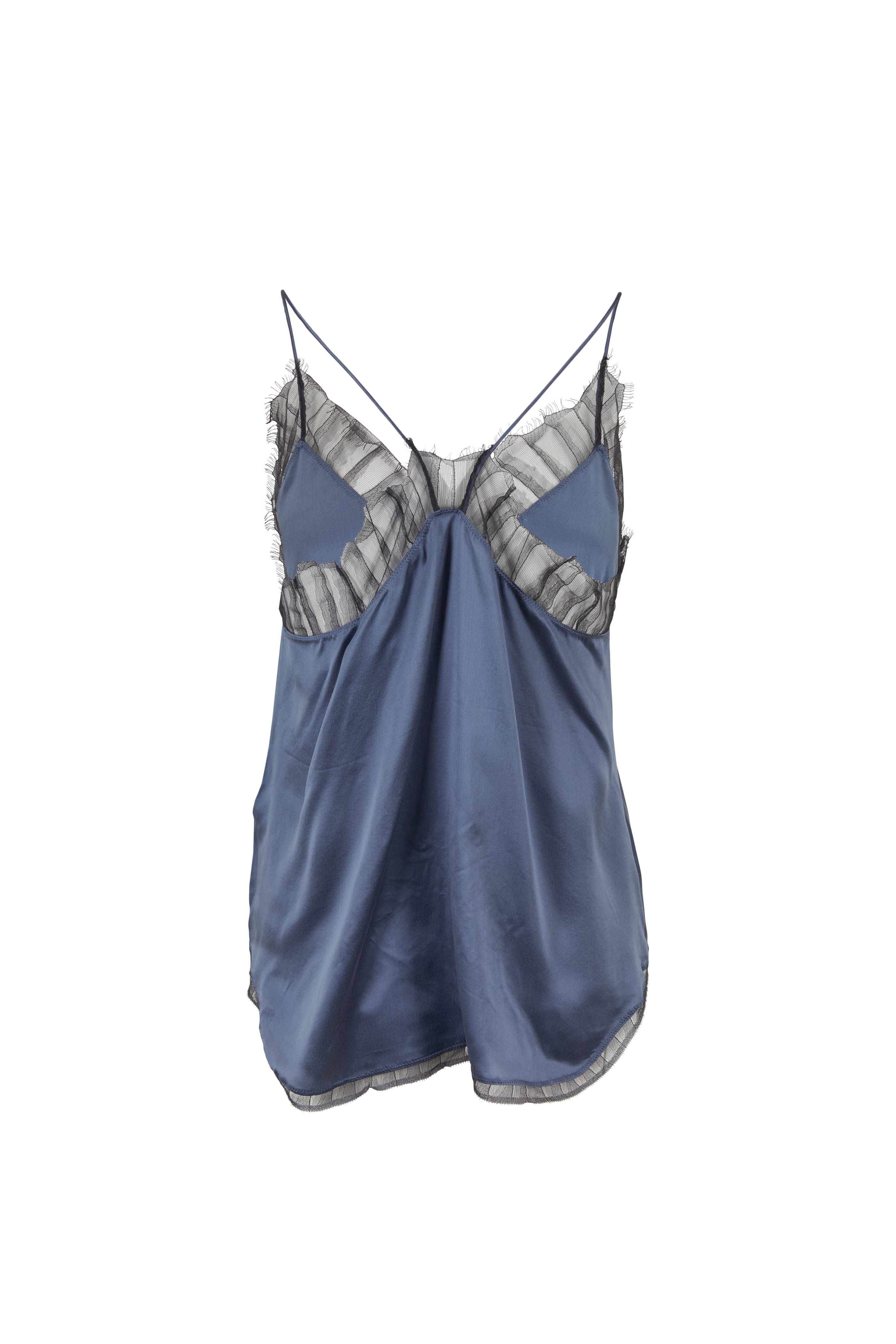 Lace trim v-neckline. Racerback. Eyelash trim hem. Imported. 100% silk. Hand wash.