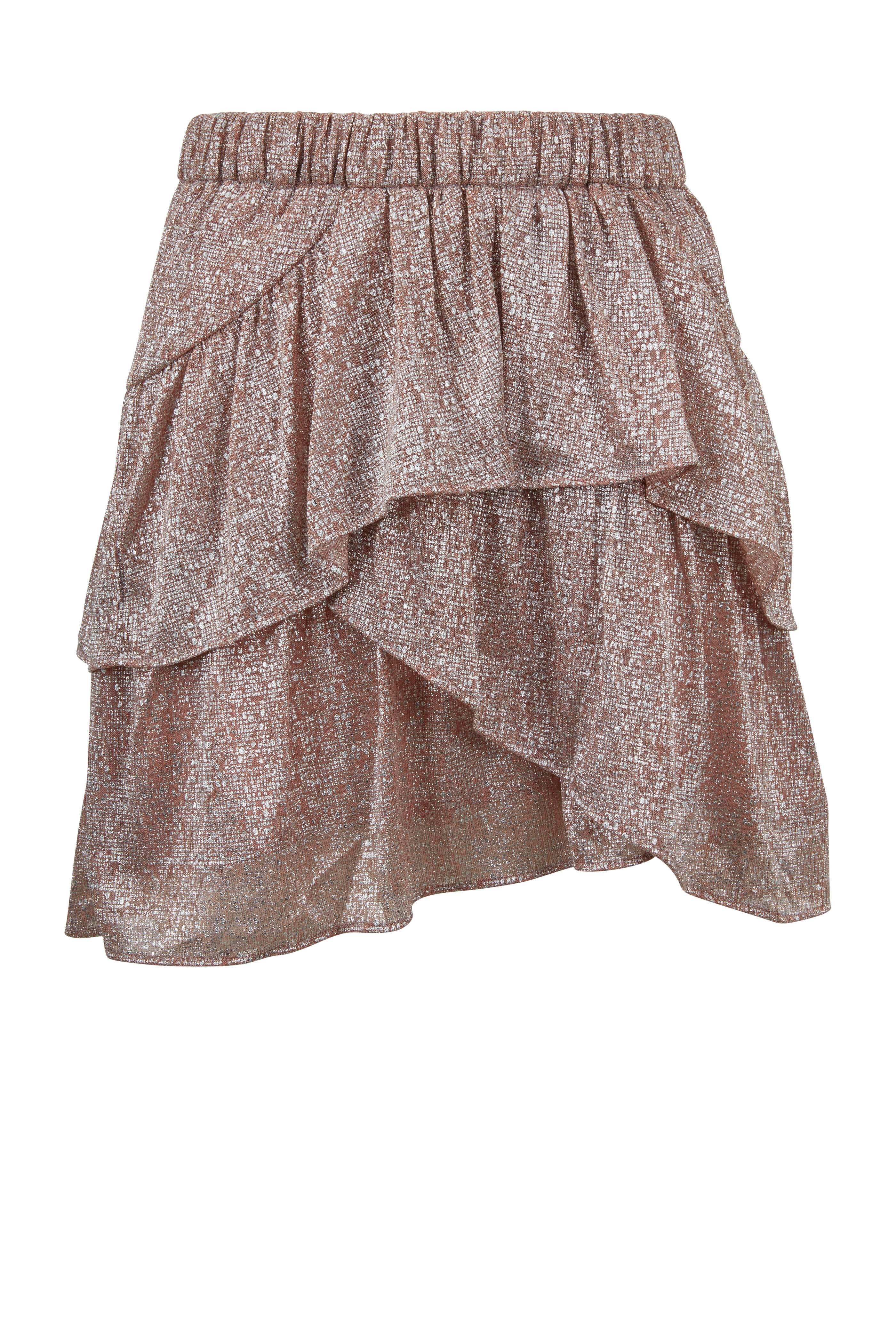 Elasticized waist. Pull-on style. Flounce hem. Imported. 16" length. 55% polyester, 45% metallic fiber; fully lined. Hand wash.