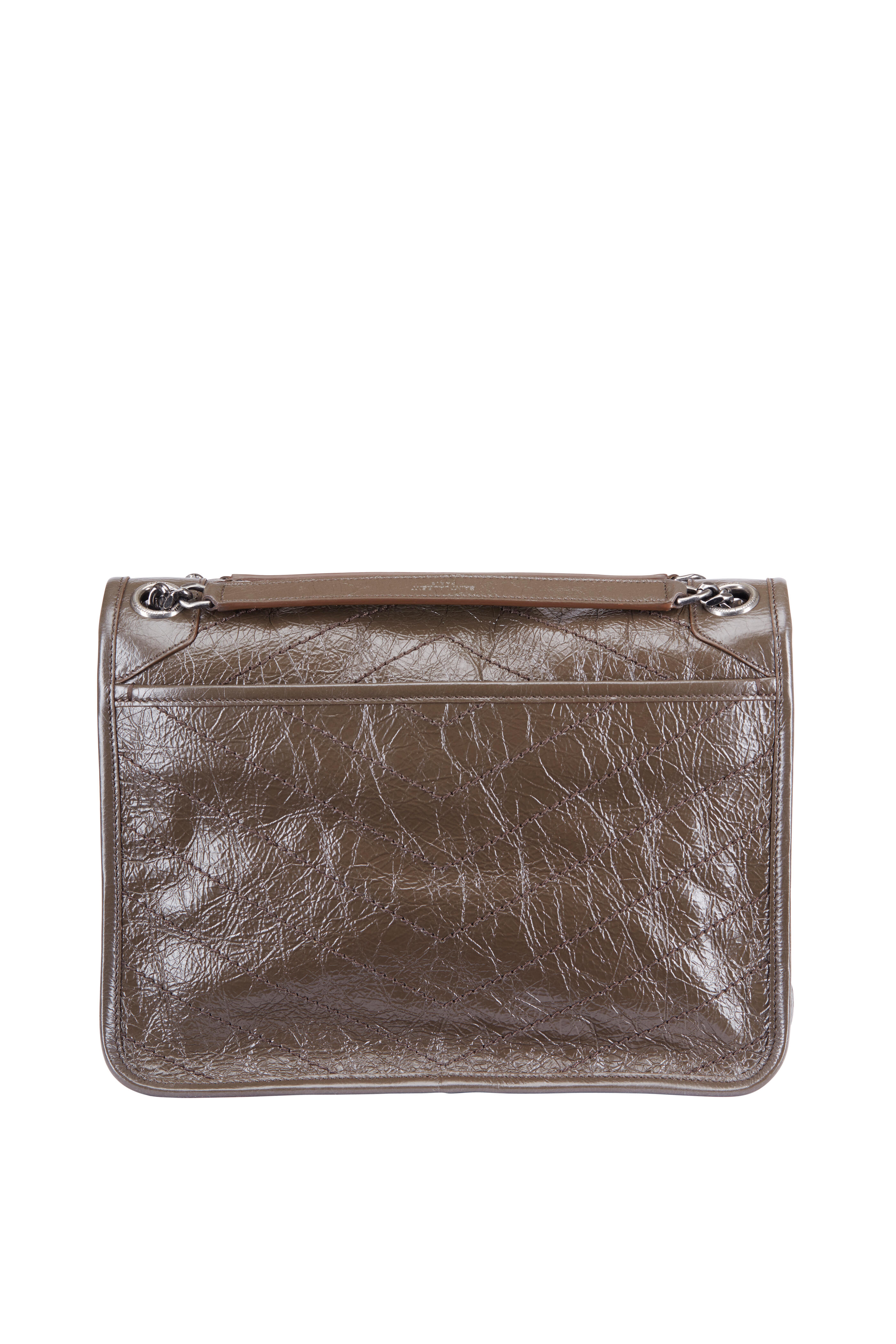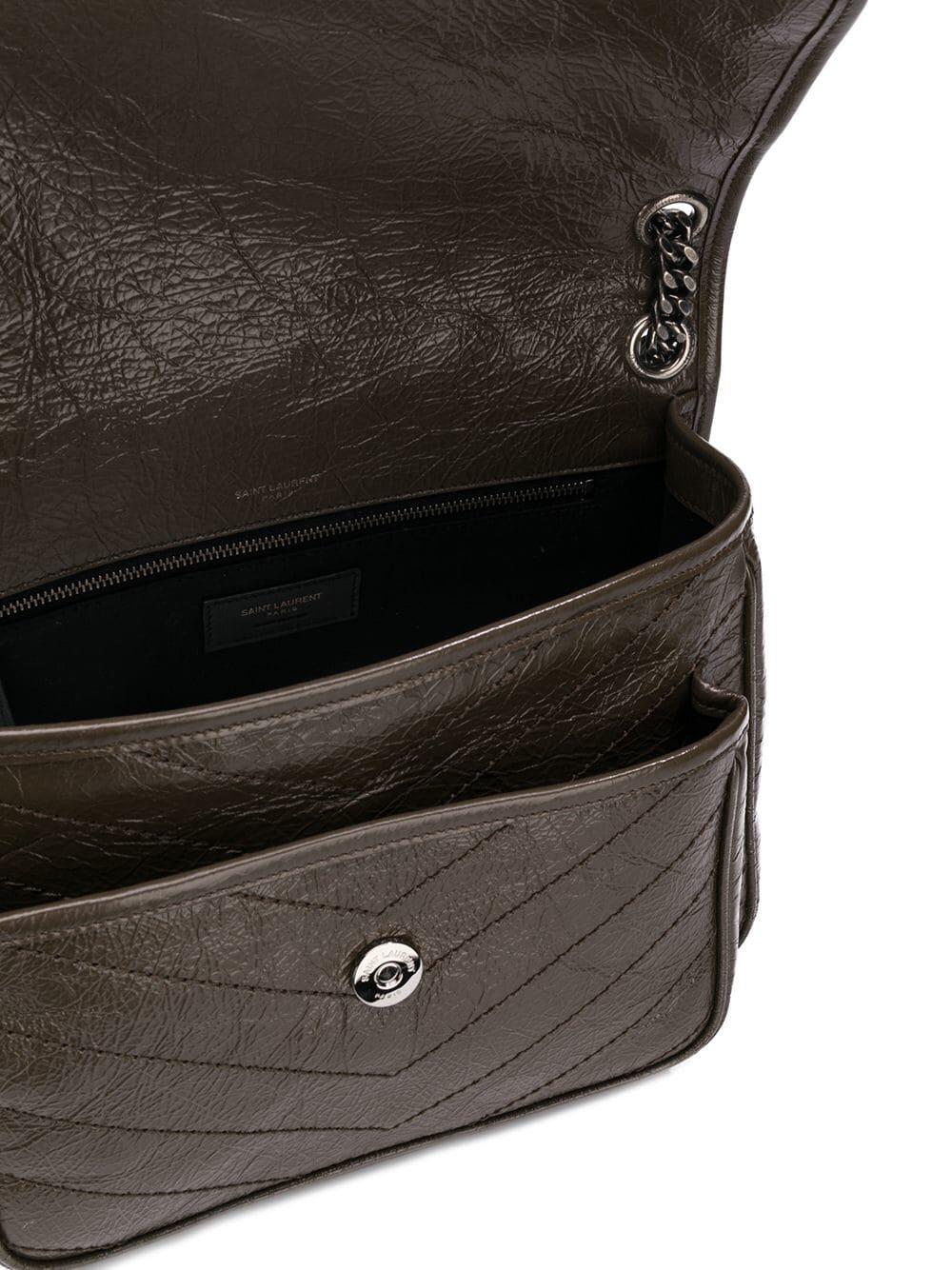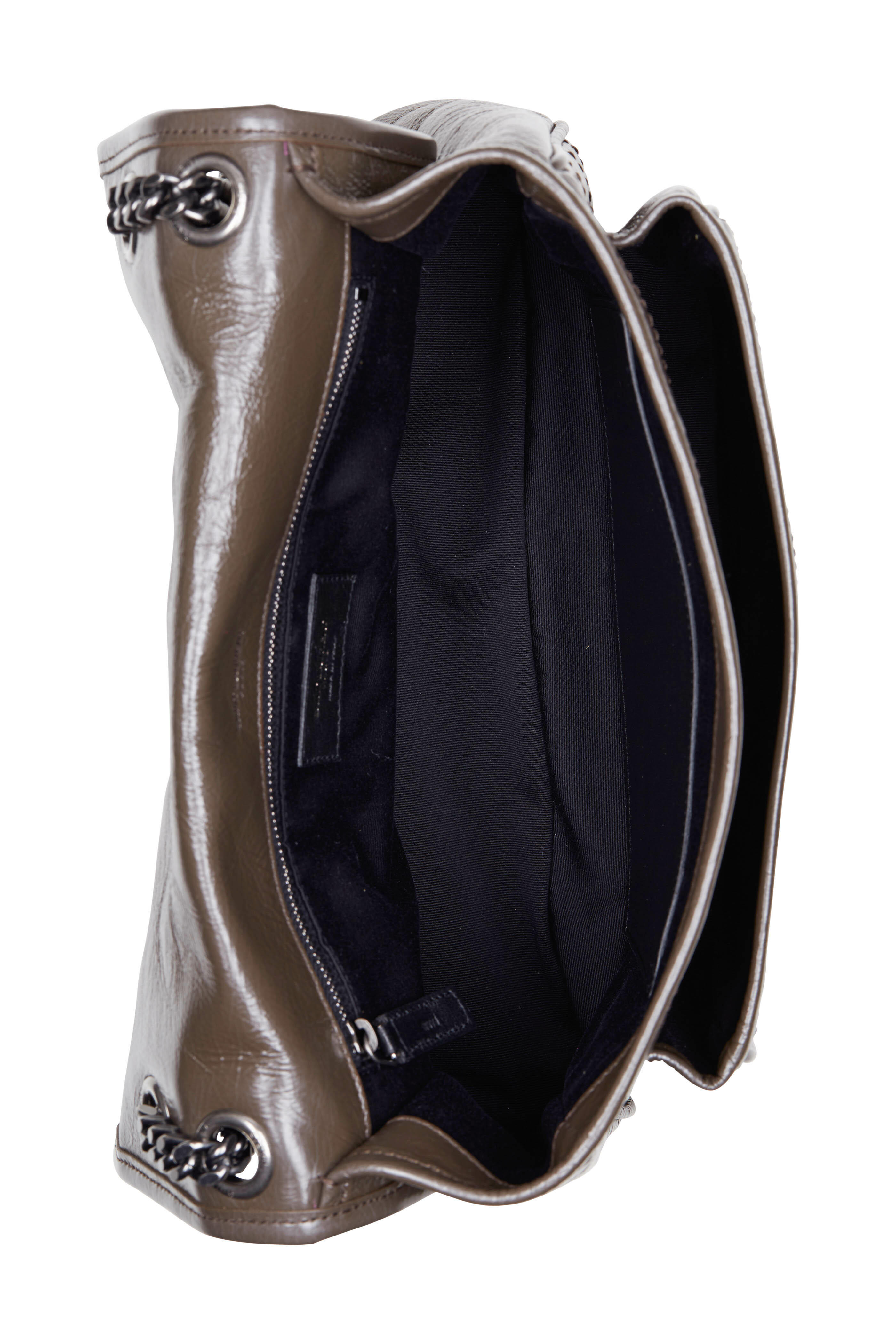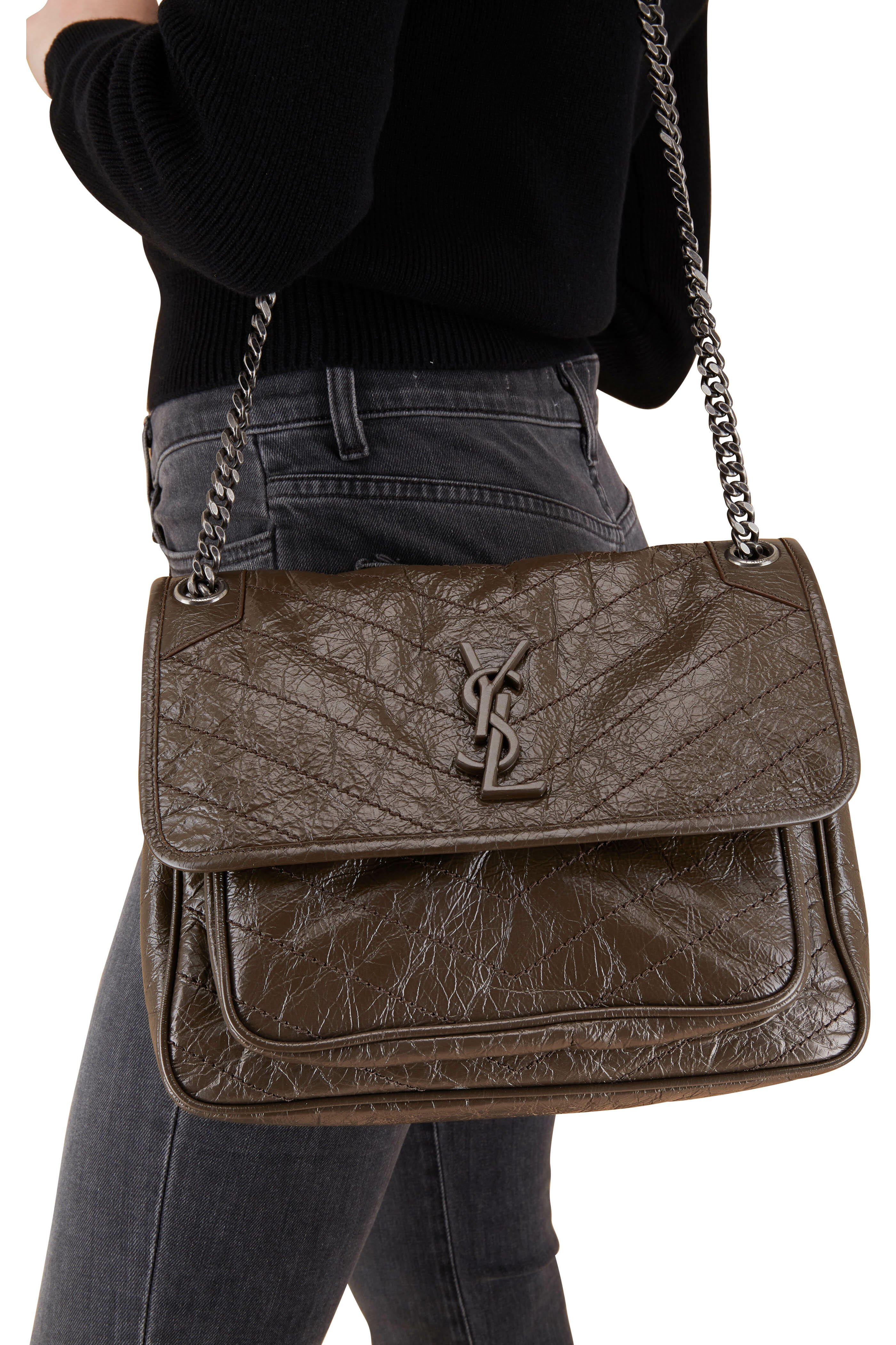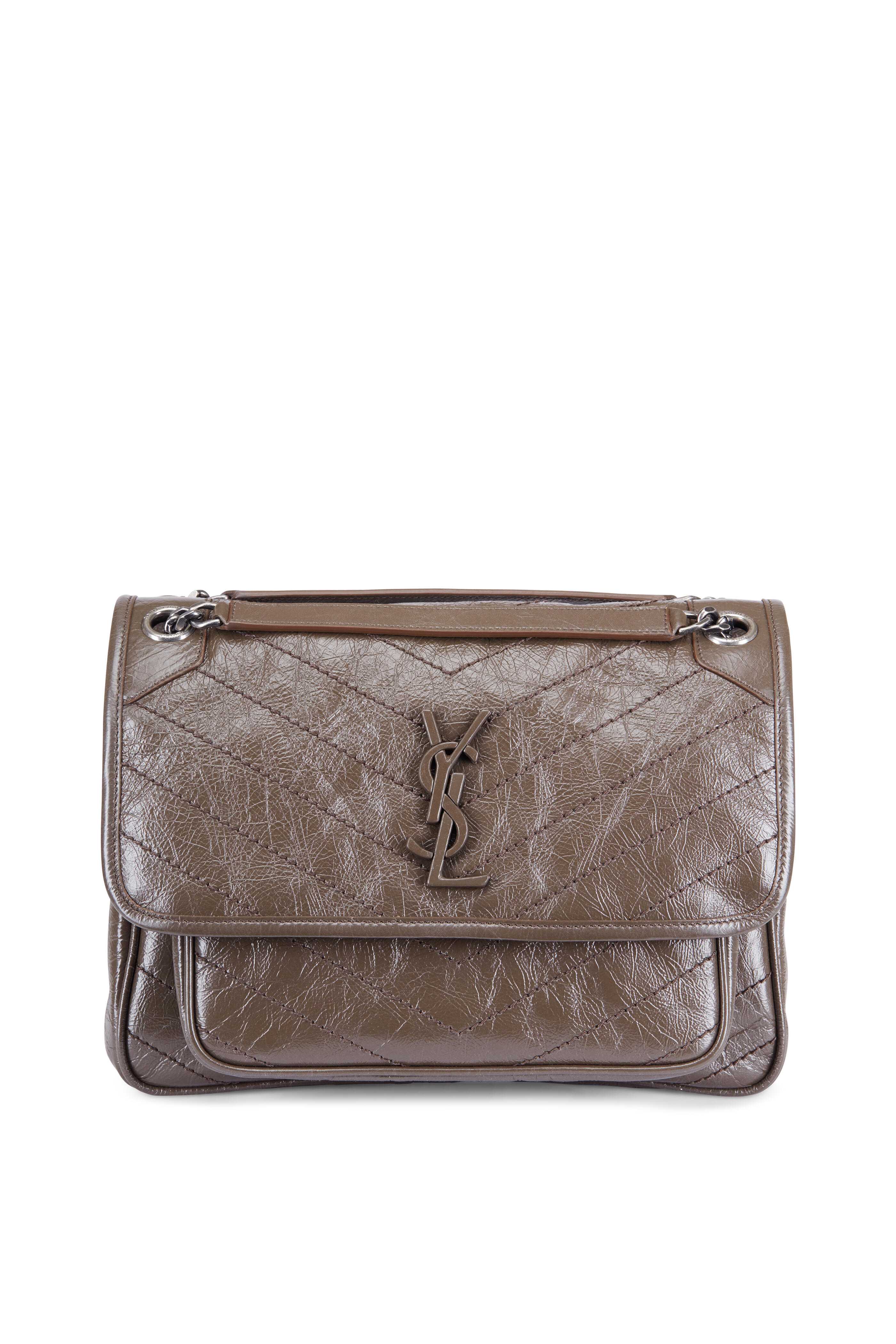 Quilted calfskin leather. Chain with leather inset shoulder strap. Flap front, magnetic snap closure. Tonal lacquer signature detail. Two interior slip pockets, one zip pocket. Lined in canvas. Made in Italy. Height: 8 ½". Width: 11". Depth: 5 ½". Adjustable strap drop: 11" - 20".