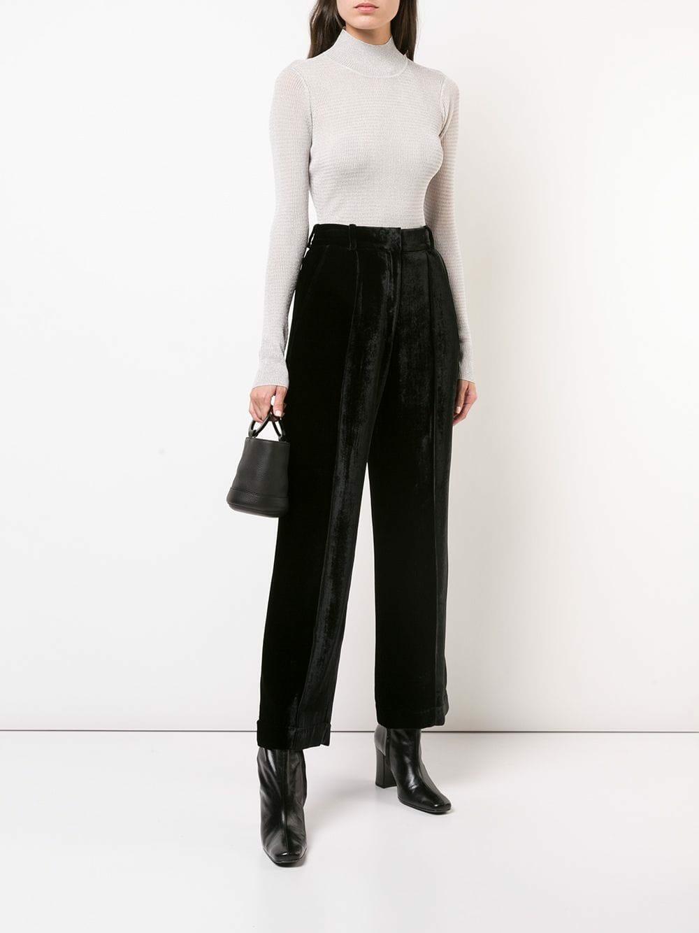 Turtleneck. Contrast cuffs. Imported. 46% polyester, 42% viscose, 12% metallized fiber. Dry clean.