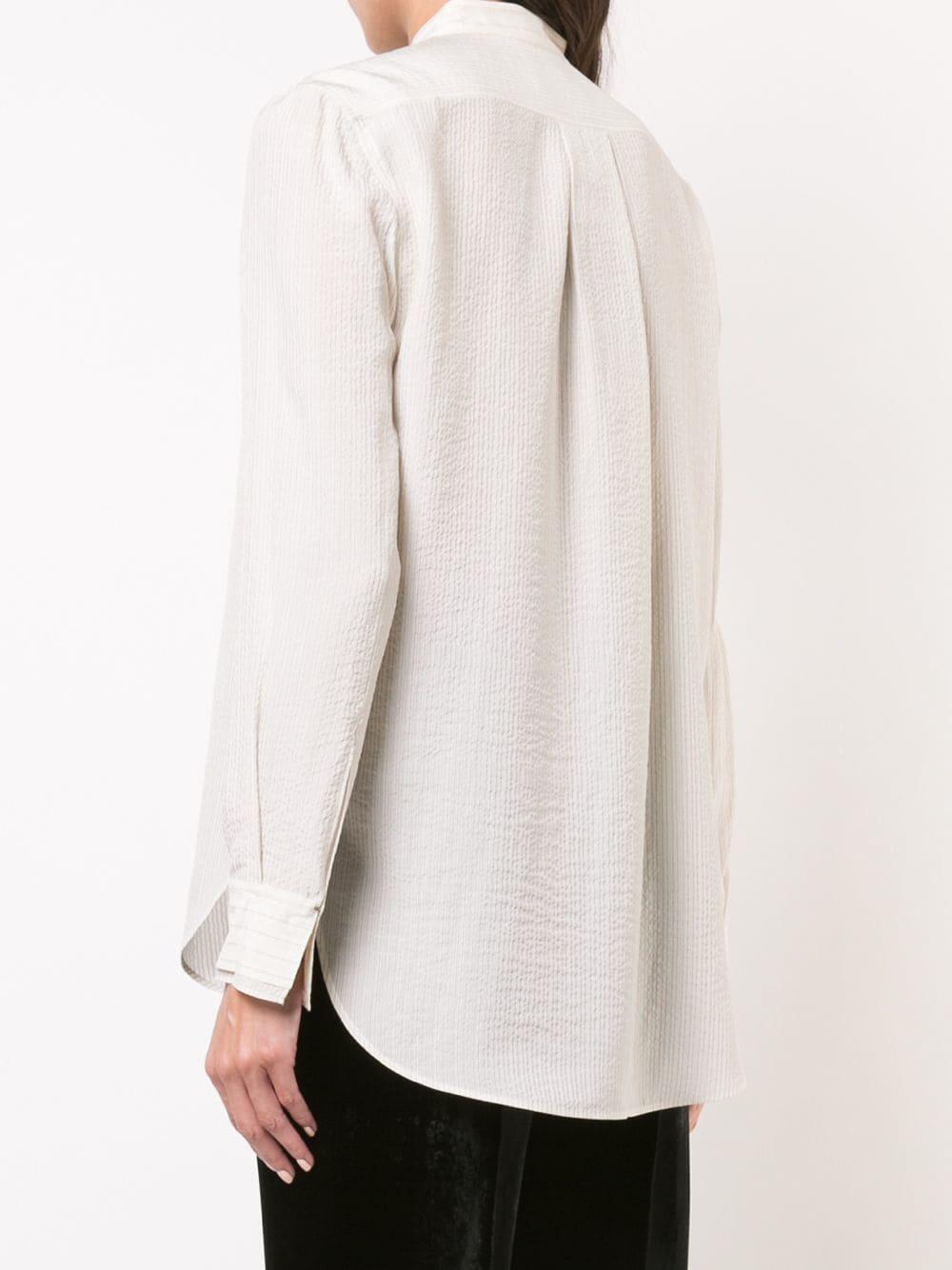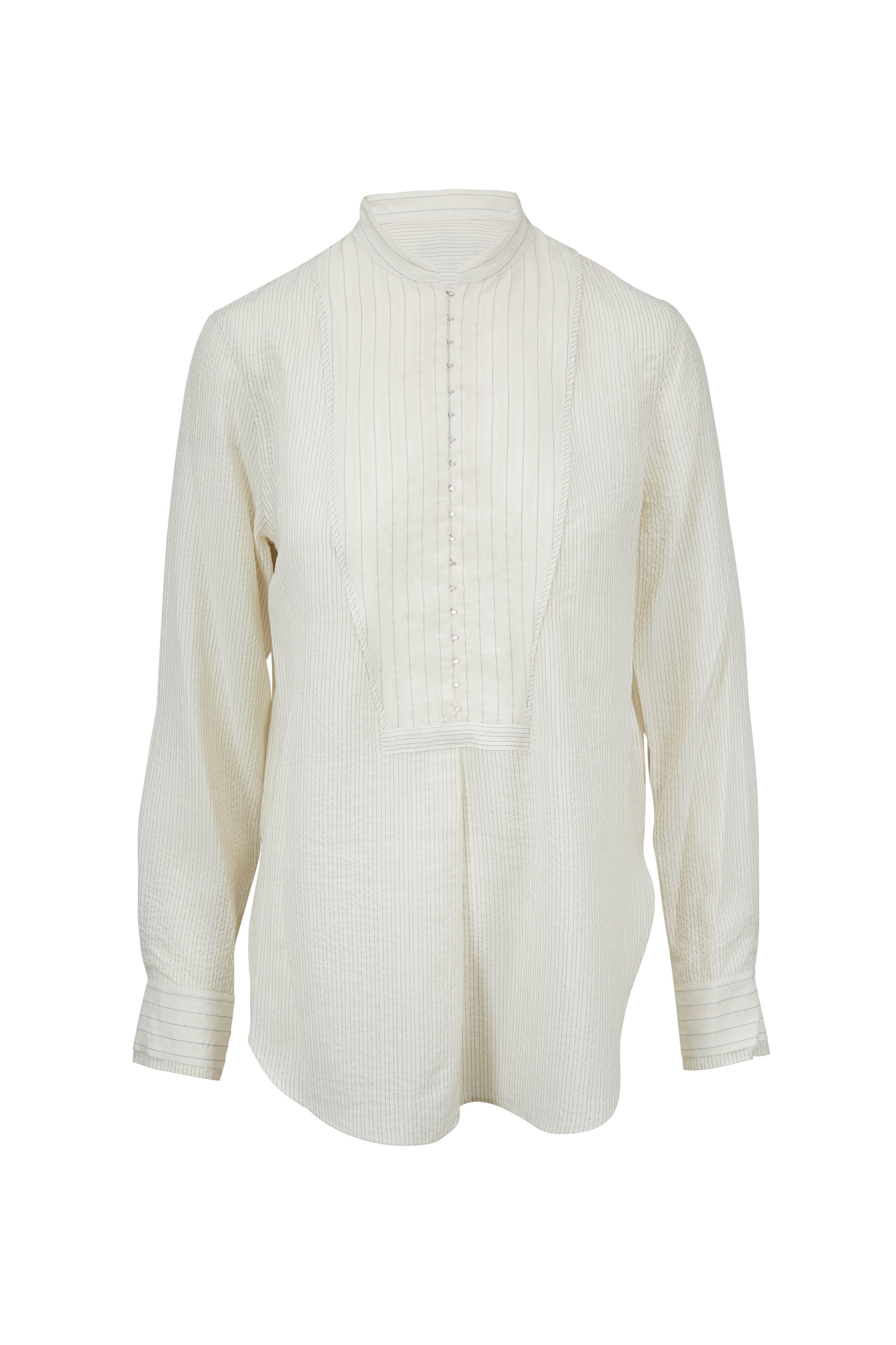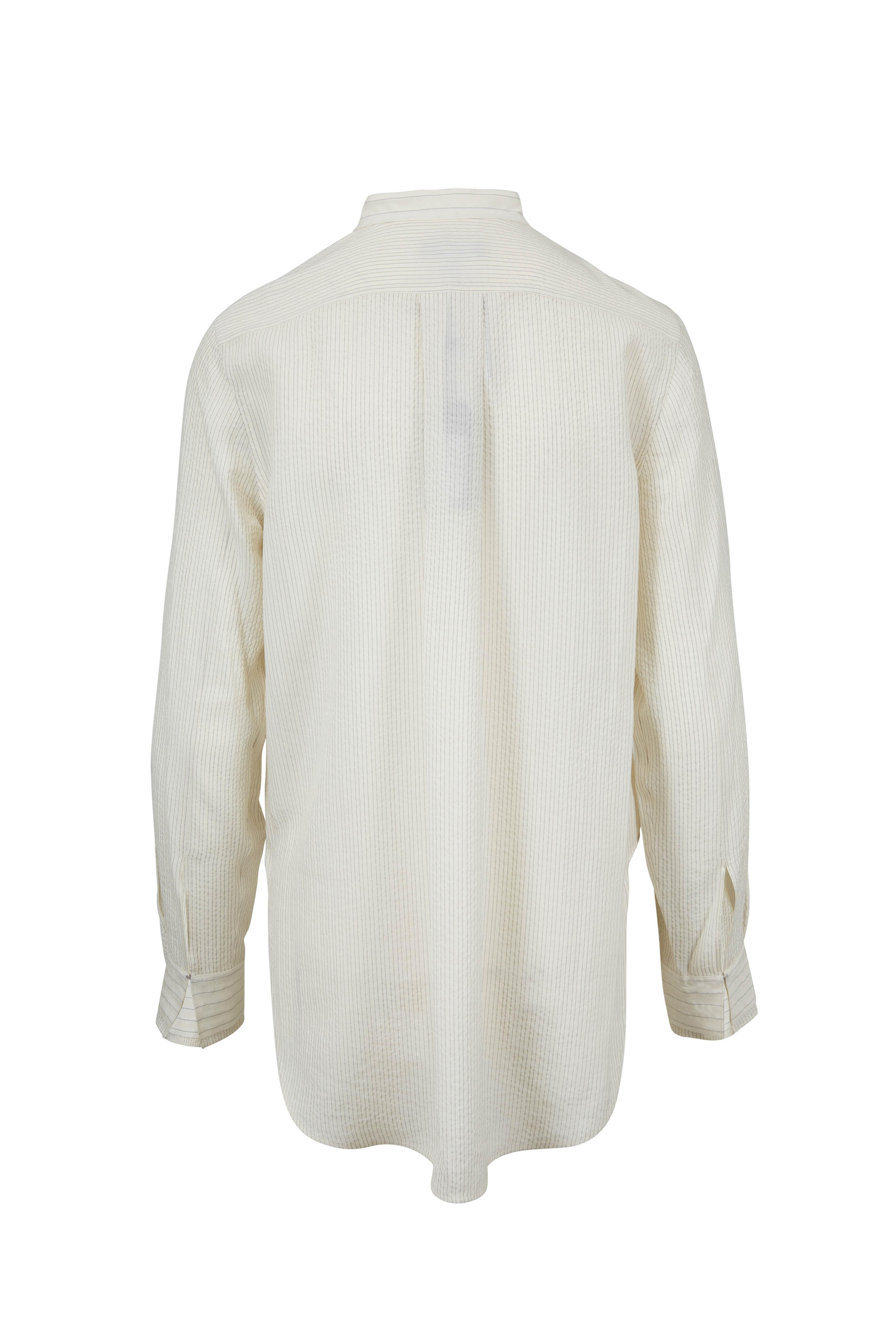 Band collar. Hook-and-eye closures. Single hook vented cuffs. Shirttail hem. Yoked back; box pleat. Imported. 96% silk, 4% polyester. Dry clean.