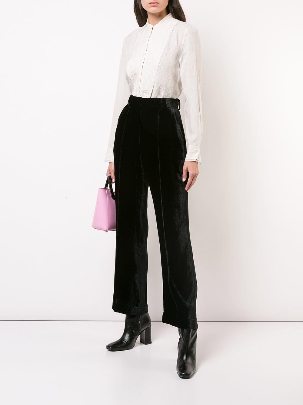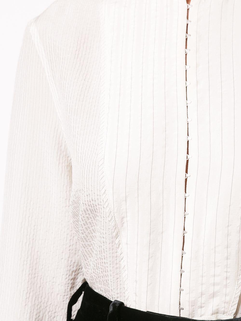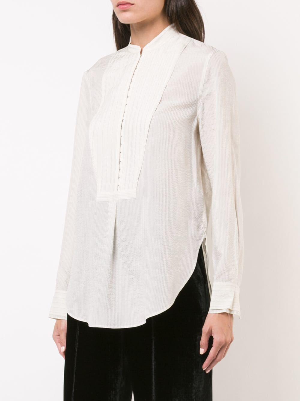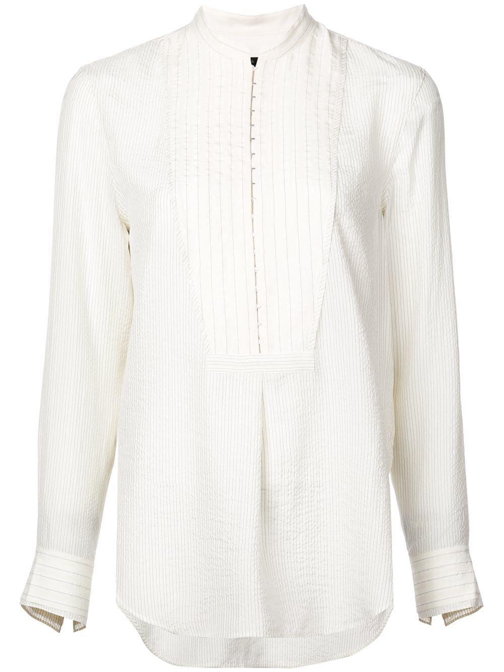 Band collar. Hook-and-eye closures. Single hook vented cuffs. Shirttail hem. Yoked back; box pleat. Imported. 96% silk, 4% polyester. Dry clean.