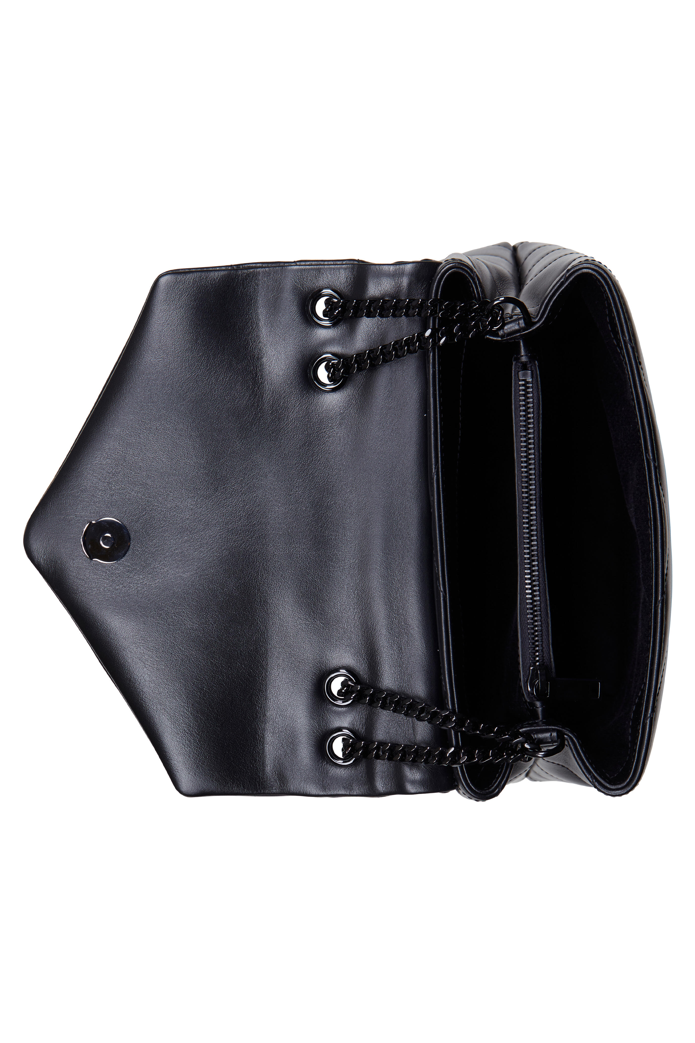 Calfskin leather. Convertible tonal chain with leather inset strap. Flap front, magnetic snap closure. Black lacquer logo at front. Center zip compartment, two open compartments. One interior open pocket. Lined in canvas. Made in Italy. Width: 9". Height: 7". Depth: 3". Strap drop: 12".