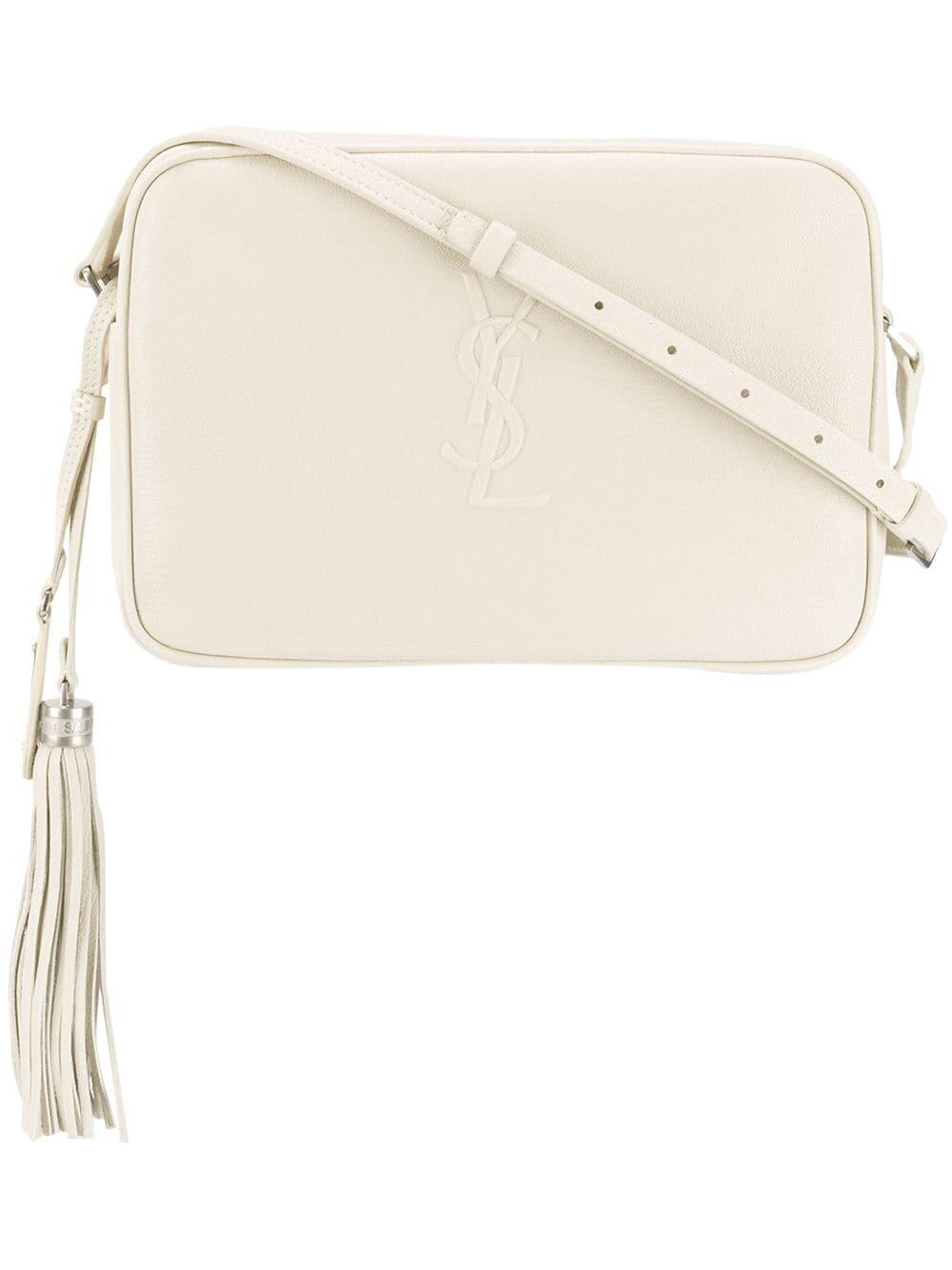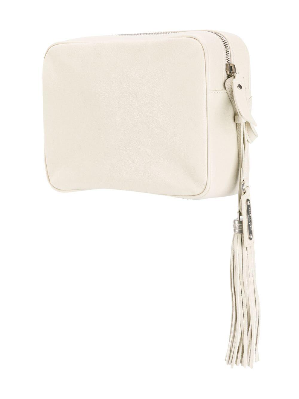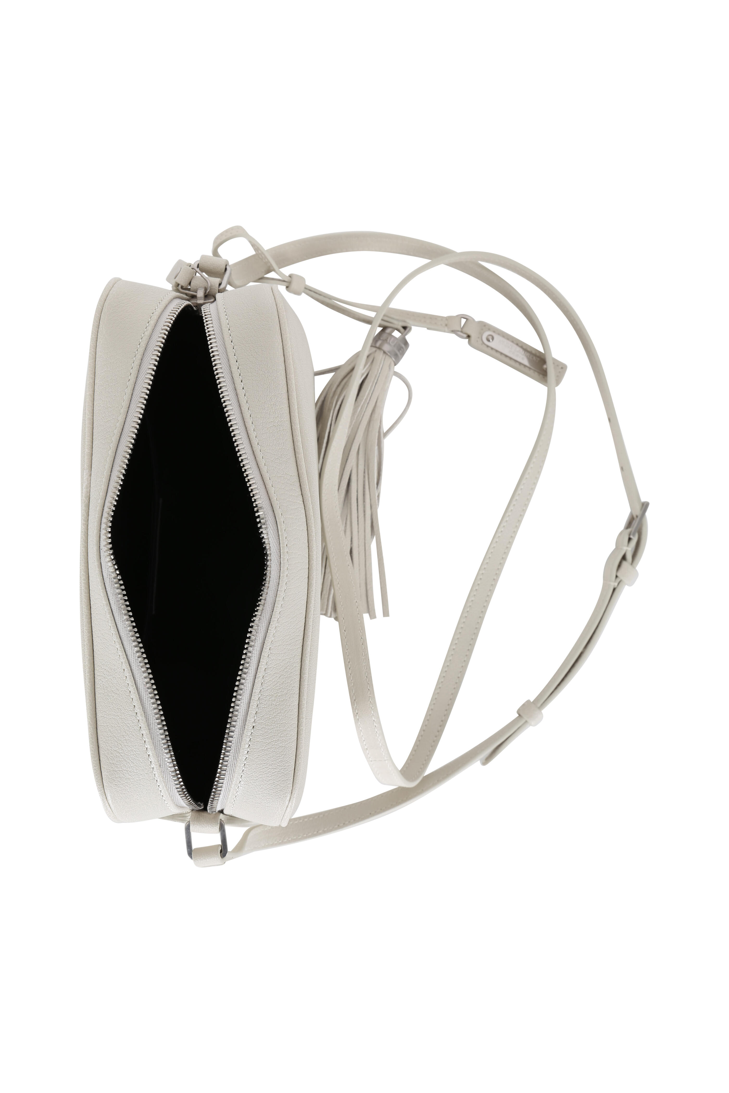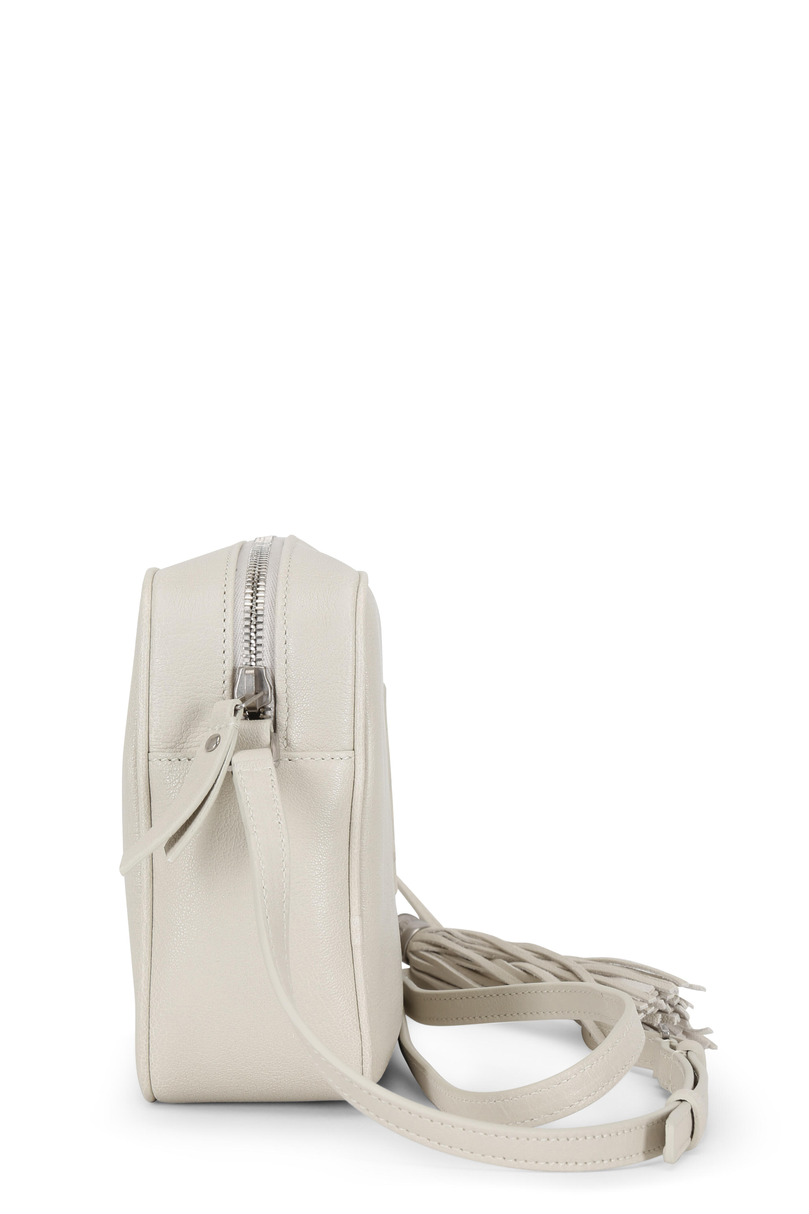 Grained calfskin leather. Adjustable shoulder strap; detachable tassel. Top zip closure. Embossed logo at front. One interior slip pocket. Lined in canvas. Made in Italy. Width: 9". Height: 6". Depth: 2 ¾". Adjustable strap drop: 25".
