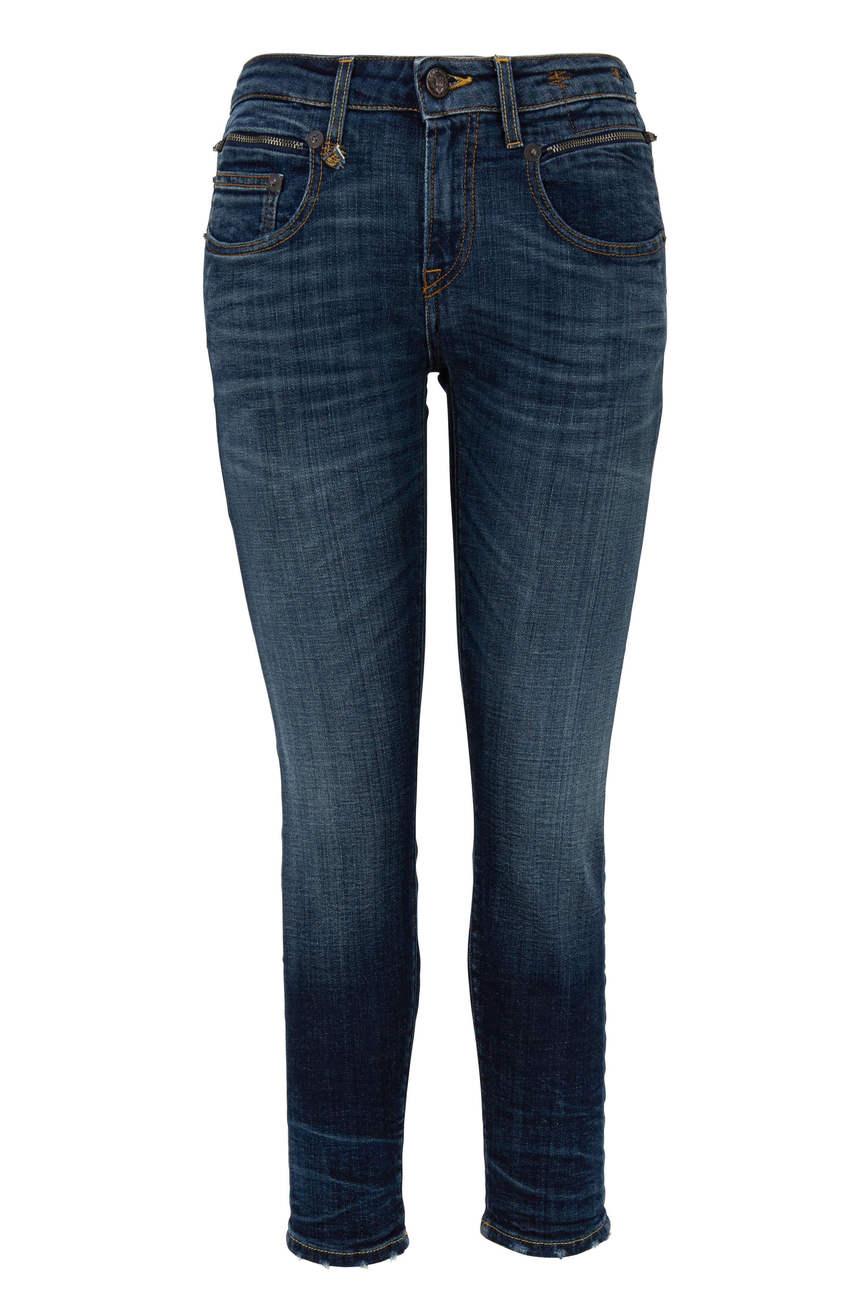 Five pocket styling; front zip welt pockets. Whisker and fade detailing. Contrast stitching. Made in Italy. Color: Howell Indigo. 25" inseam. 98% cotton, 2% elastane; patch: 100% leather. Machine wash.