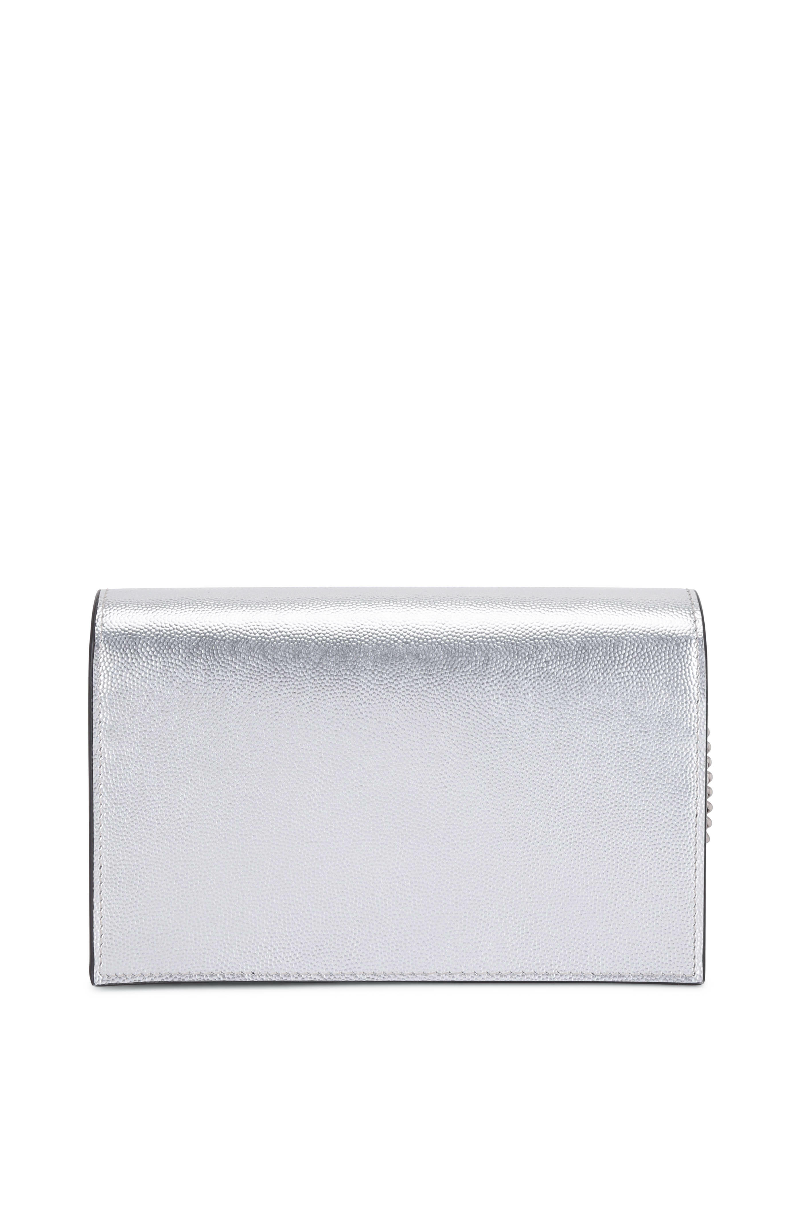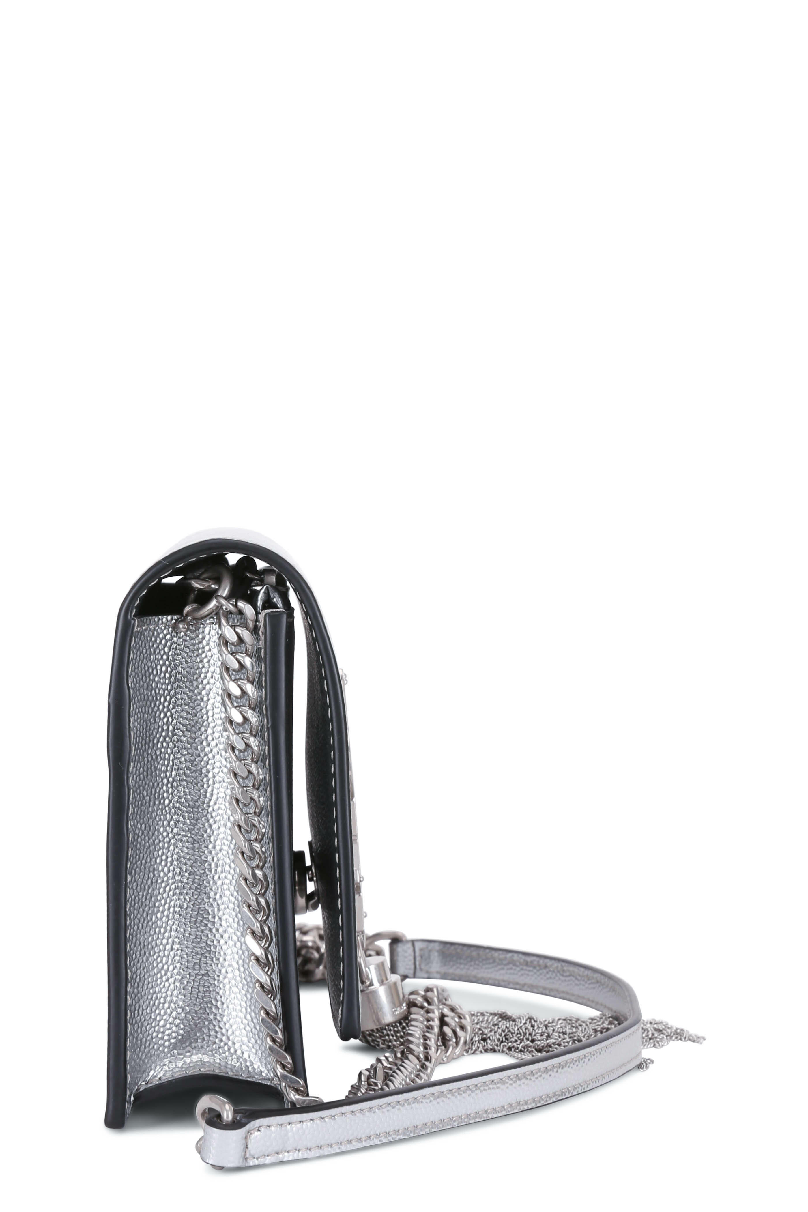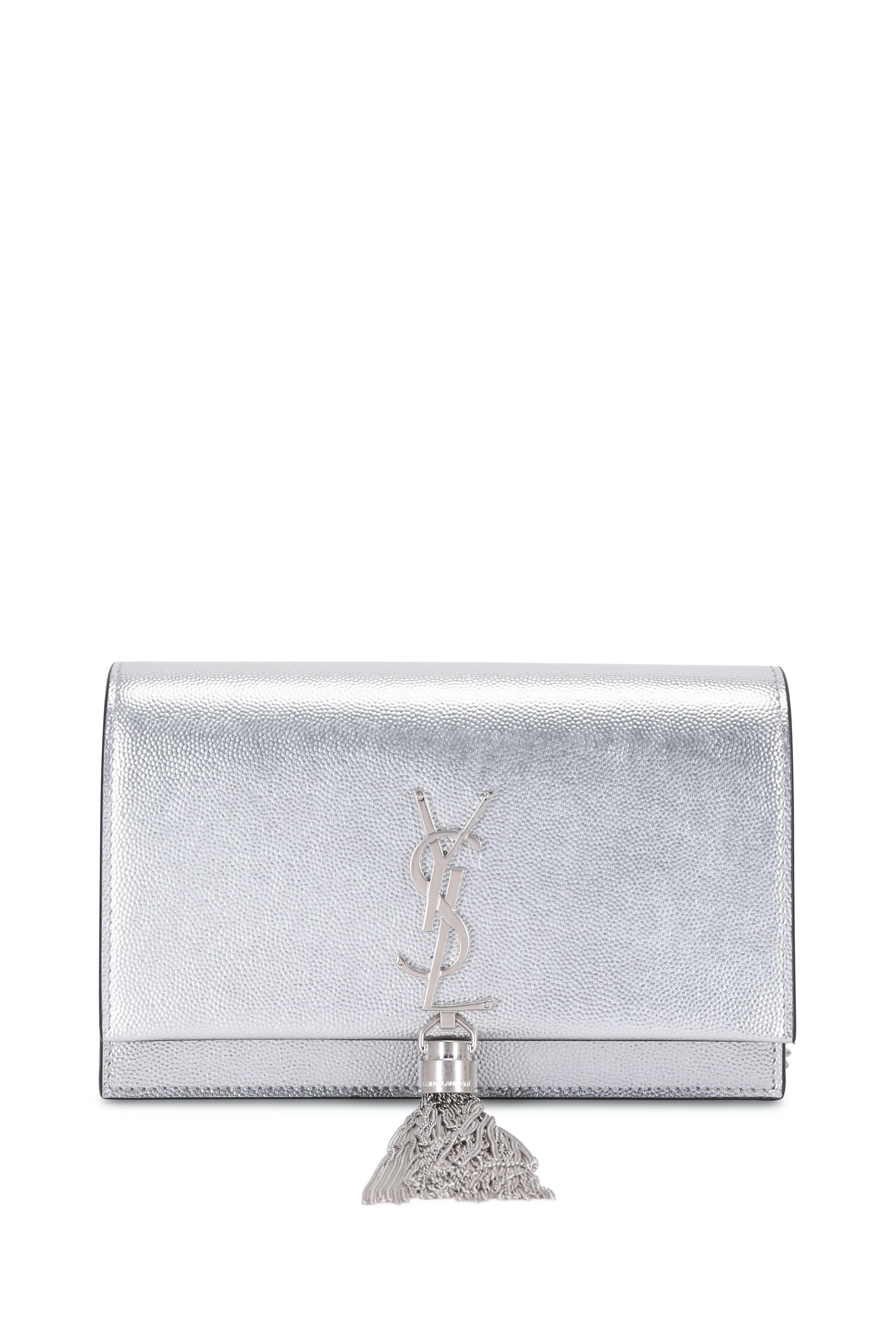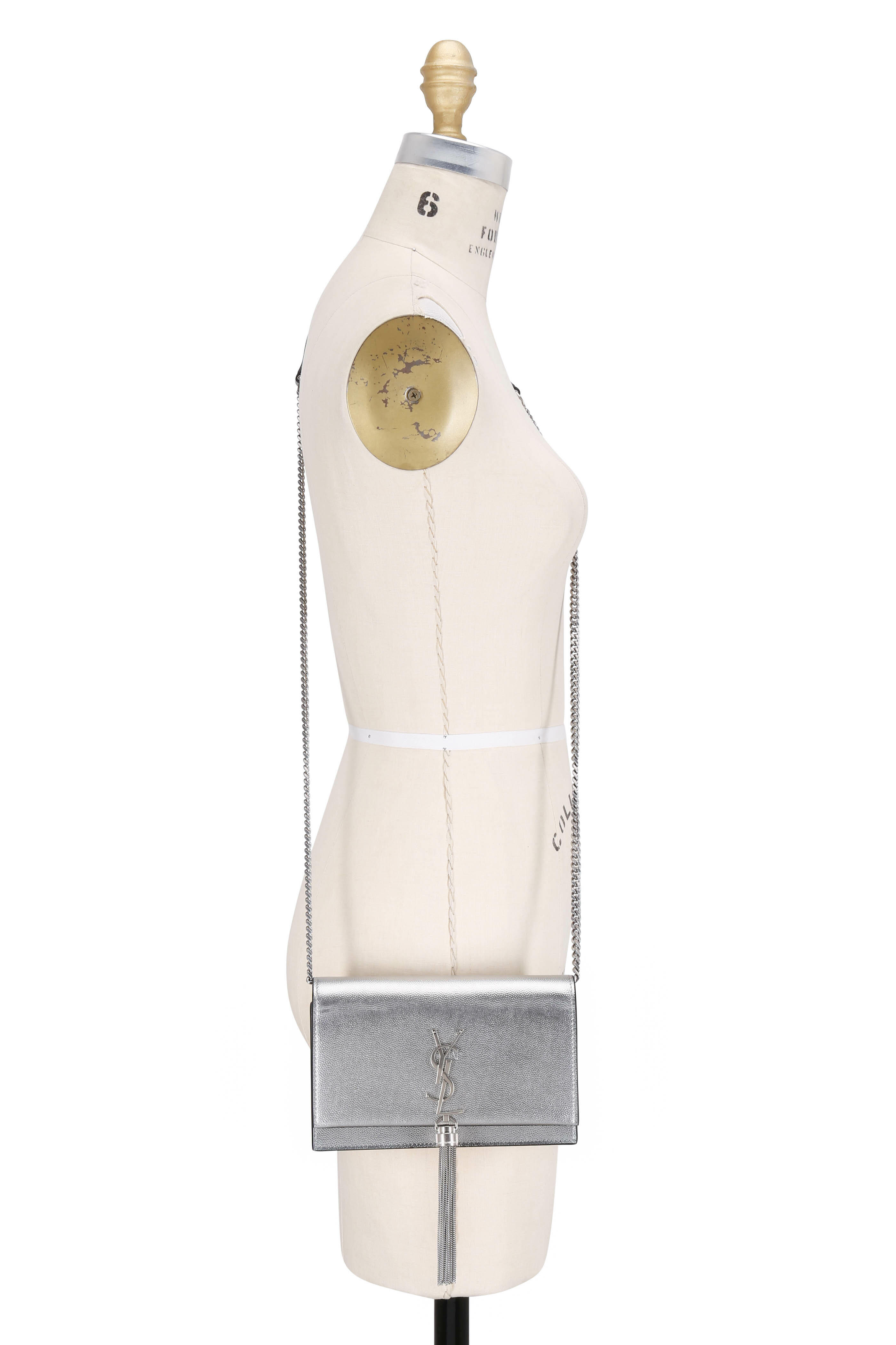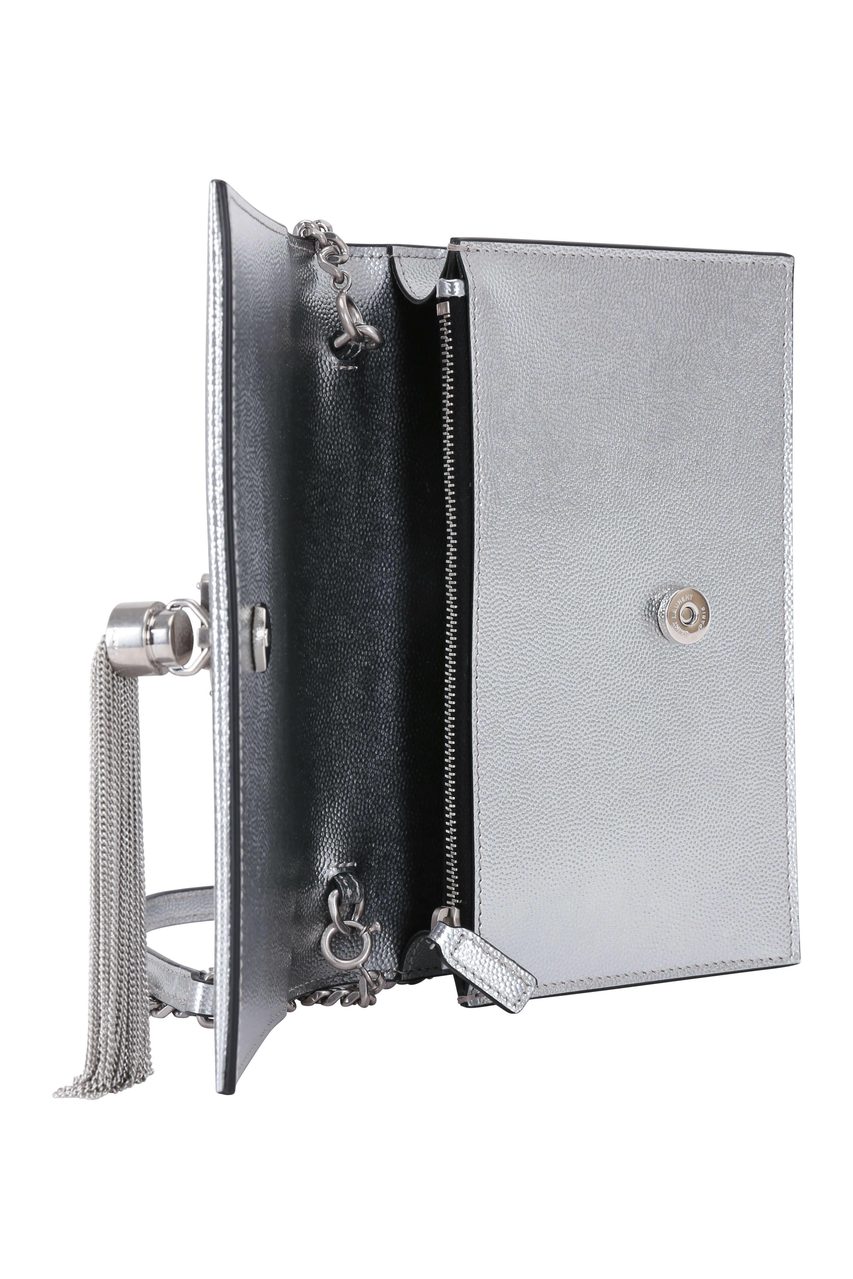 Metallic grained leather. Silver-toned detachable chain strap. Flap front with snap closure. Silver-toned YSL logo and chain tassel detail. Interior zip pocket, one slip pocket, eight card slots. Lined in suede. Made in Italy. Width: 7 ½". Height: 5". Depth: 1 ½". Strap drop: 22".