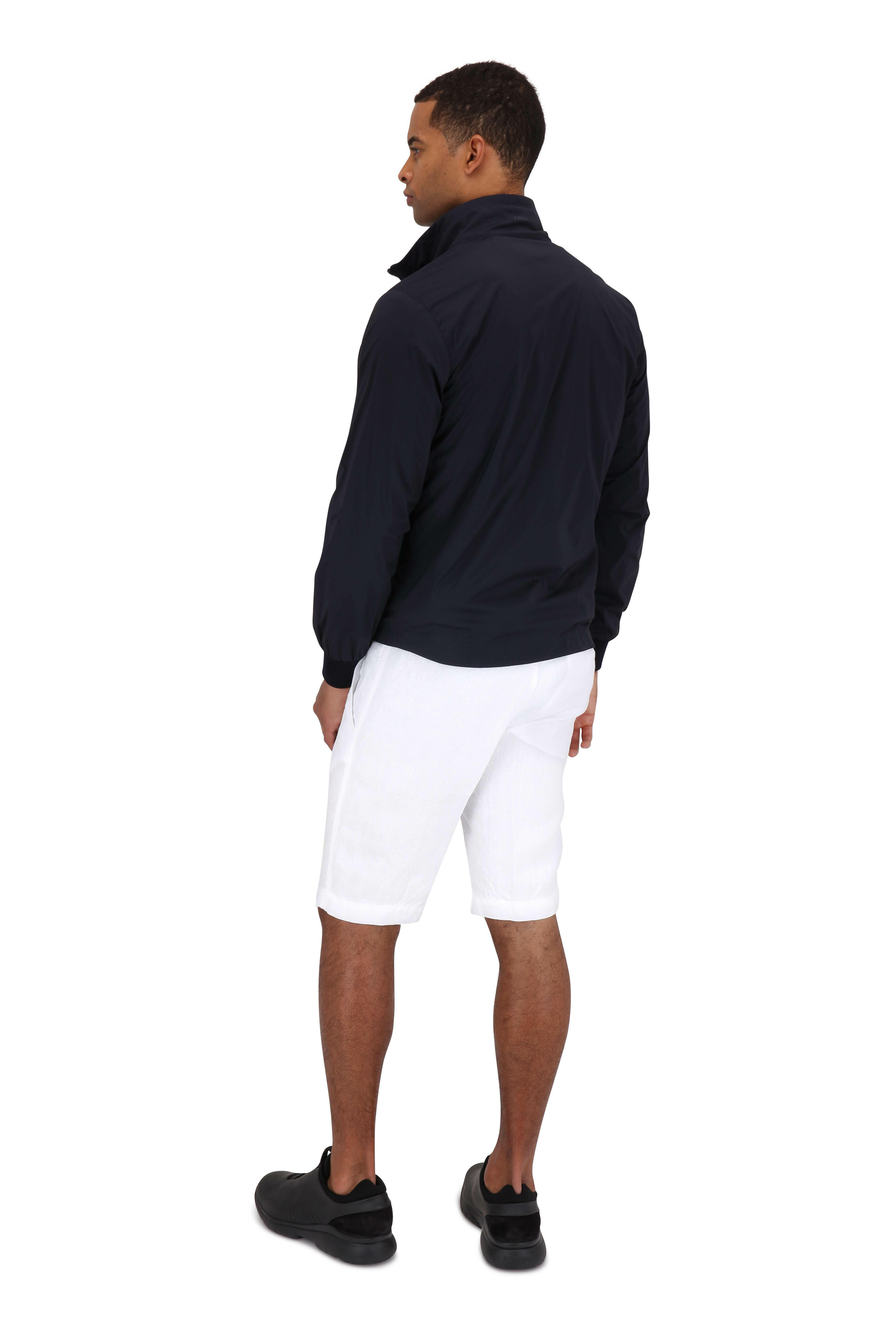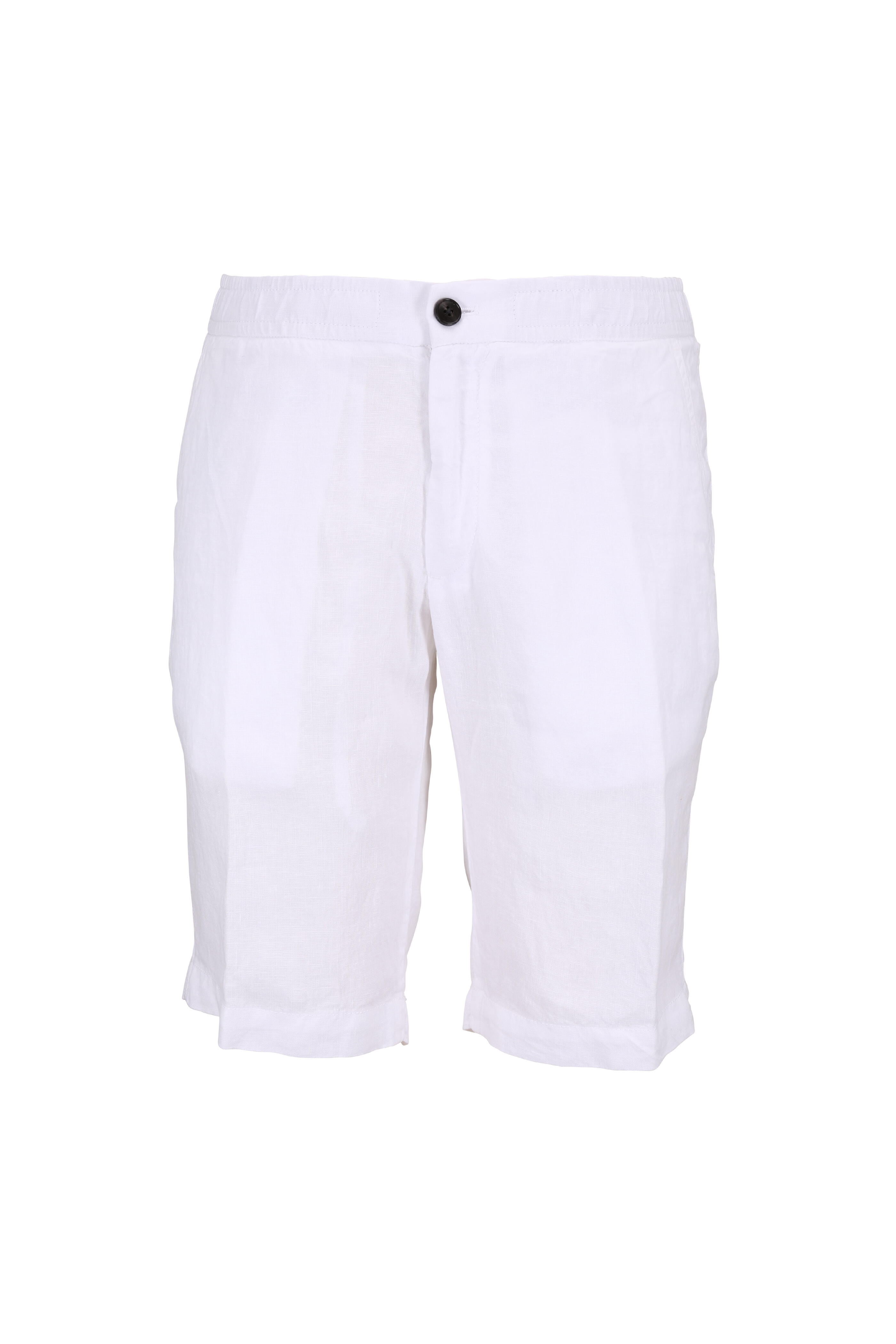 Banded waist with internal drawstring. Front slip pockets; back snap welt pocket. Imported. 11" inseam. 100% linen. Machine wash.