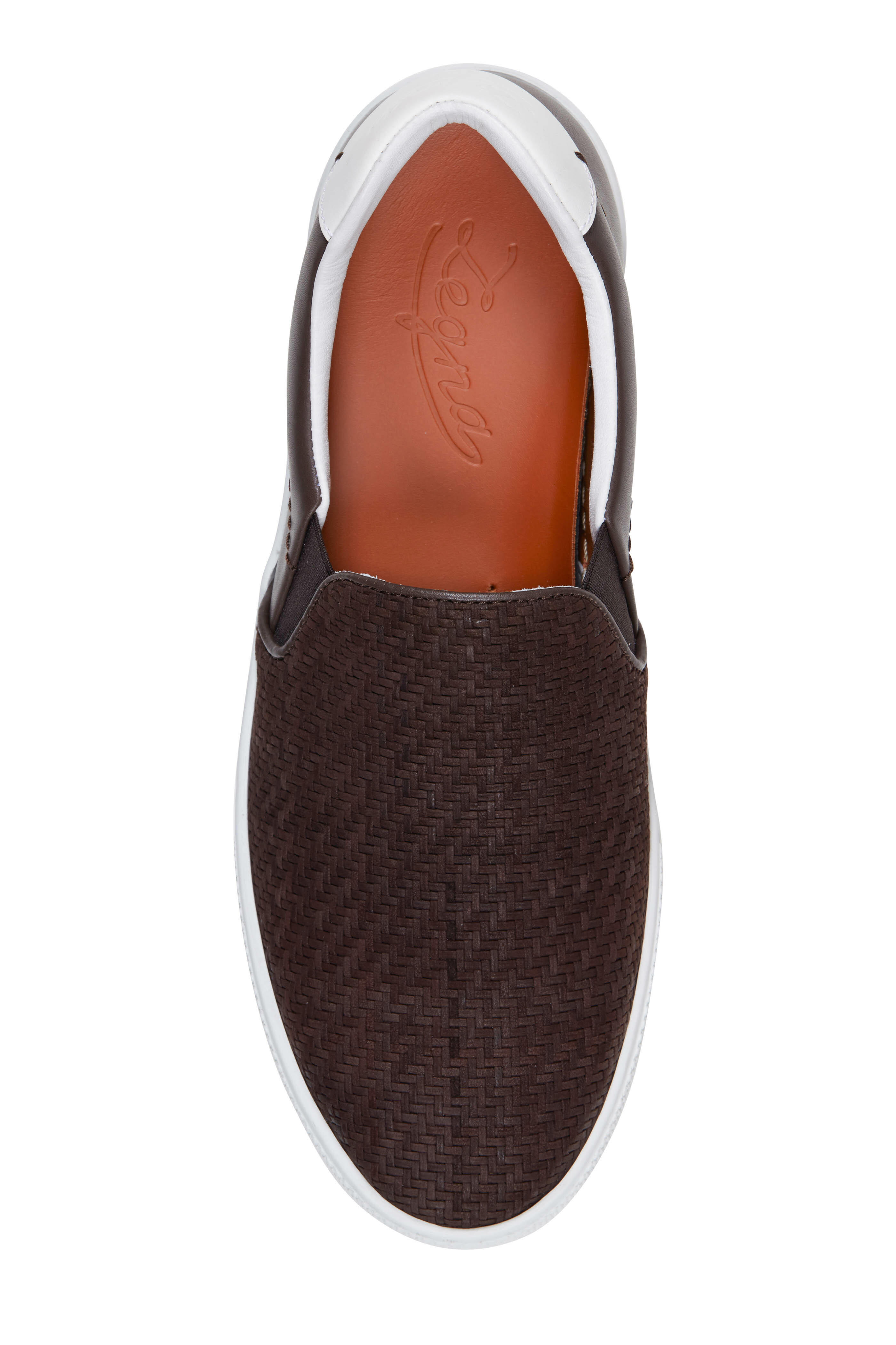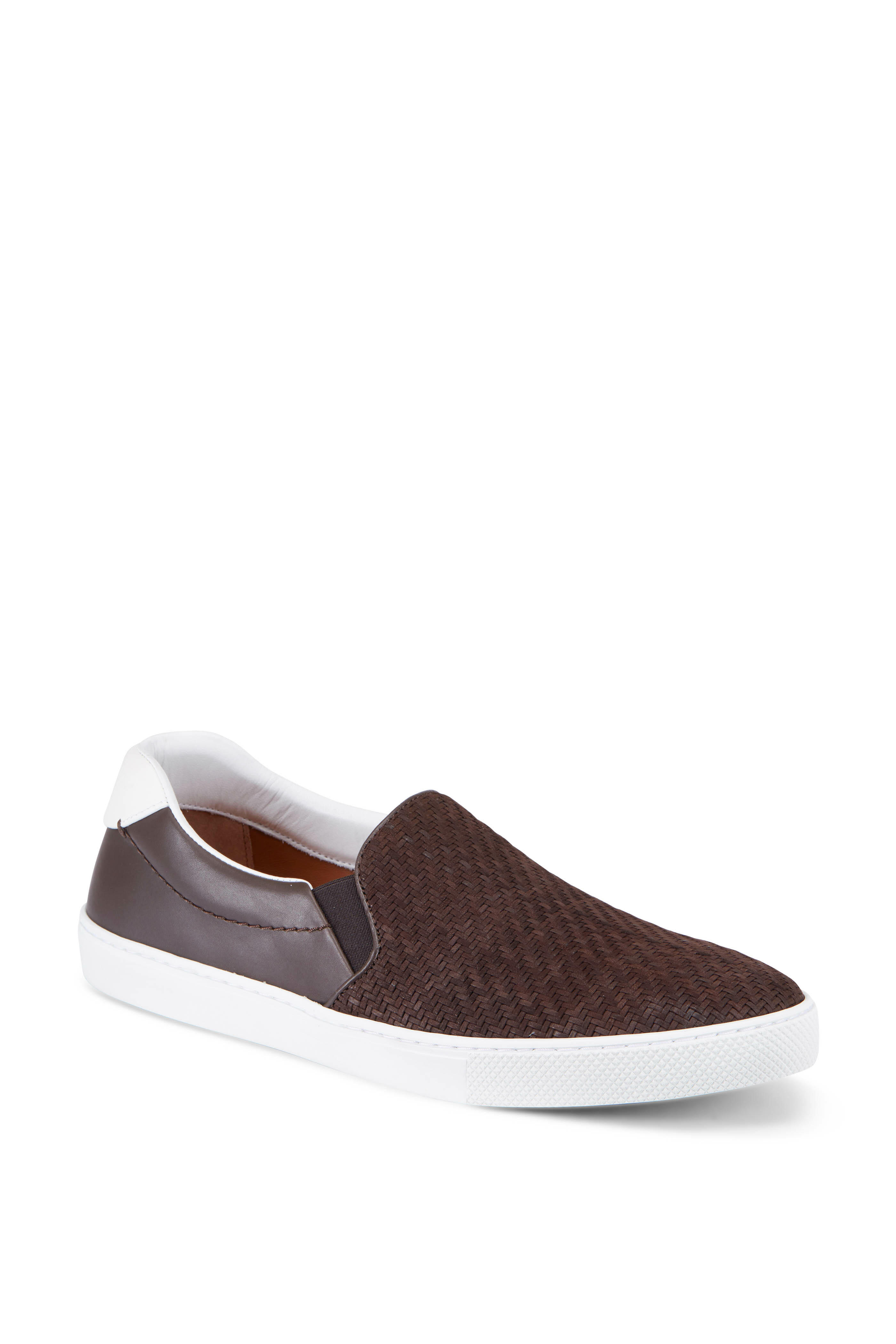 Calfskin woven and smooth leather upper. Round toe. Elastic side gores at vamp. Leather lining, cushioned insole. Rubber sole. Made in Portugal.