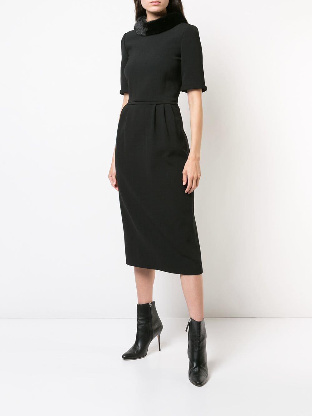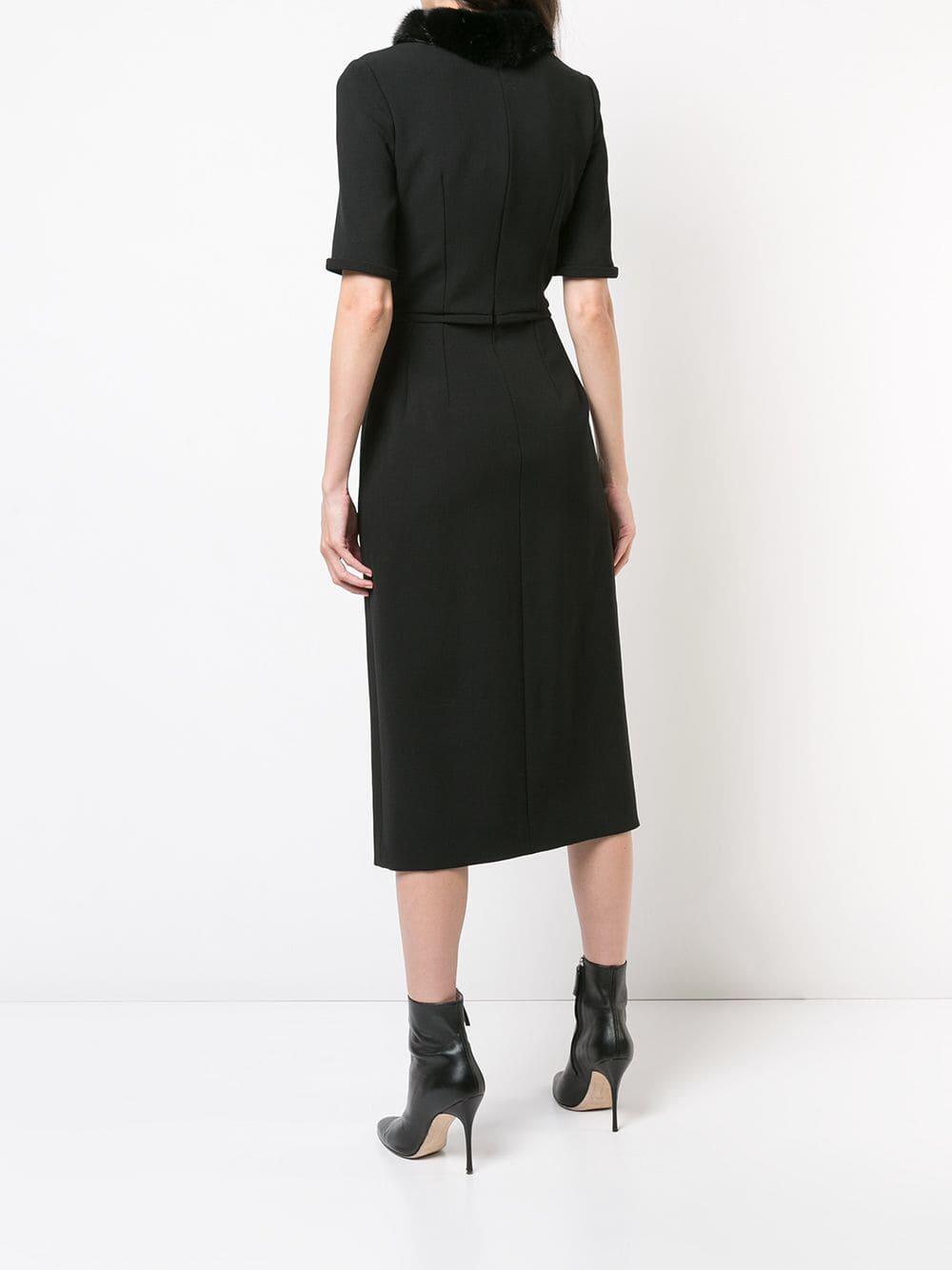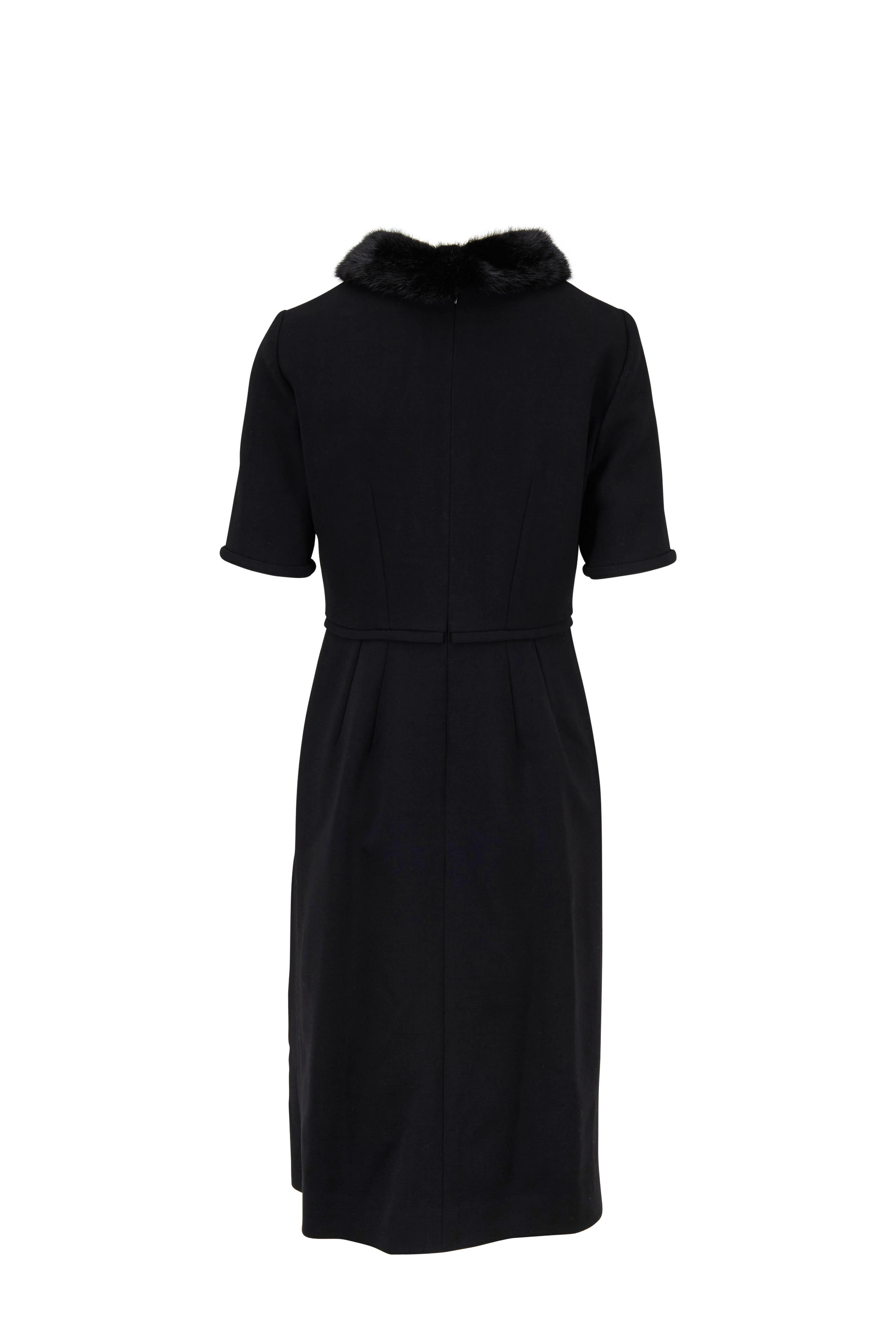 Detachable fur collar. Concealed back zip closure. Folded cuffs. Bust darts. Made in the USA. 42" shoulder to hem. 96% virgin wool, 4% elastane; lining: 100% silk; trim: mink (USA). Dry clean.
