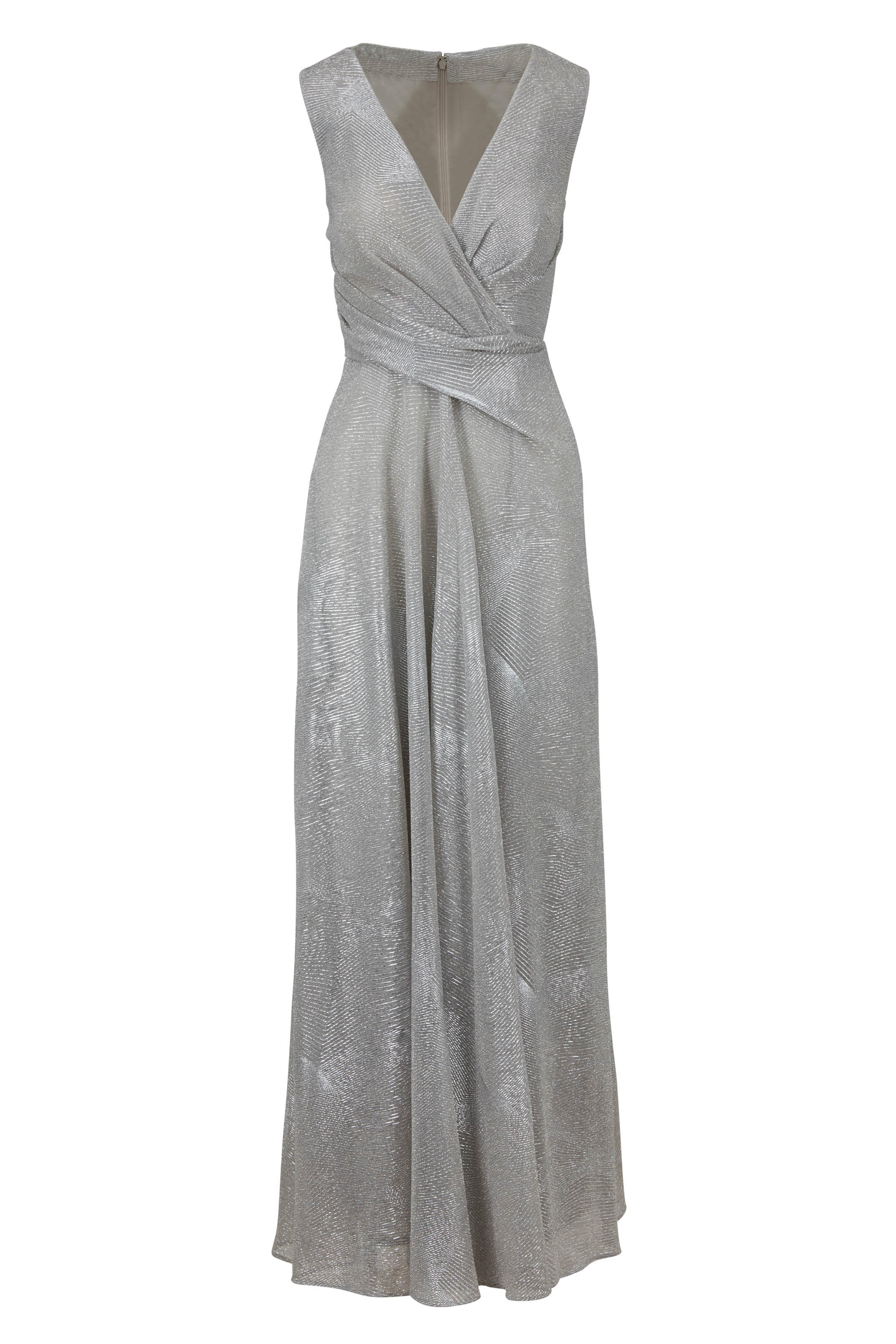 Deep v-neckline. Concealed back zip closyre. Cross-over detail at waist. Full flowy skirt. Made in Germany. 100% polyester; lining: 85% cupro, 15% elastane. Dry clean.