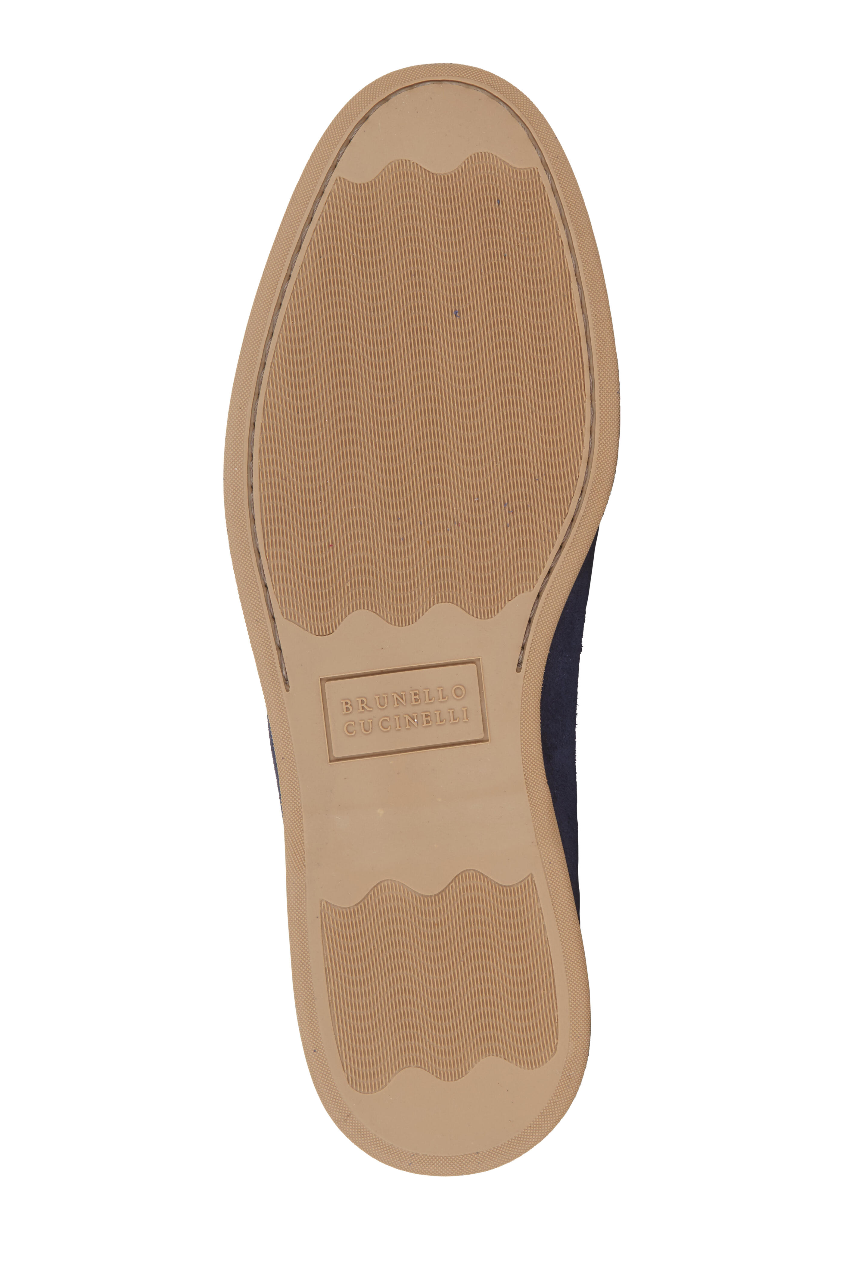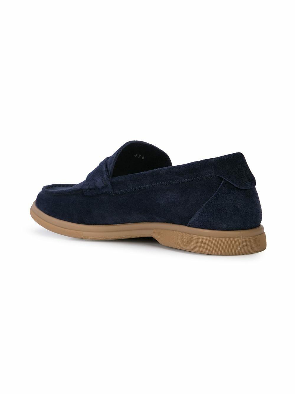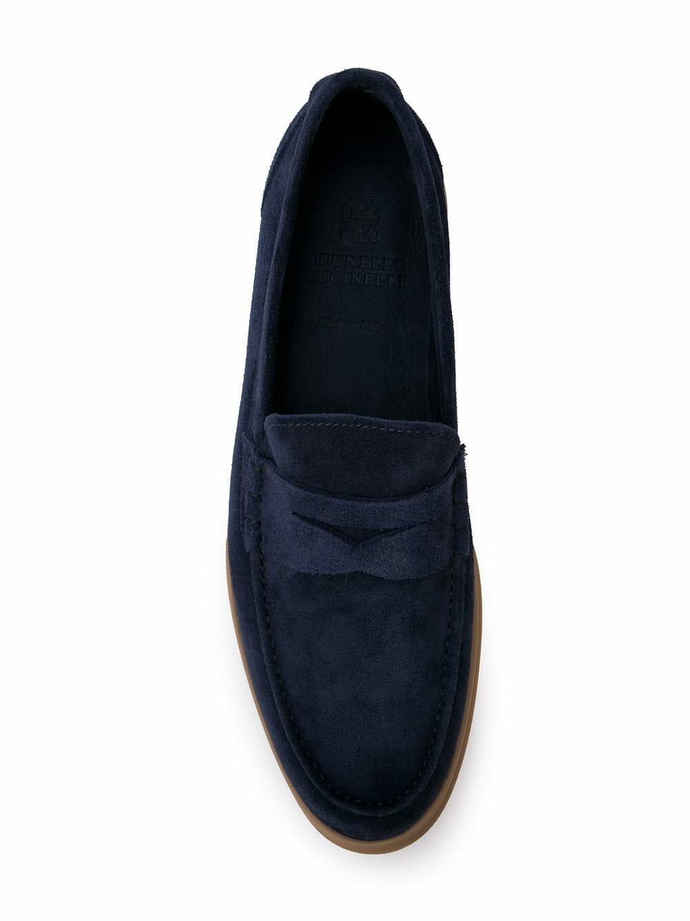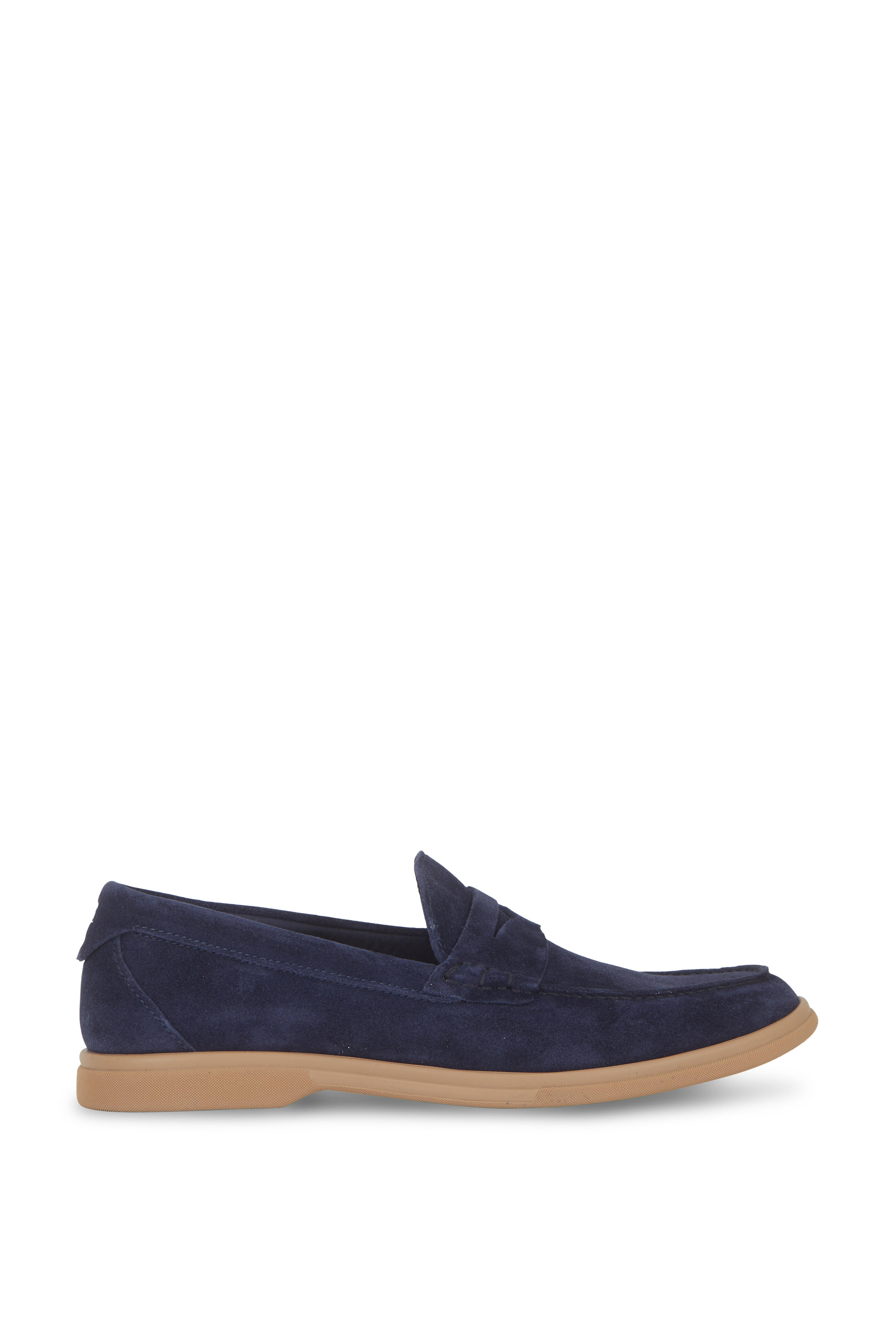 Calfskin suede upper. Moc toe. Tonal top-stitching. Penny strap across vamp. Leather lining, cushioned insole. Rubber sole. Made in Italy.