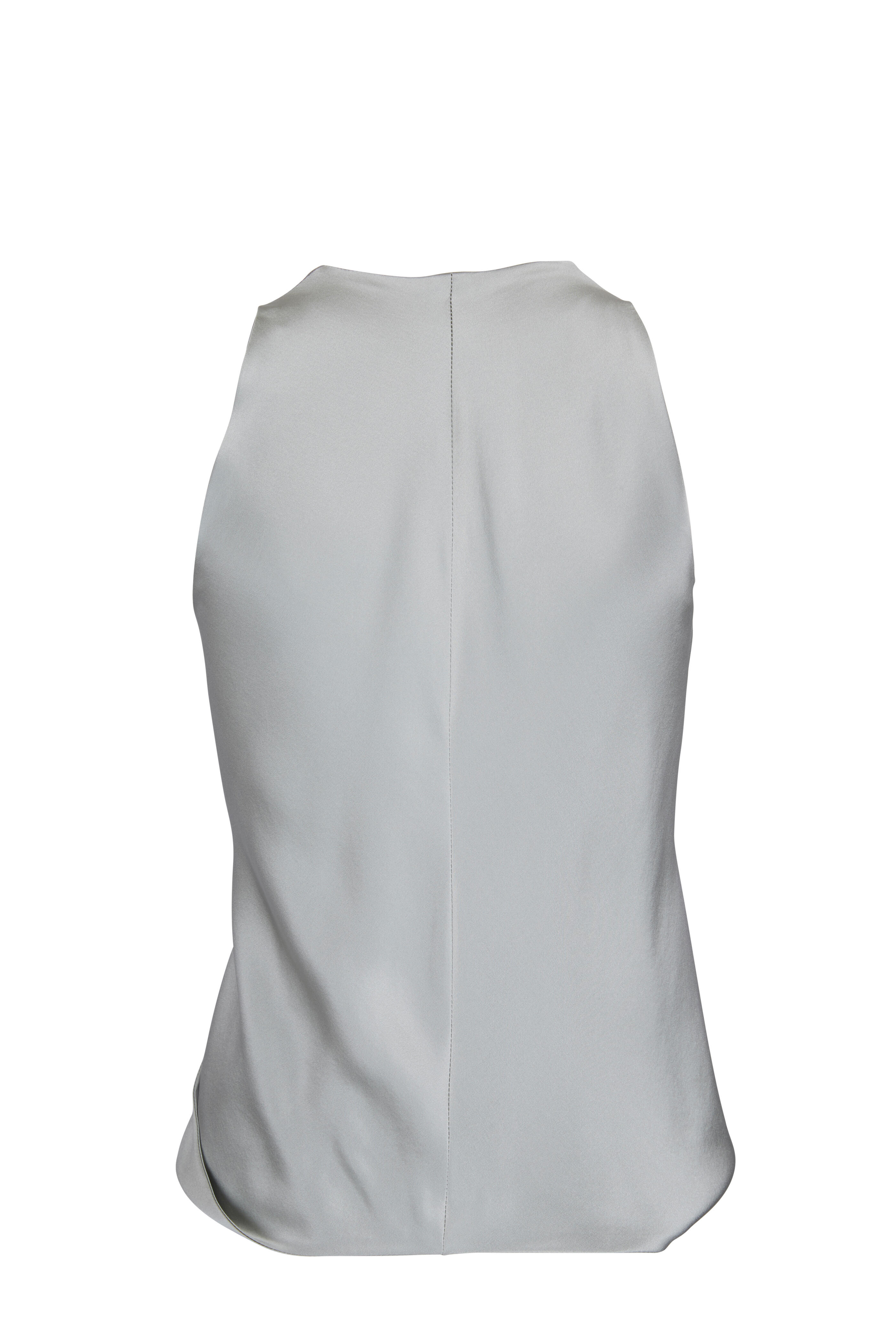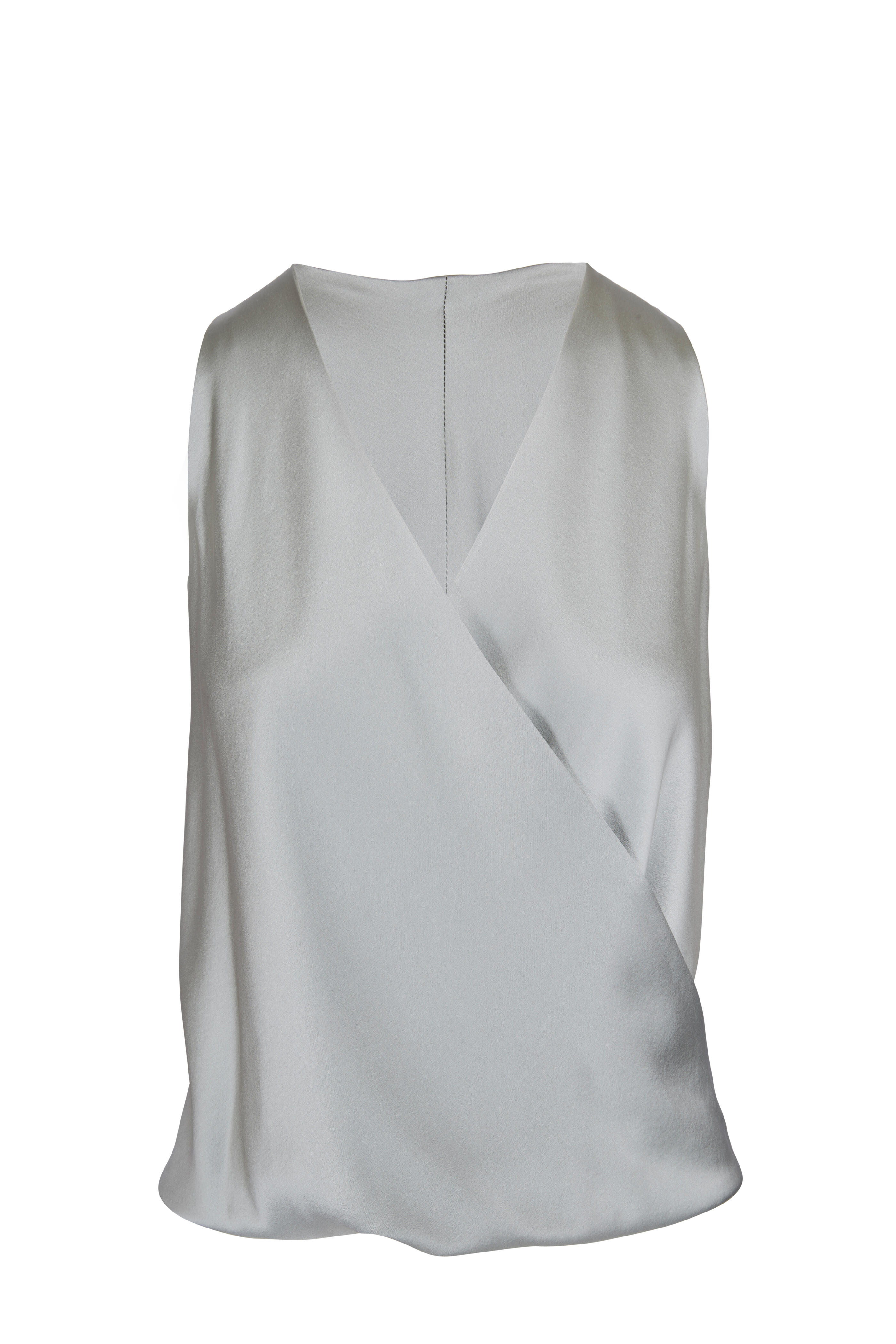 Draped v-neckline. Made in the USA. 100% silk. Dry clean.