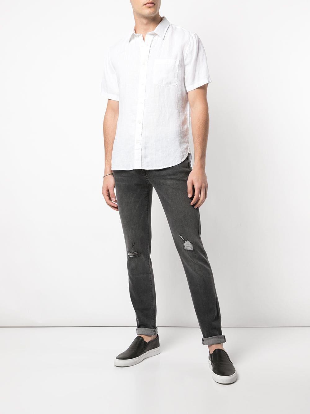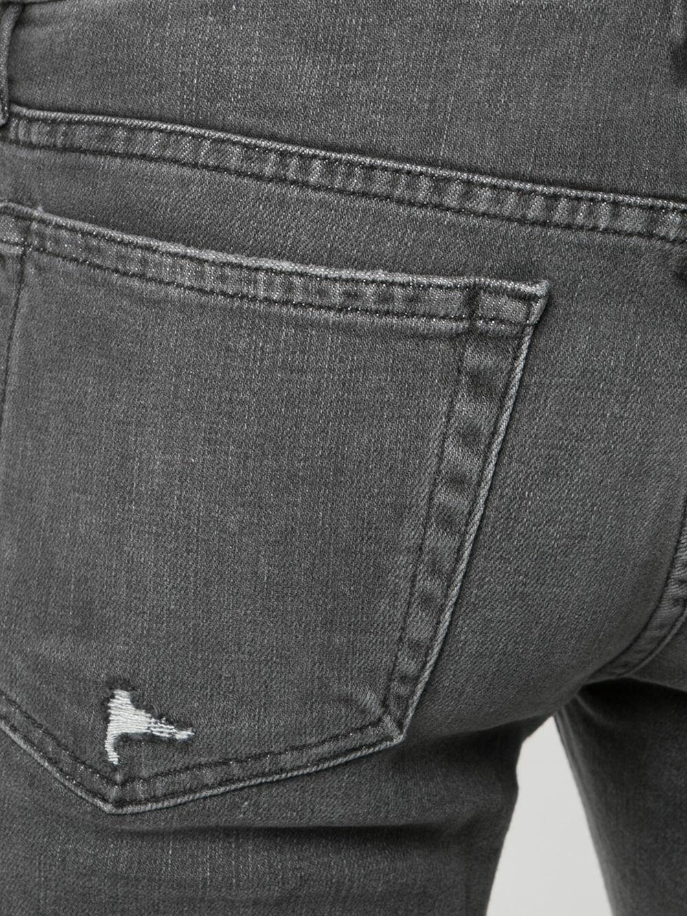 Five pocket styling. Distressed details. Made in the USA. Inseam: 32". Leg opening: 14". Rise: 11". 95% cotton, 4% polyester, 1% elastane. Machine wash.