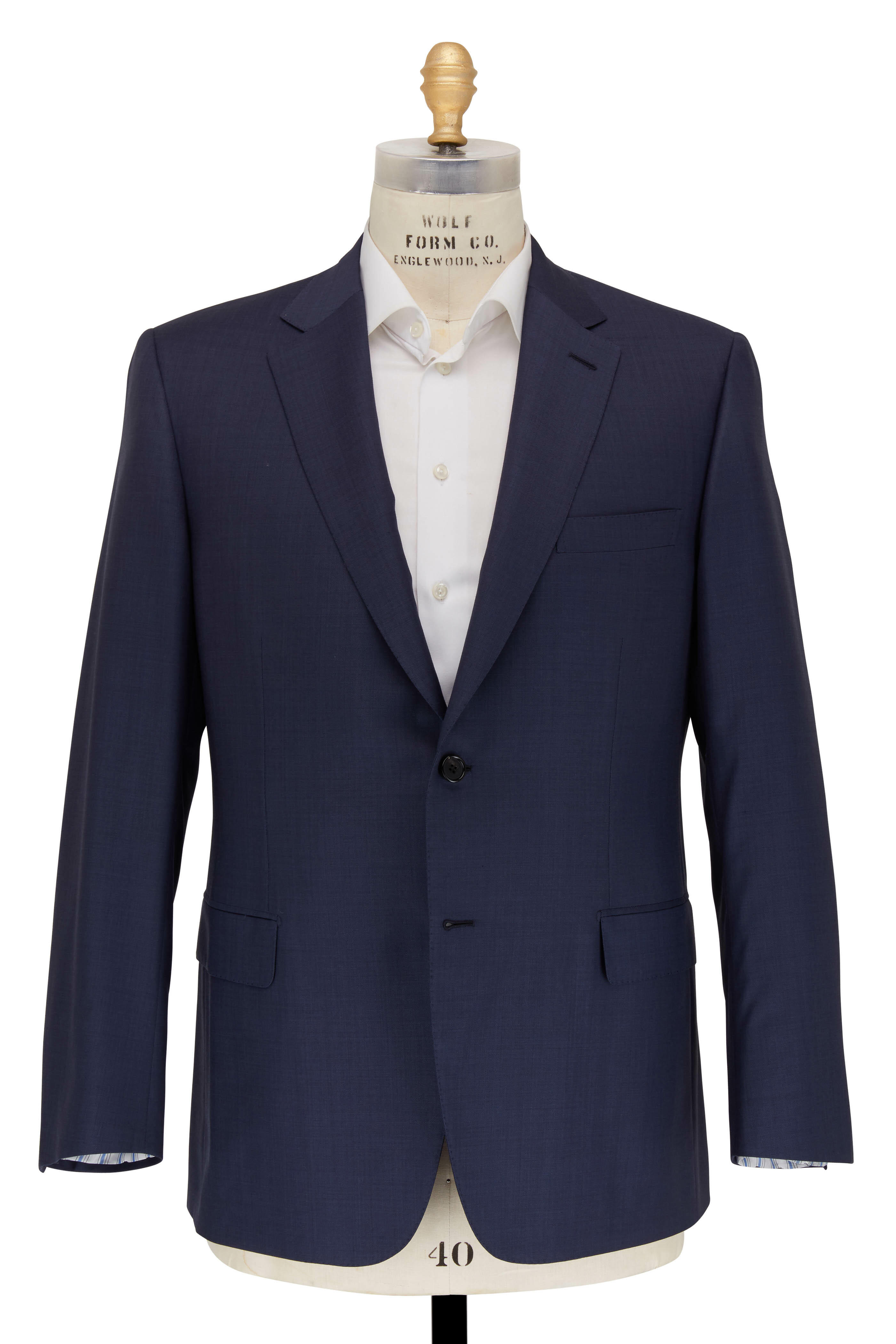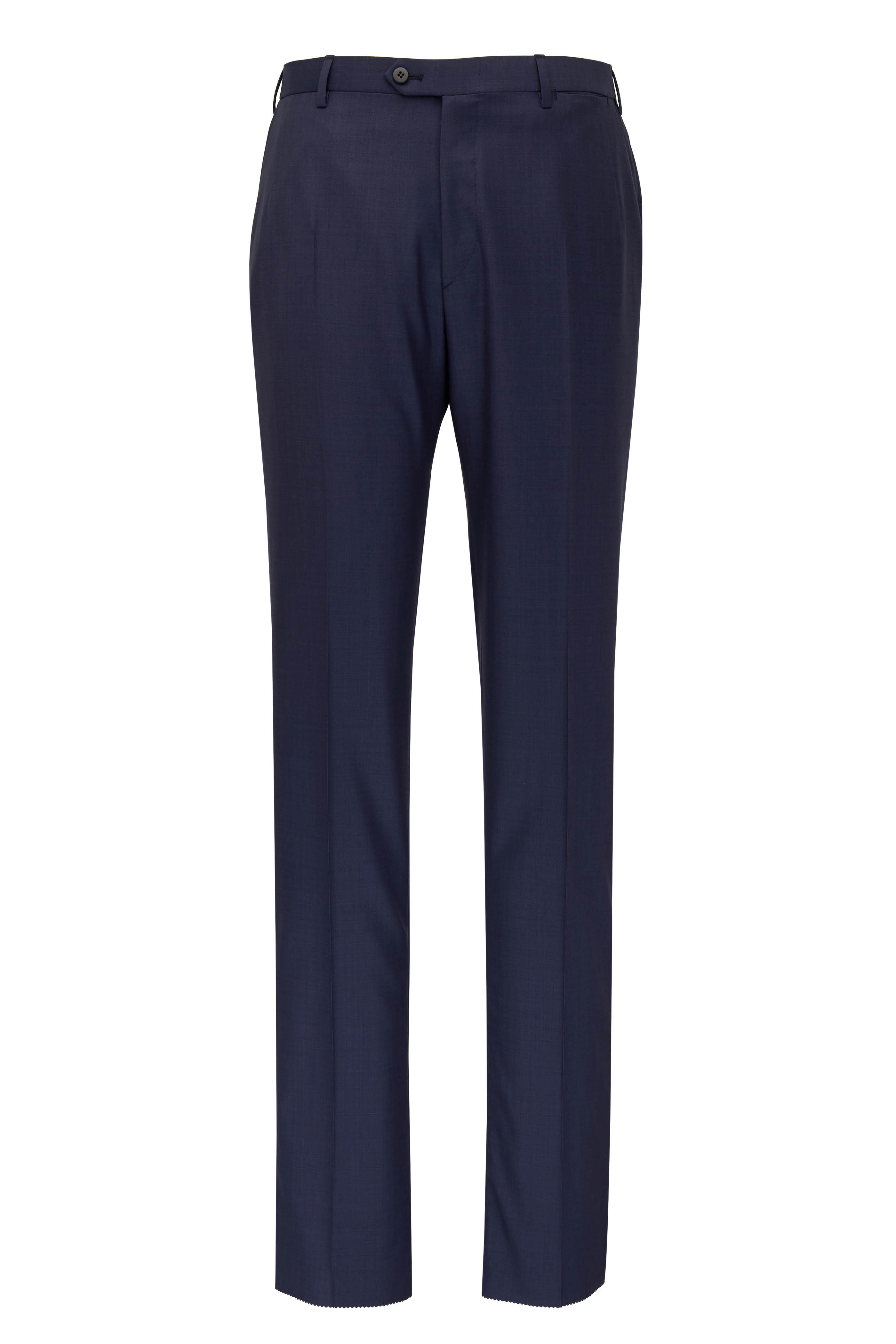 Super 160s wool. Made in Italy. Jacket: Fully lined. Notched lapels. Two button closure. Chest welt pocket, lower flap pockets. Double vent. Pants: Side slip pockets, back button besom pockets, ticket pocket. Unfinished hem. Dry clean.