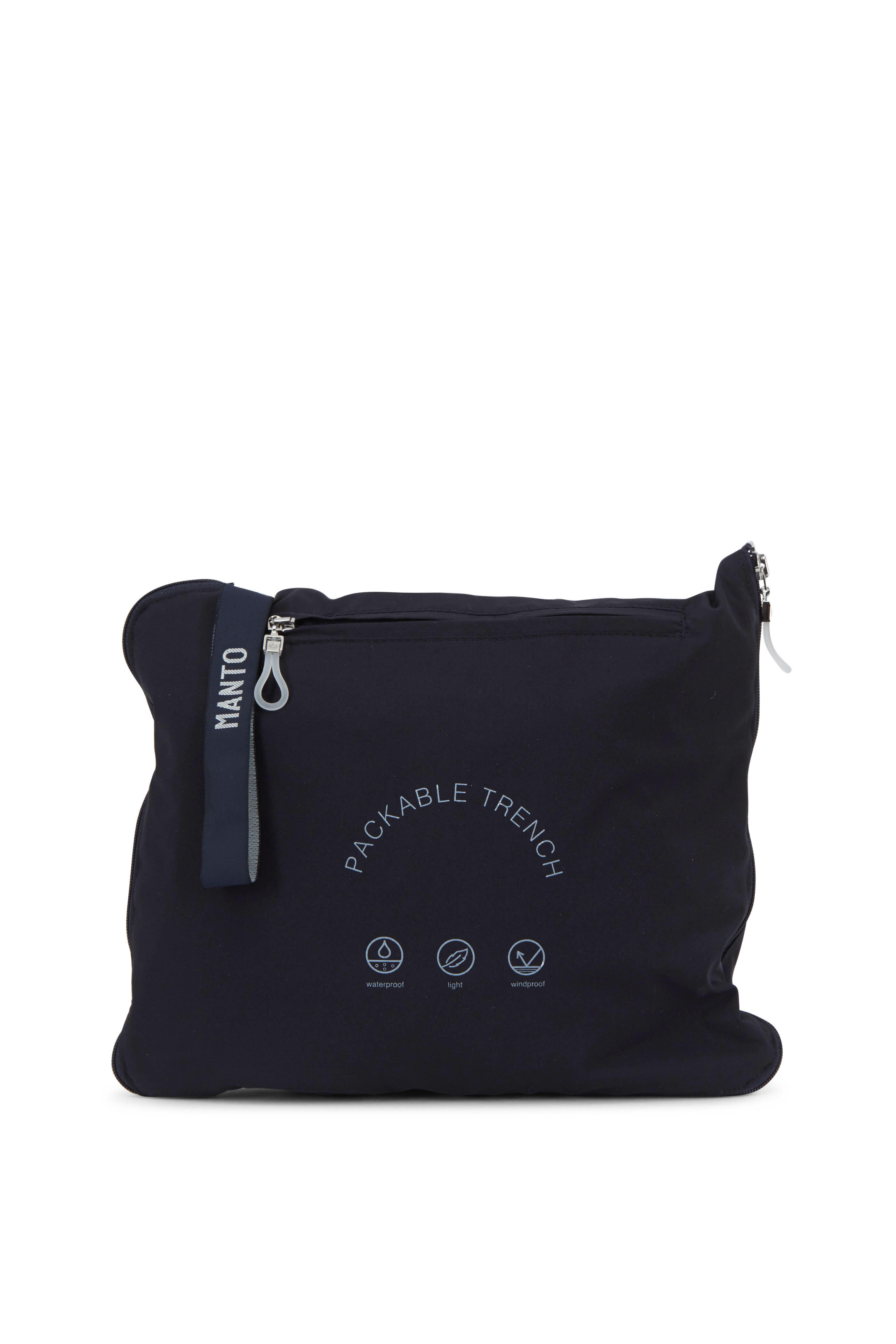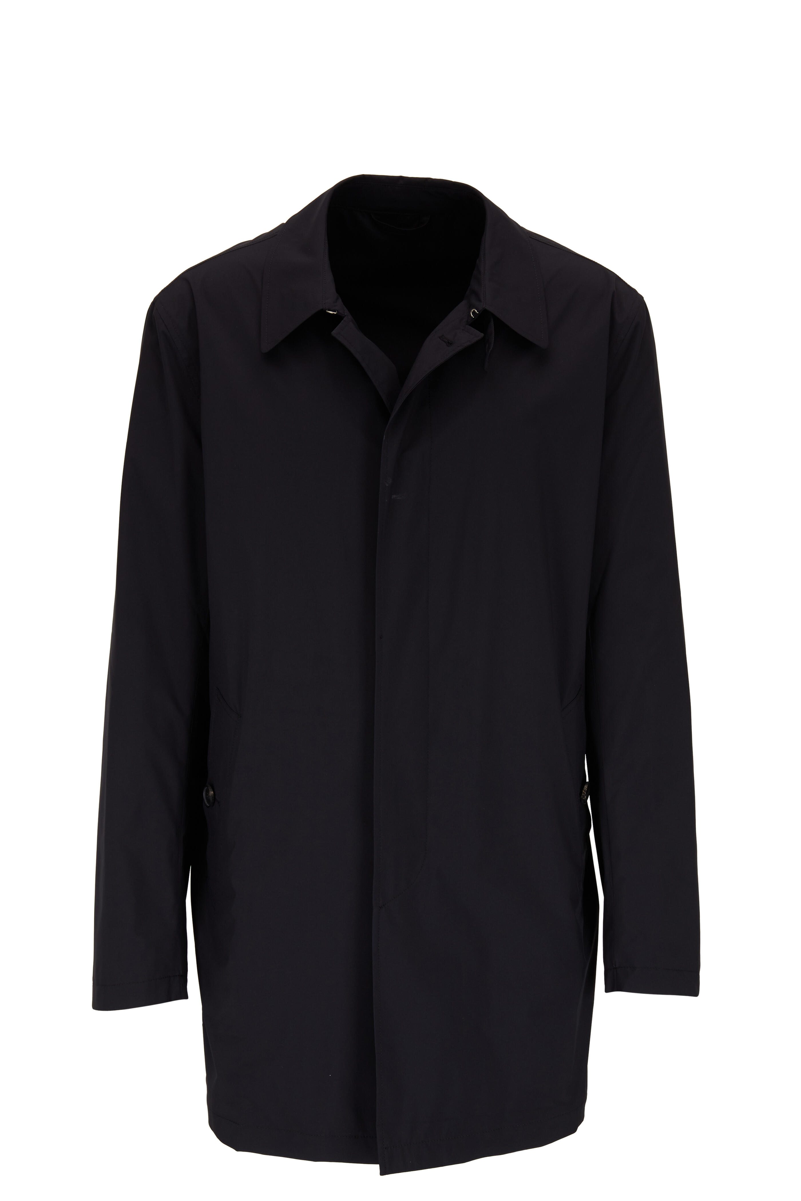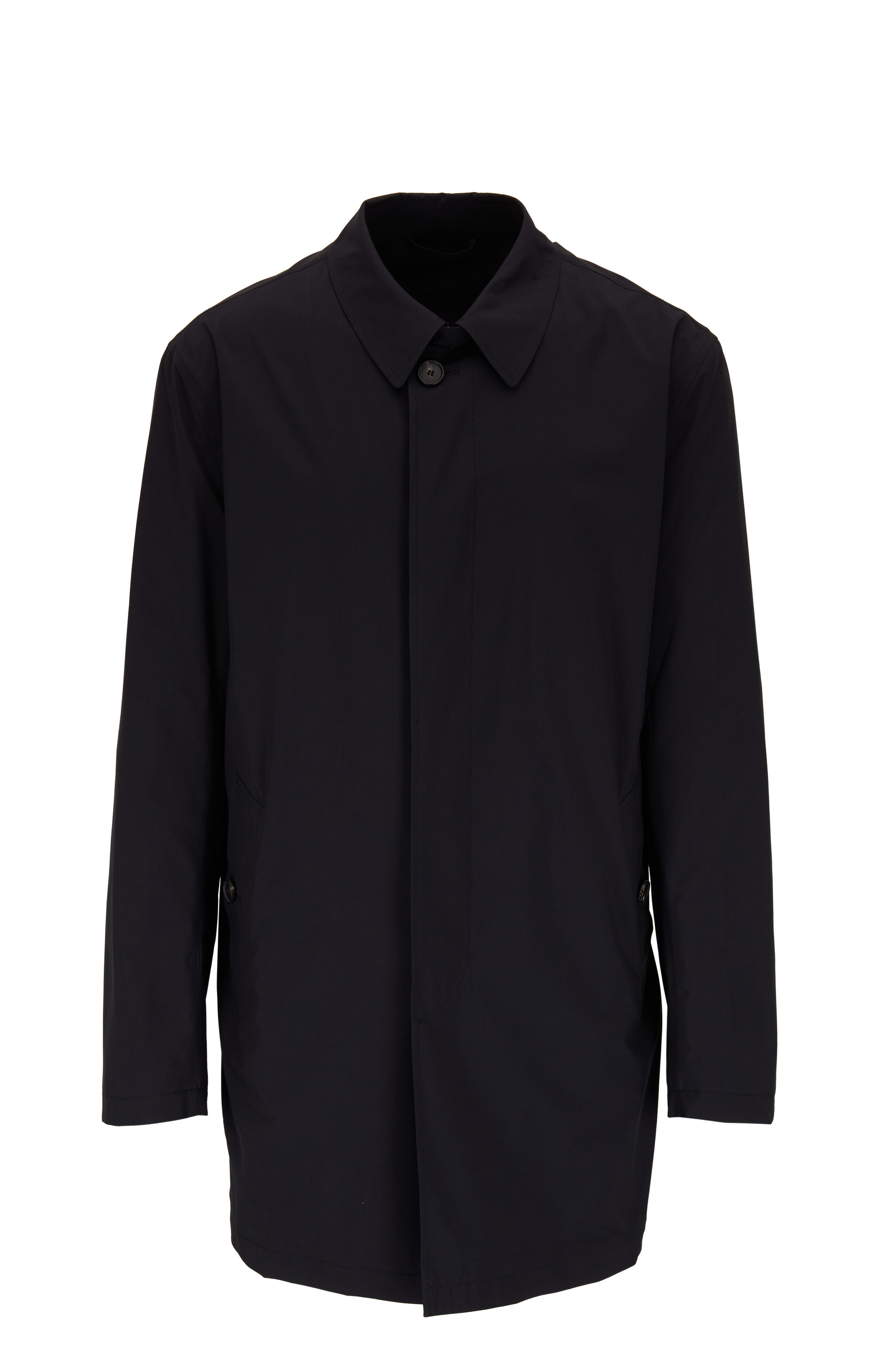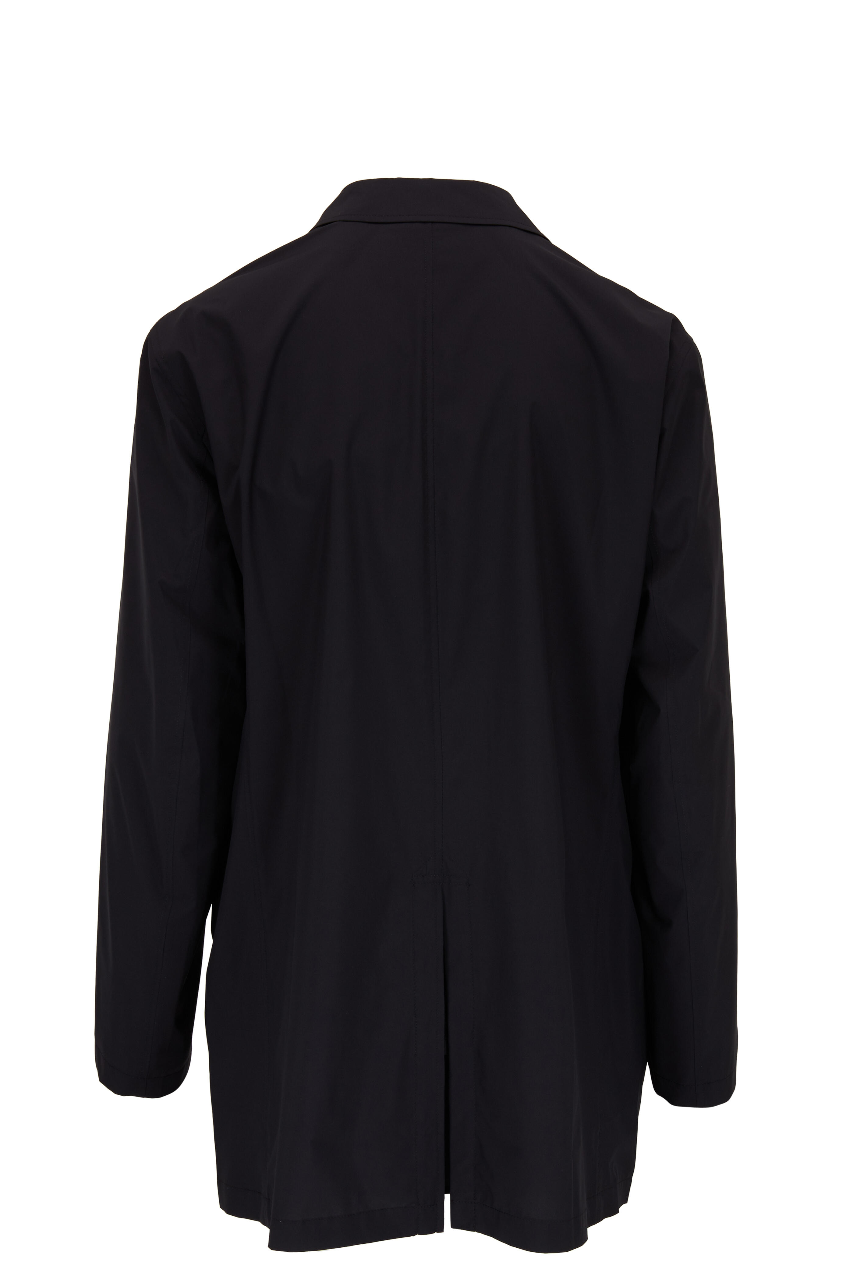 Spread collar. Concealed button front closure. Lower front button-welt pockets. Back vent with button. Made in Italy. Completely folds into-itself.. 100% polyester. Dry clean.
