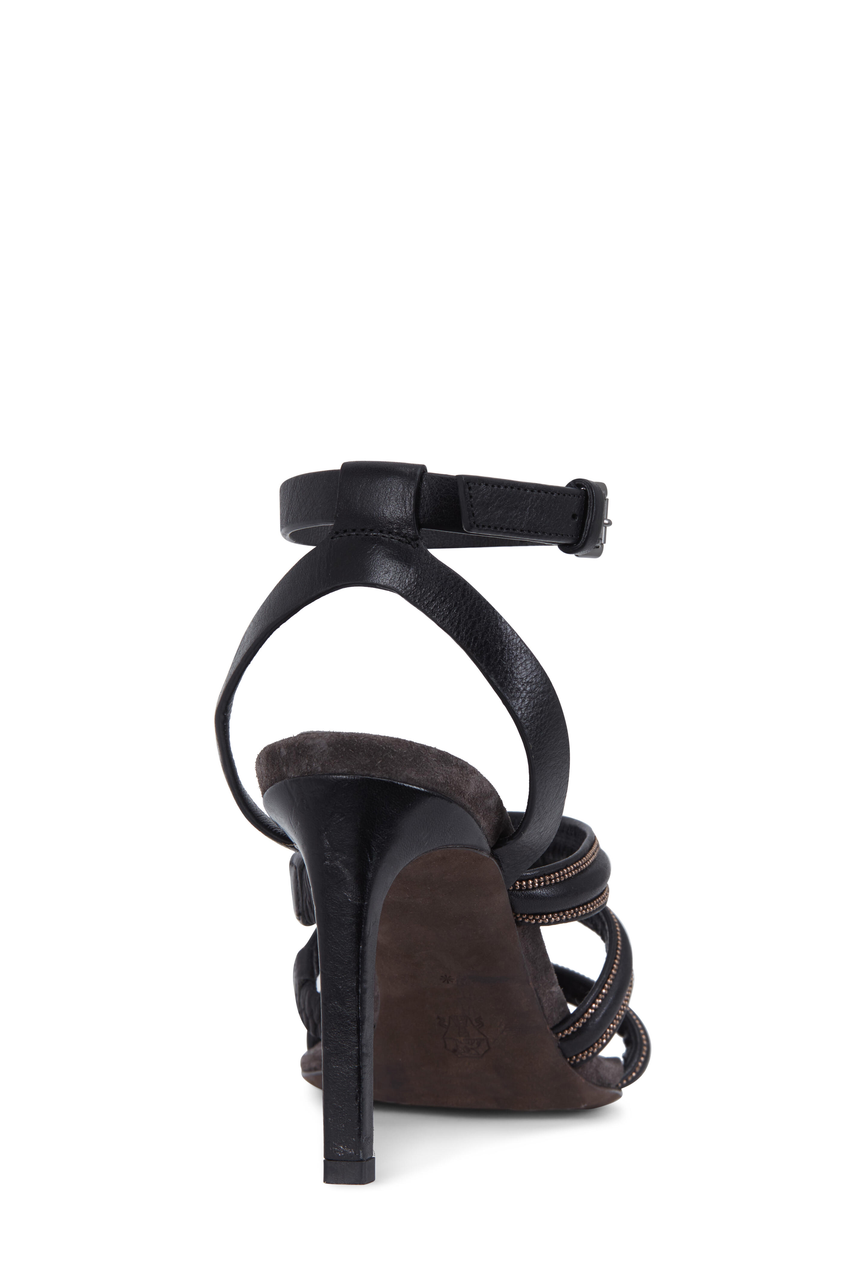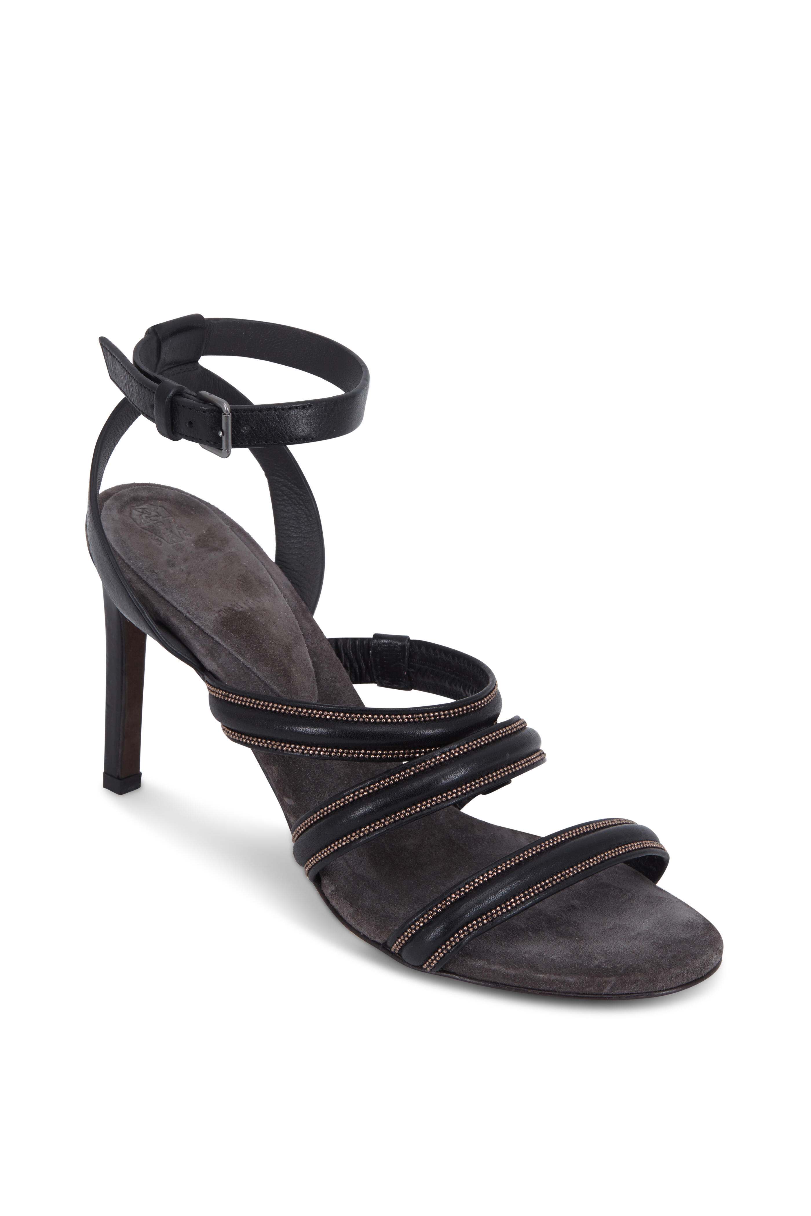 Calfskin leather. Almond open toe. Three monili detail bands at vamp. Ankle strap, adjustable buckle. Leather lining, suede insole. Self covered heel;. Leather sole. Made in Italy. Heel measurement: 80mm (3 ¼").
