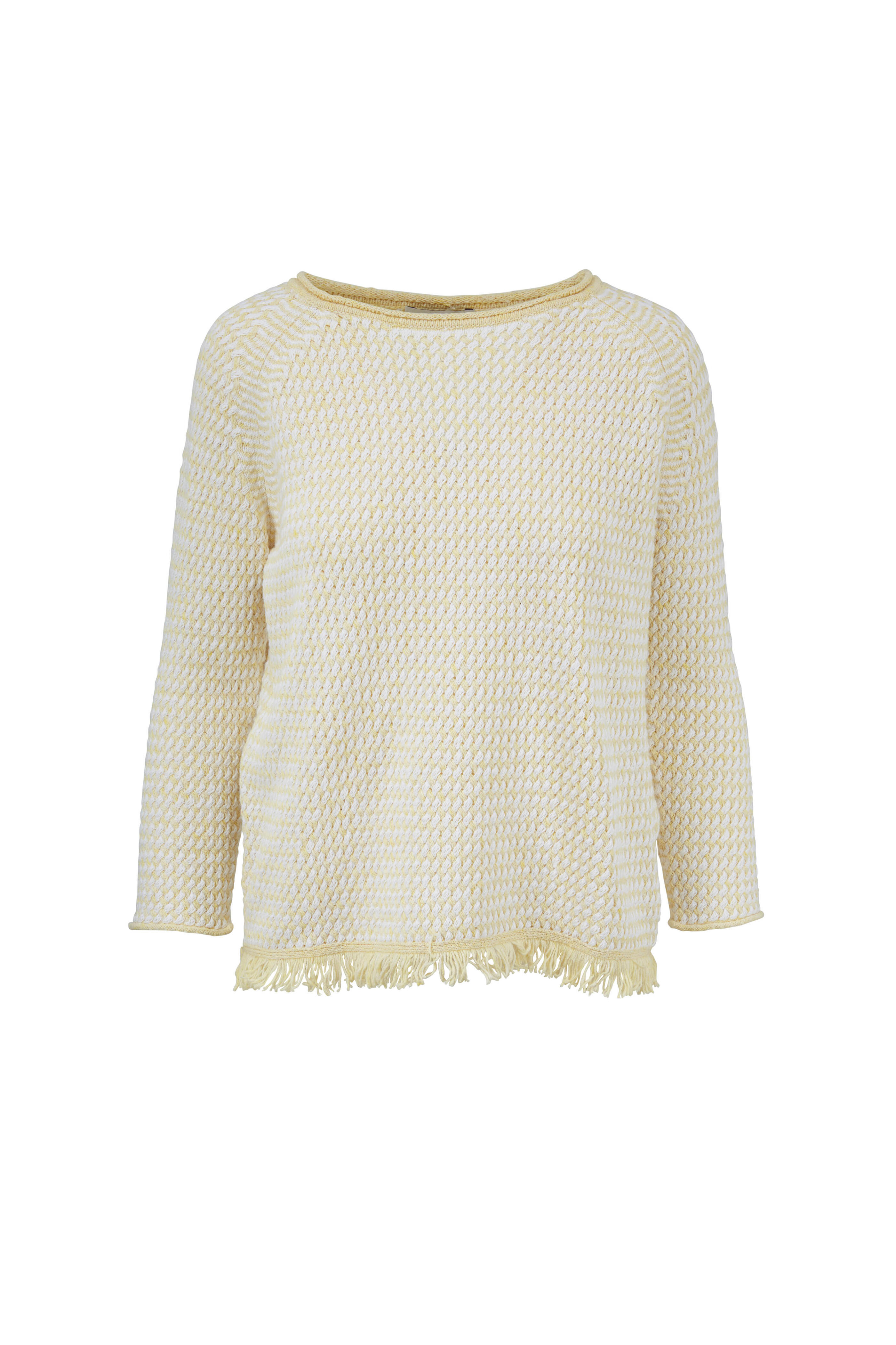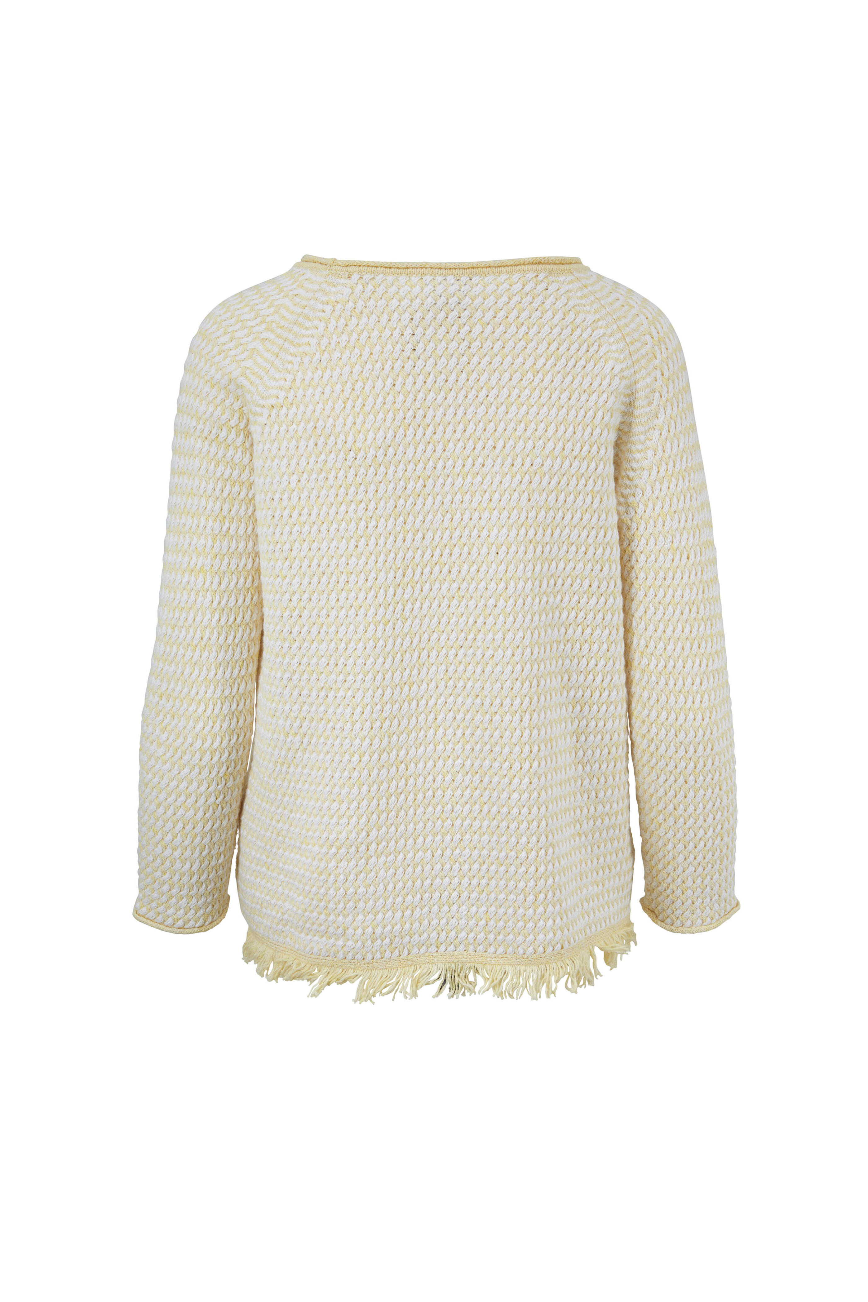 Round neckline. Raglan sleeves. Fringe hem. Imported. 100% cotton. Hand wash.