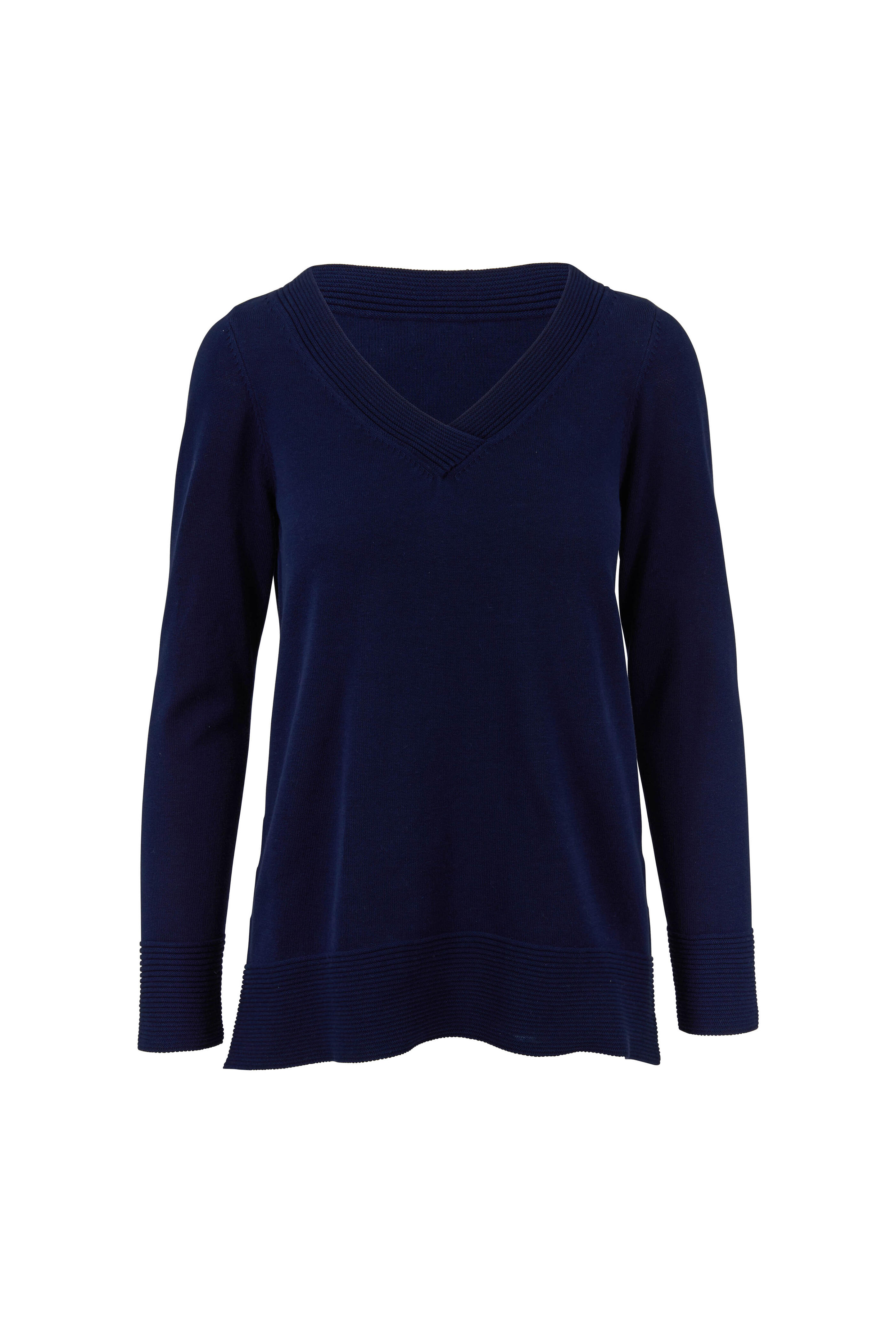 V-neckline. Ribbed trim. Imported. 100% cotton. Hand wash.