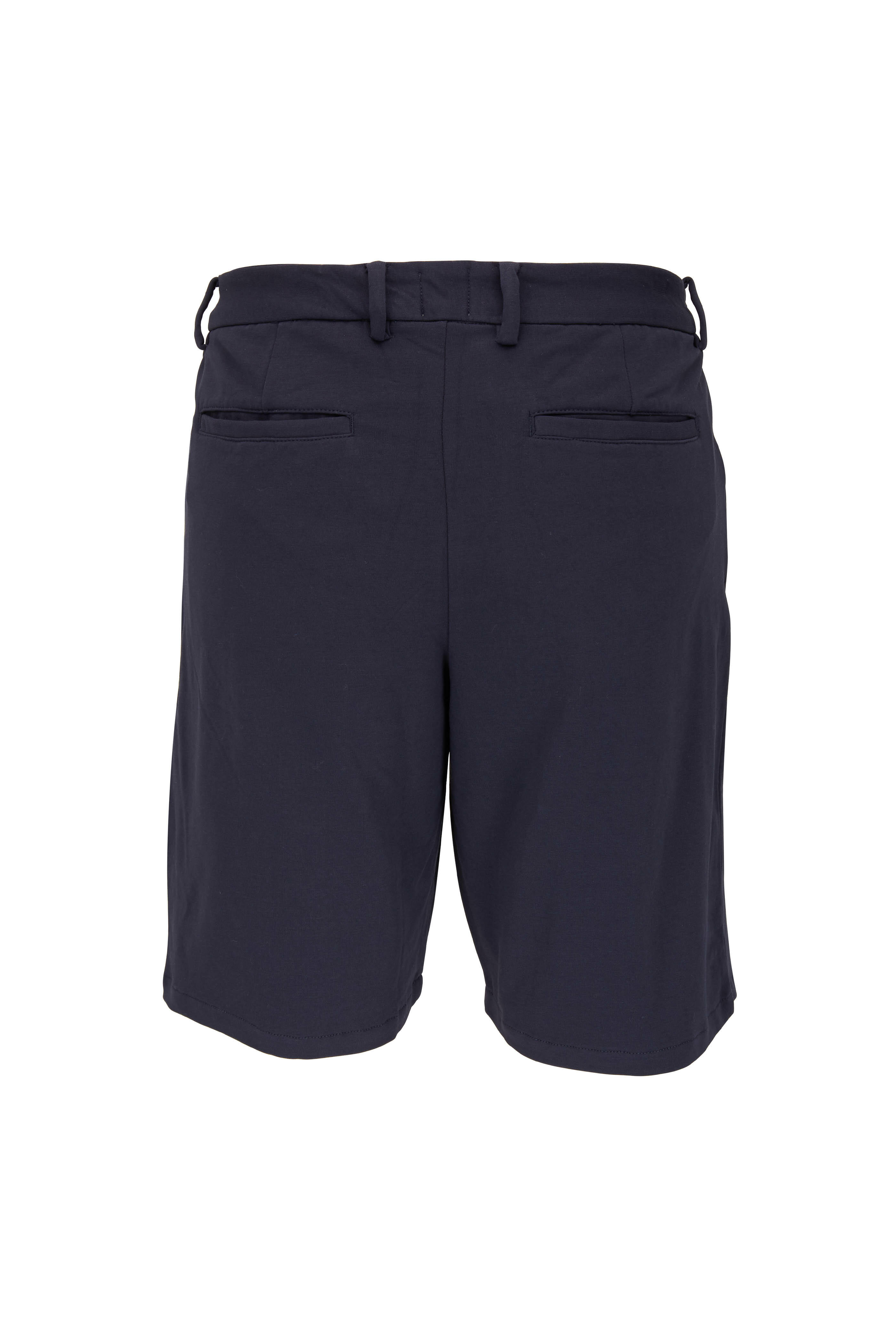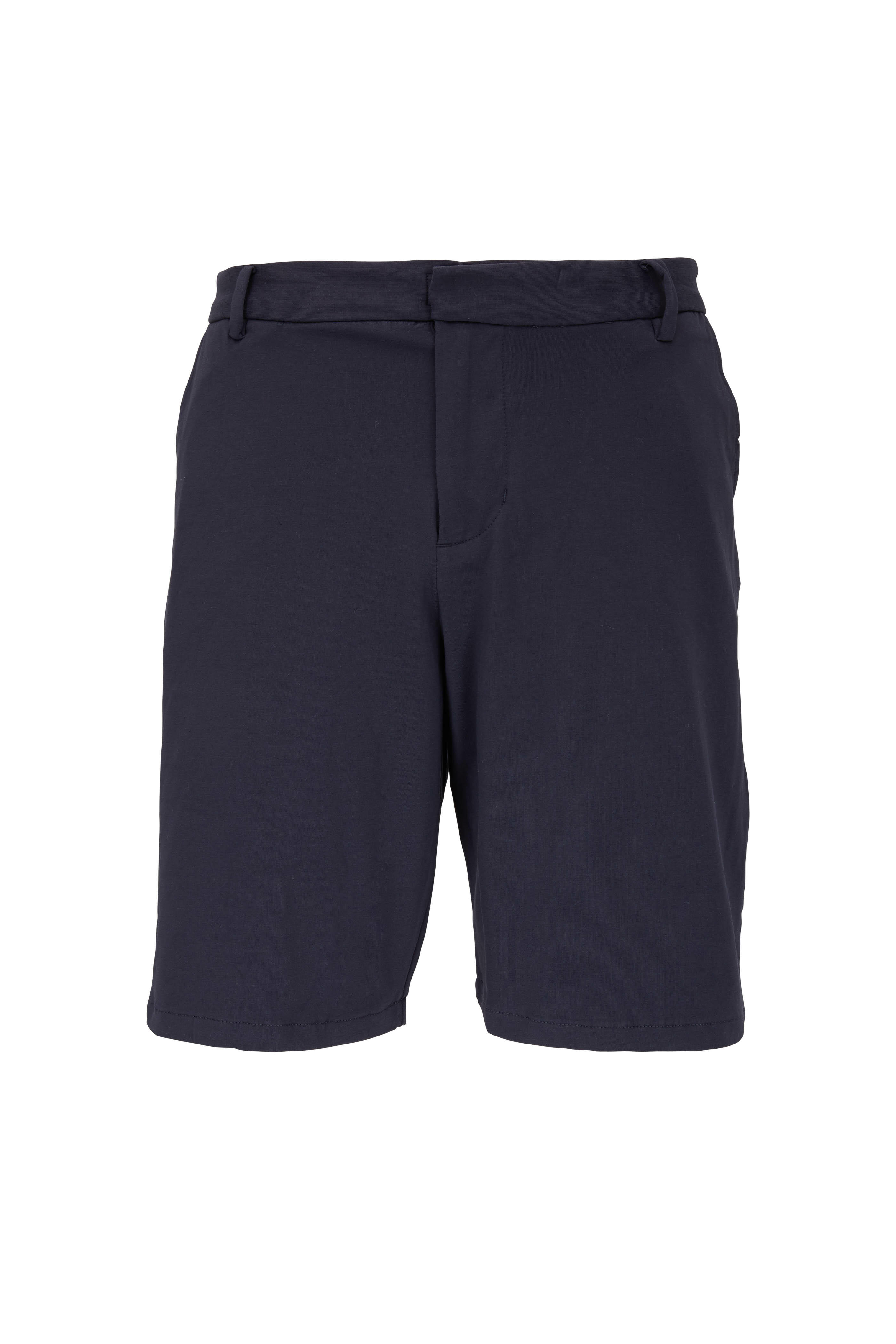 Banded waist; belt loops. Two side slash pockets two back welt pockets. Imported. Inseam: 9 ½". 96% cotton, 4% spandex. Machine wash.