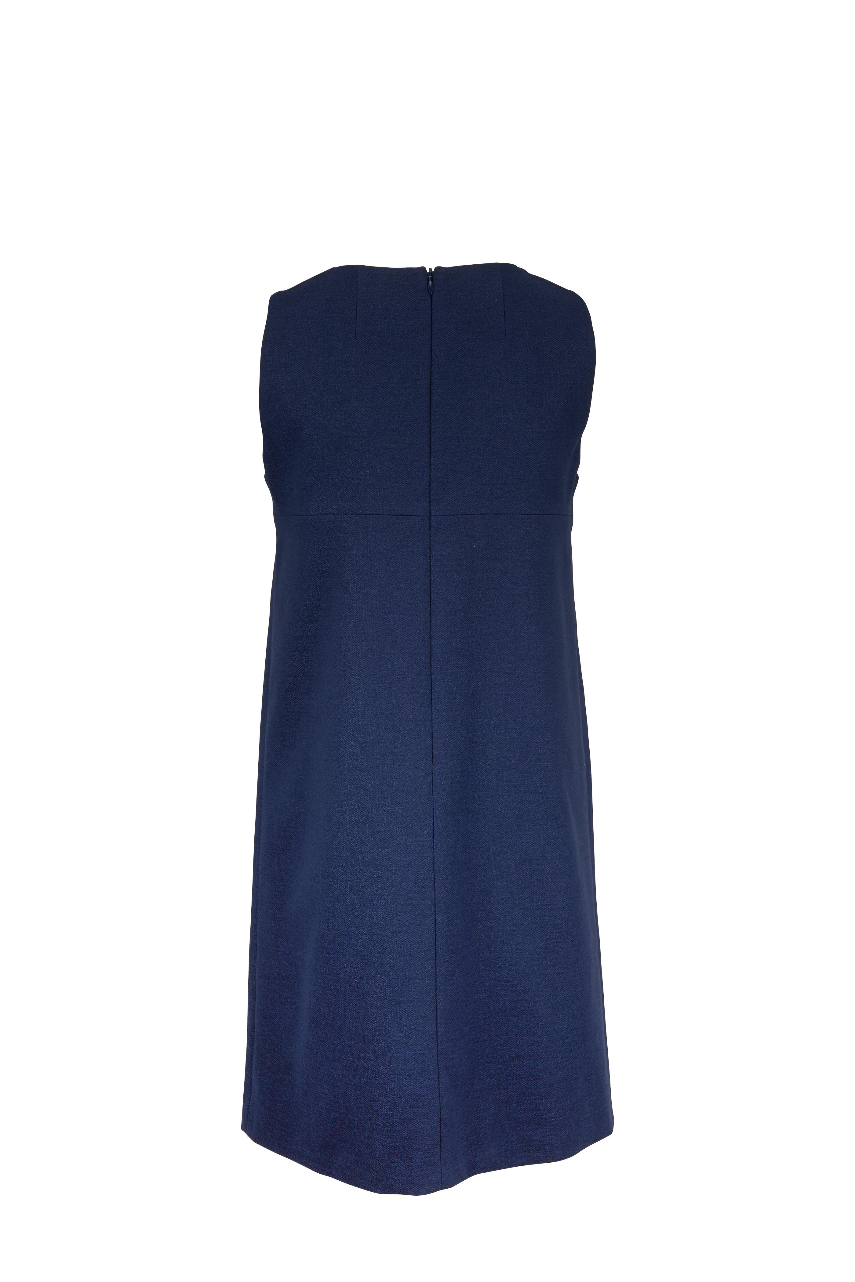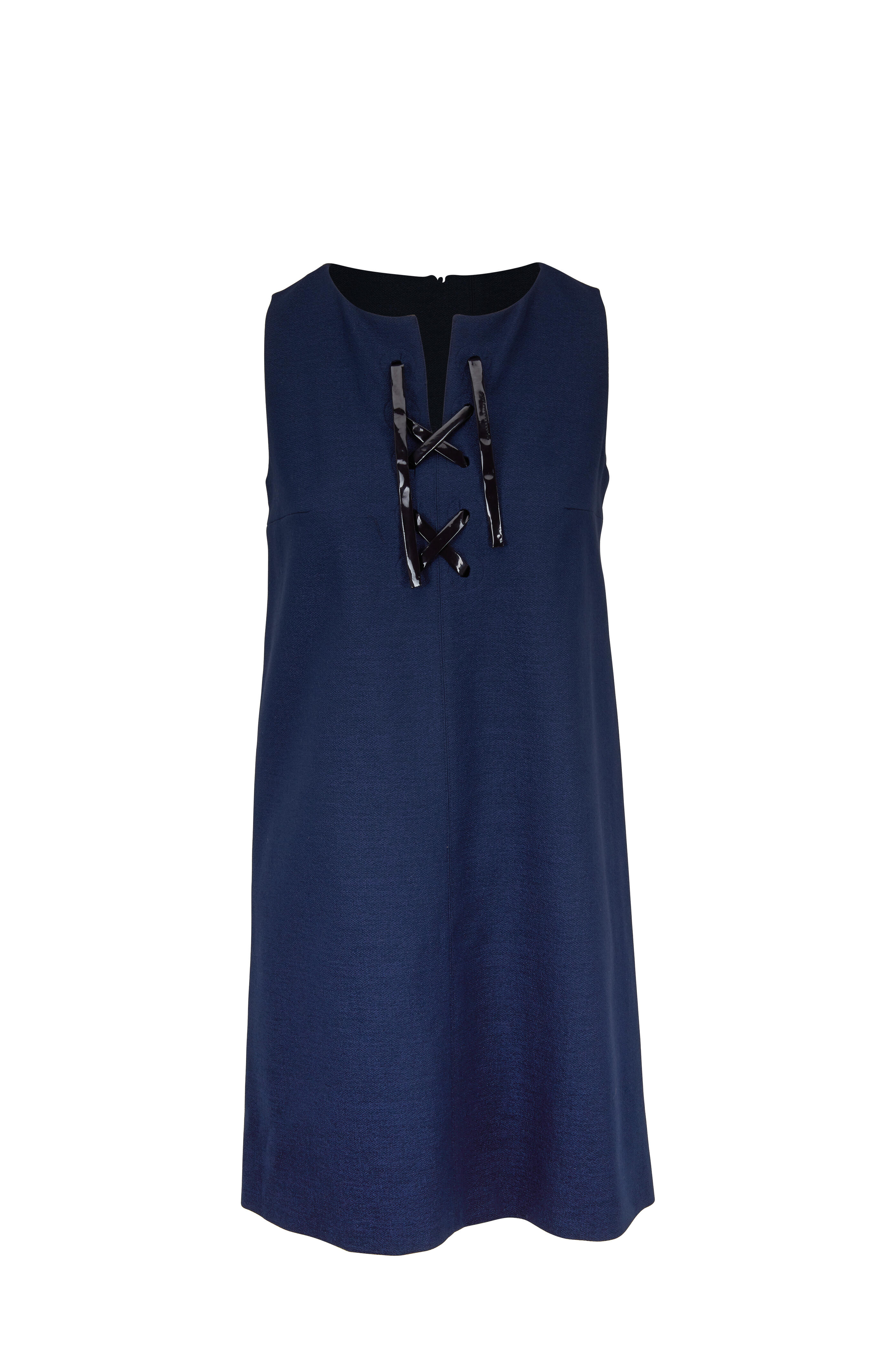 Round neckline. Contrast black lace-up. Concealed back zip closure. Straight skirt. Imported. Shift silhouette. 35" shoulder to hem. 65% cotton, 32% polyamide, 3% elastane; fully lined. Dry clean.