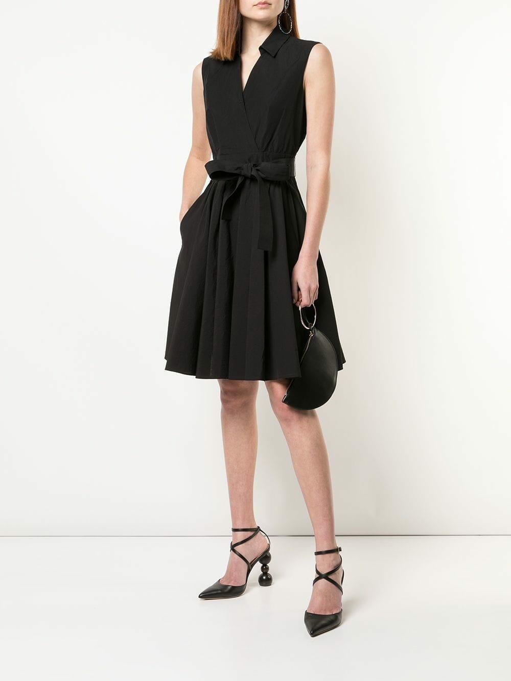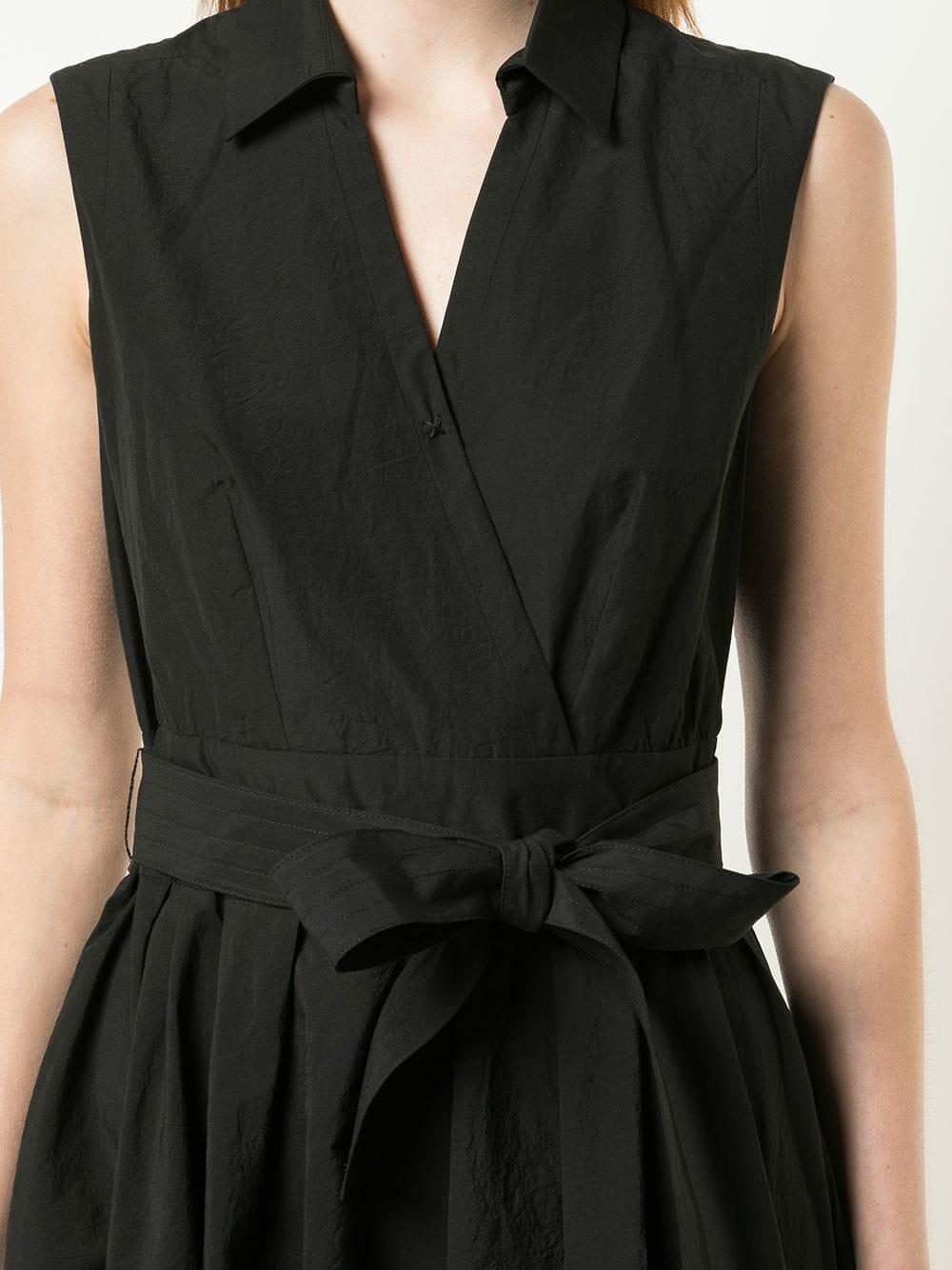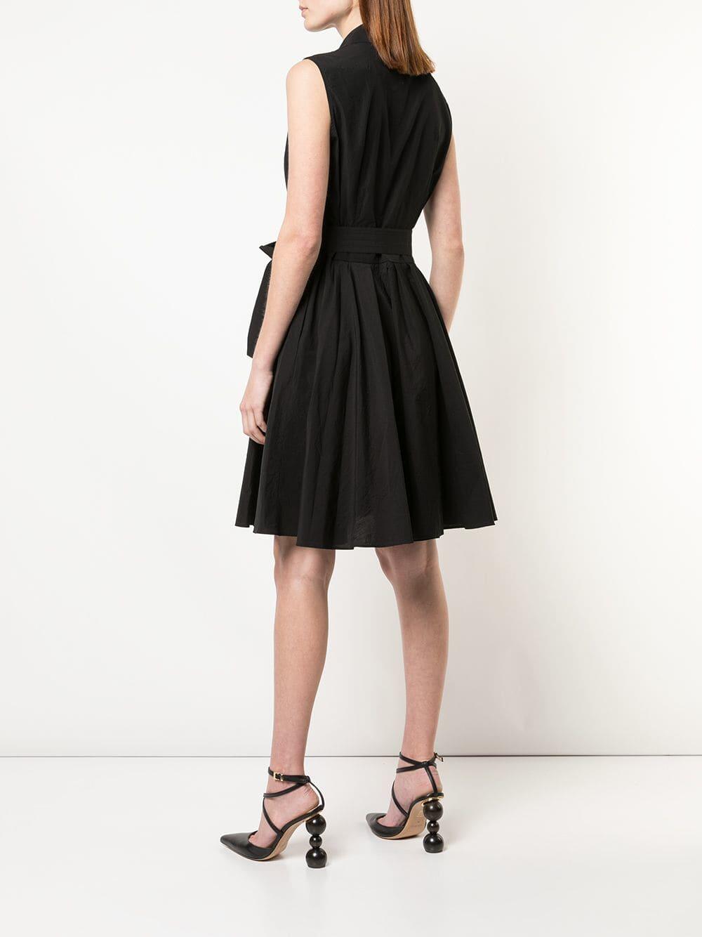 Johnny collar. Concealed side zip closure. Nipped in at natural waist; removable self belt. Side seam pockets. Full, pleated skirt. Imported. 37" shoulder to hem. 100% cotton. Dry clean.