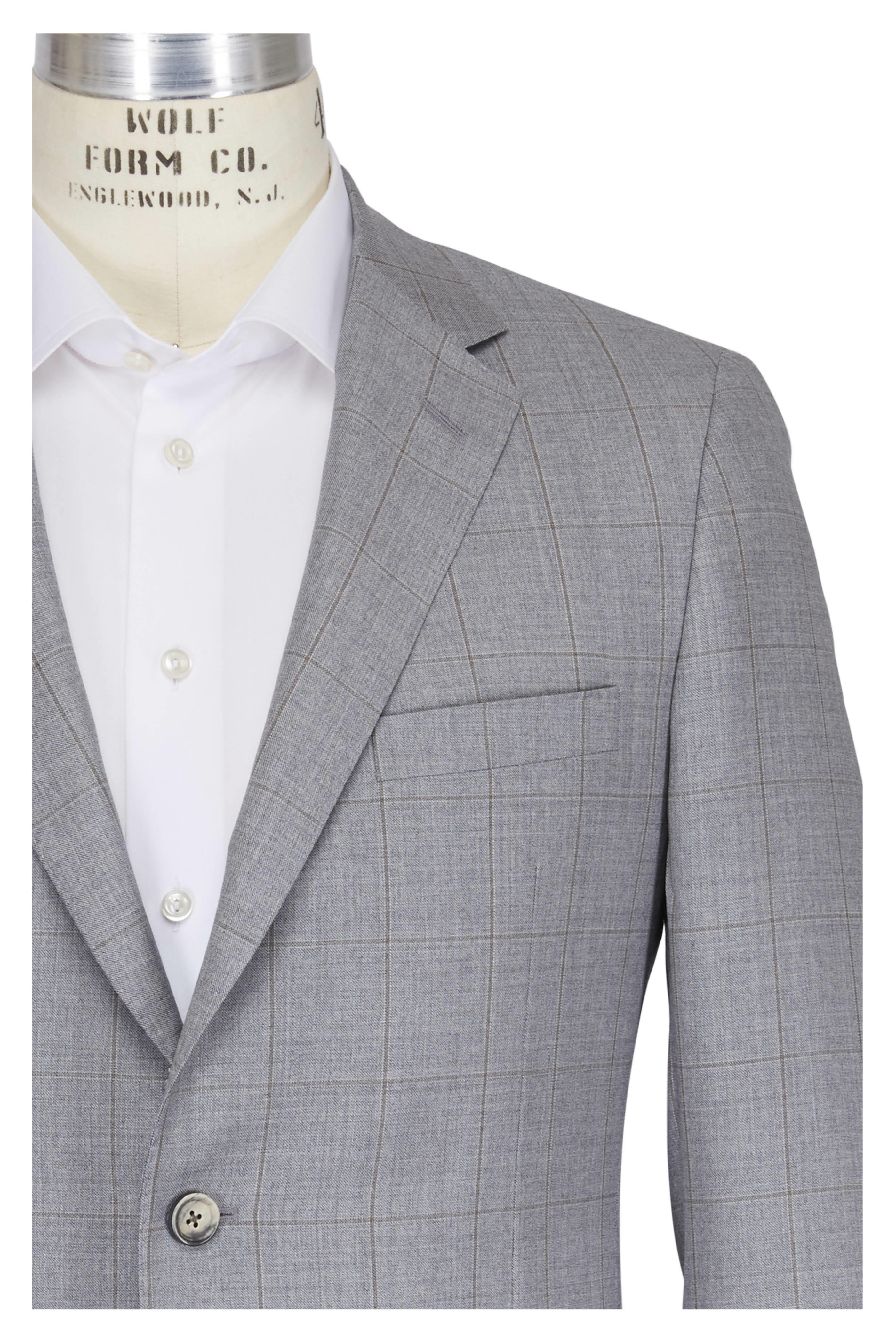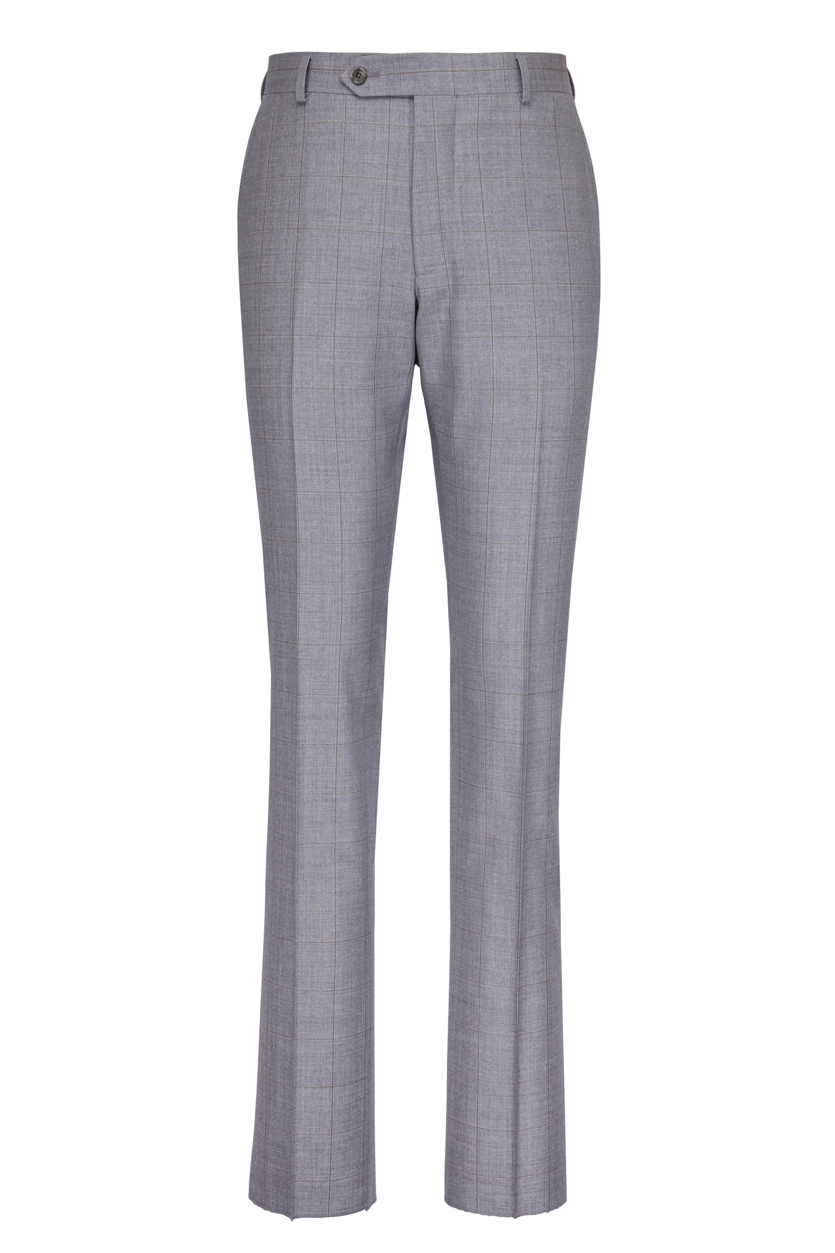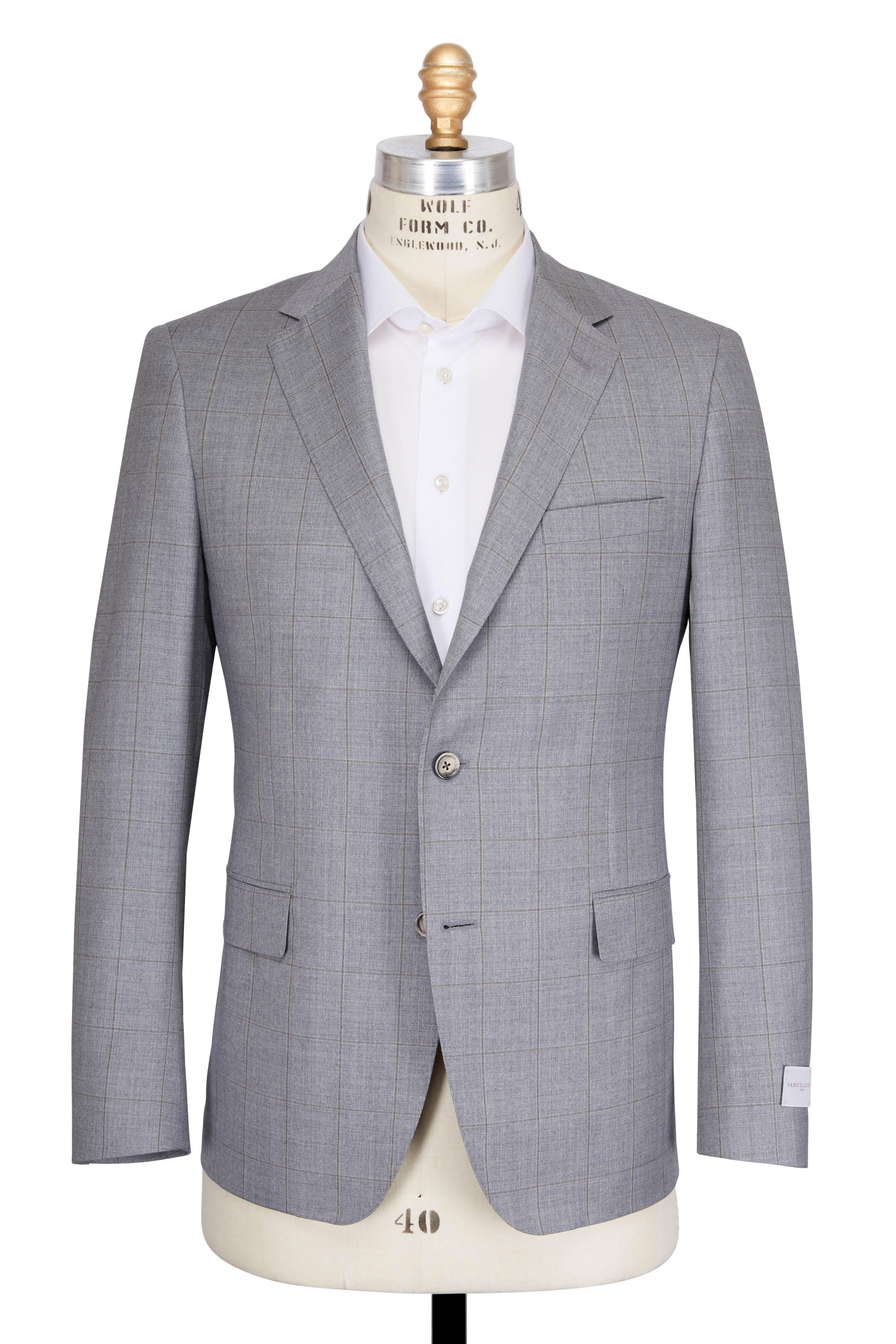 Made in Italy. Jacket: Notched lapels. Two-button closure. Chest welt pocket, front flap pockets. Double vented hem. Pants: Flat front closure. Front slip pockets, back button besom pockets. Unfinished hem. 100% wool. Dry clean.