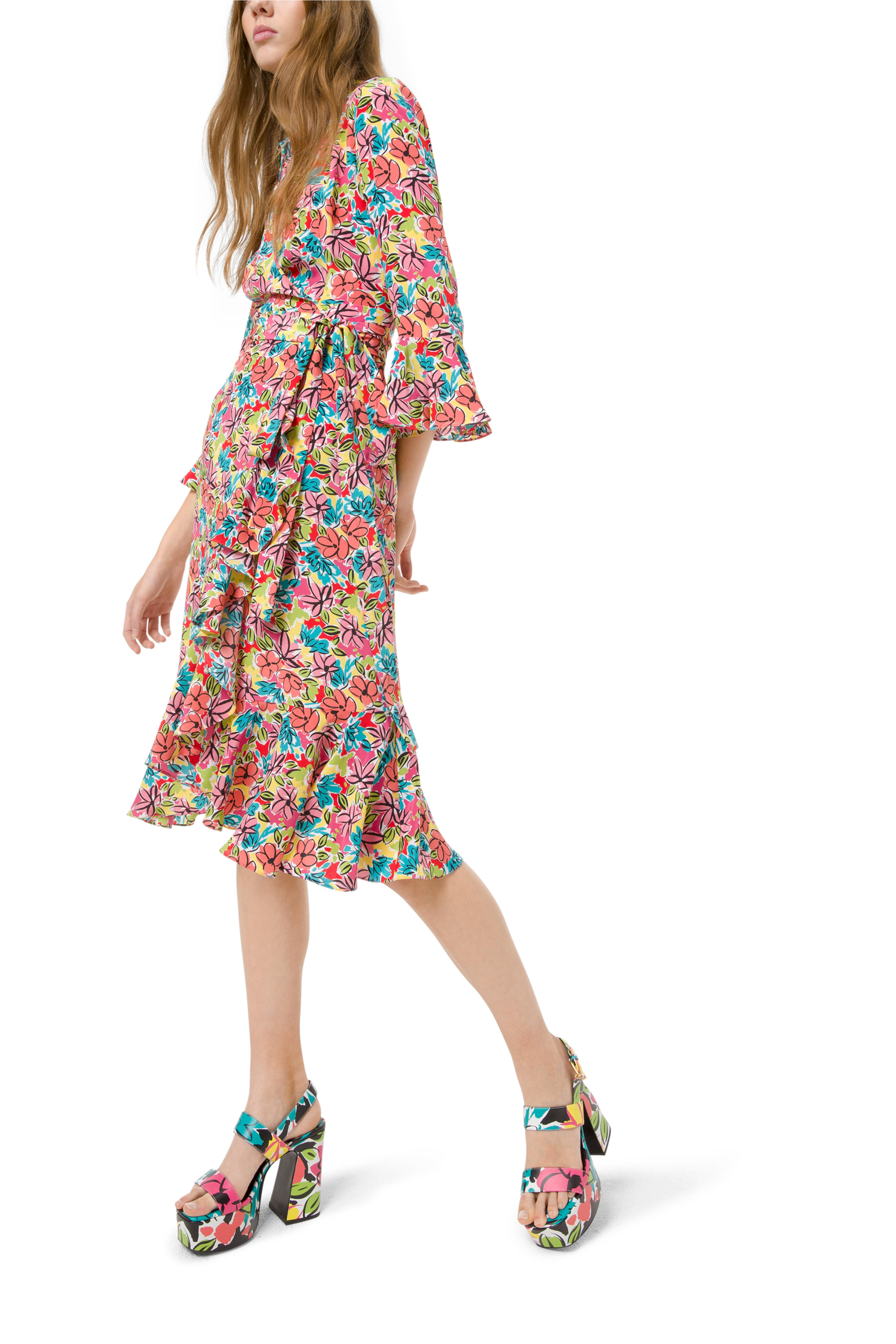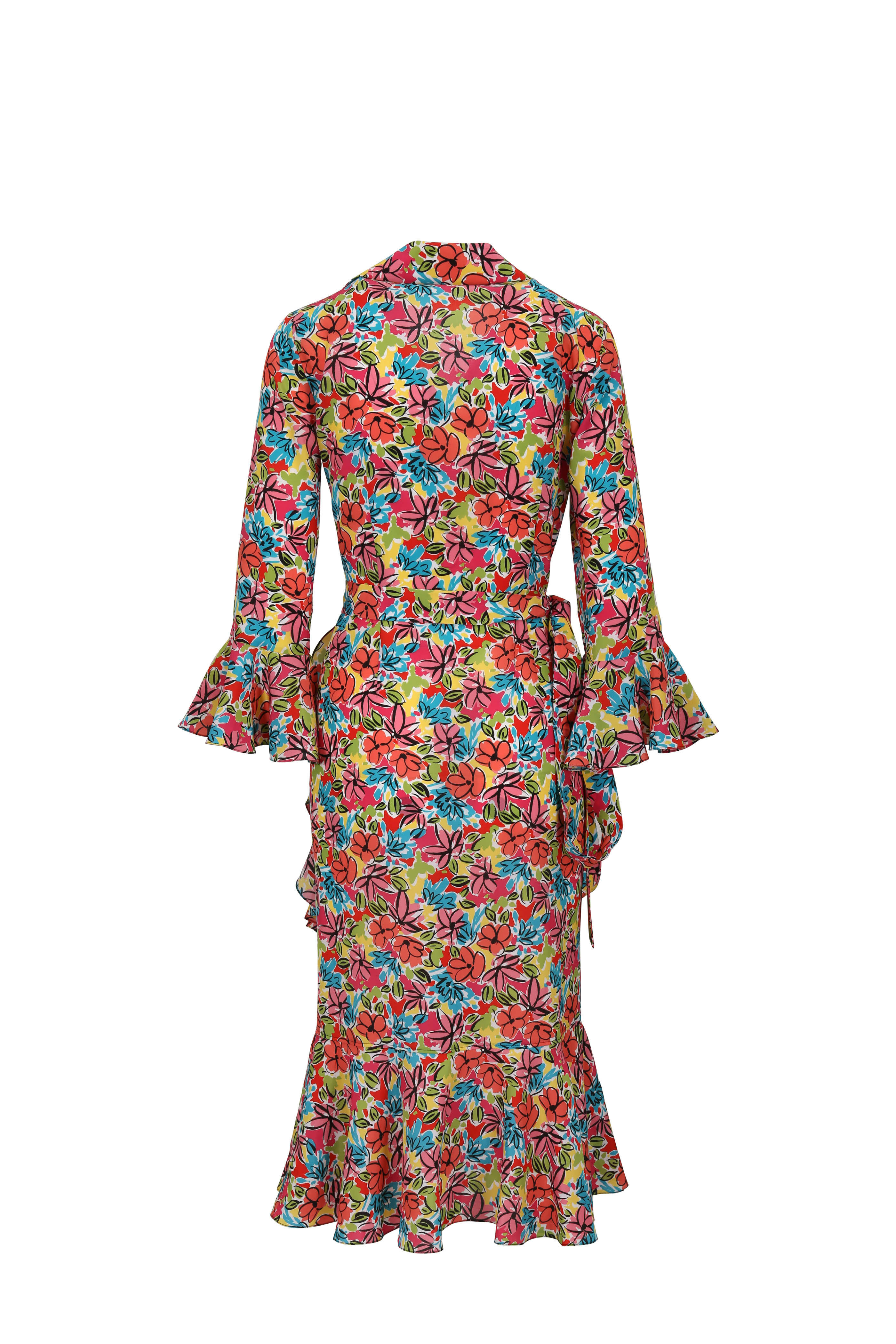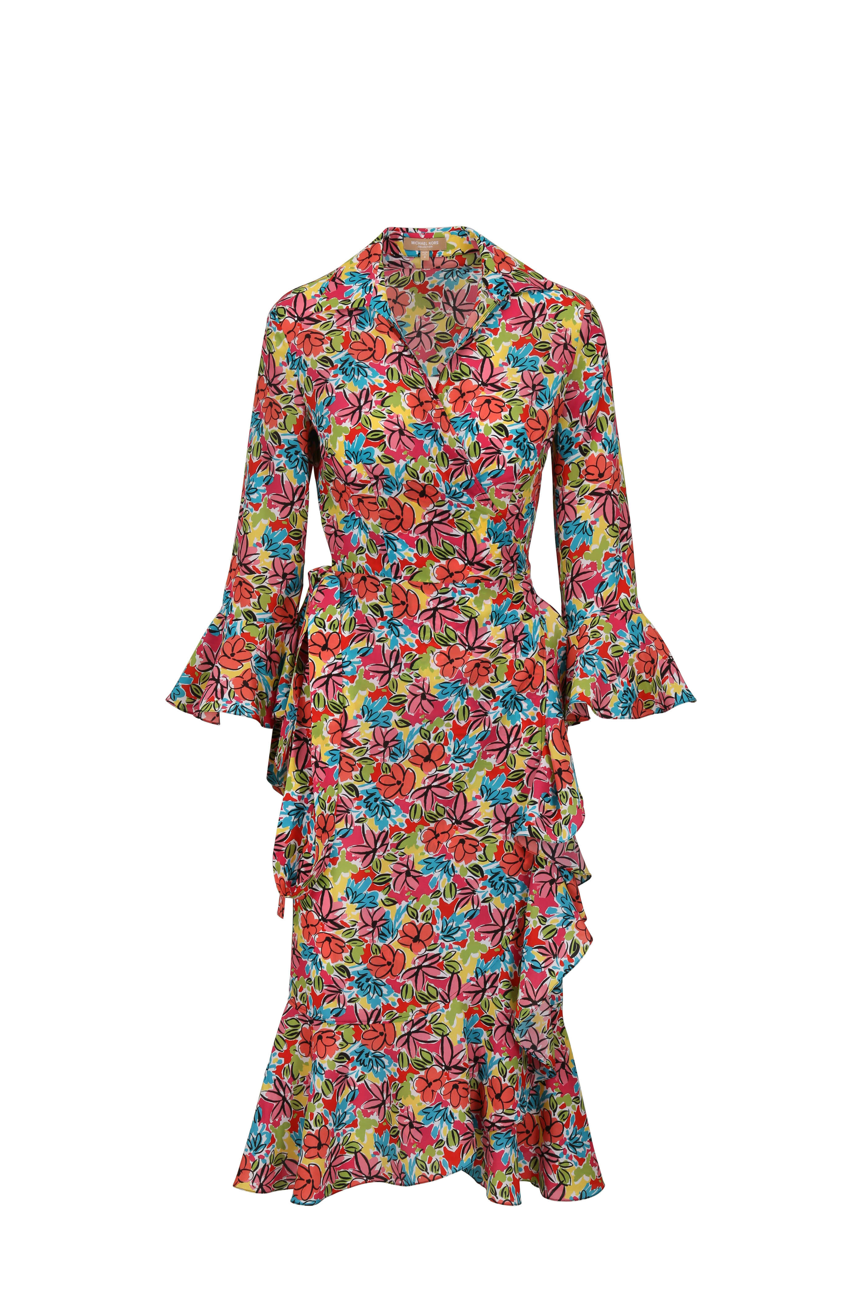 Spread collar. Wrap front. Three quarter sleeves, ruffled cuffs. Nipped in at natural waist, self tie. Slim skirt, ruffled hem. Made in Italy. 100% silk. Dry clean.