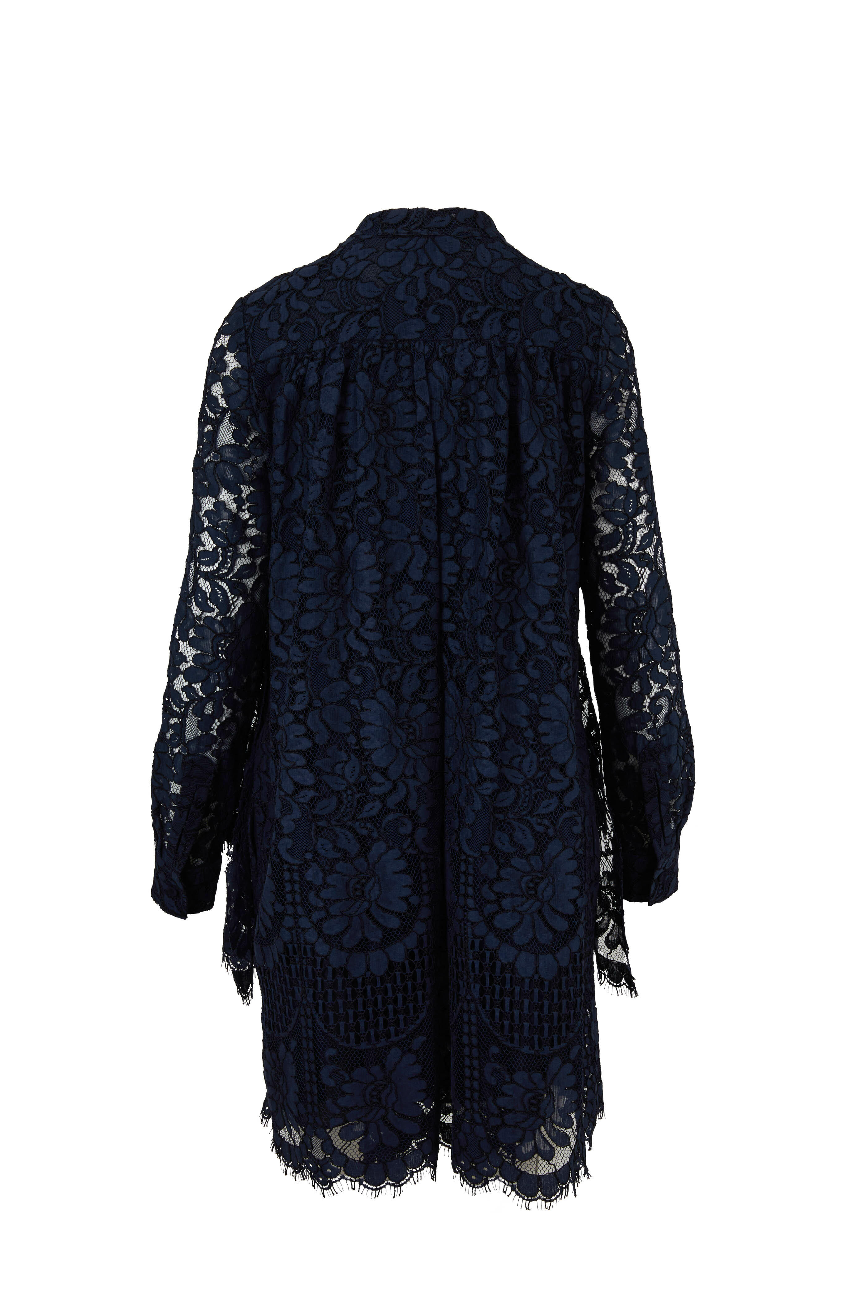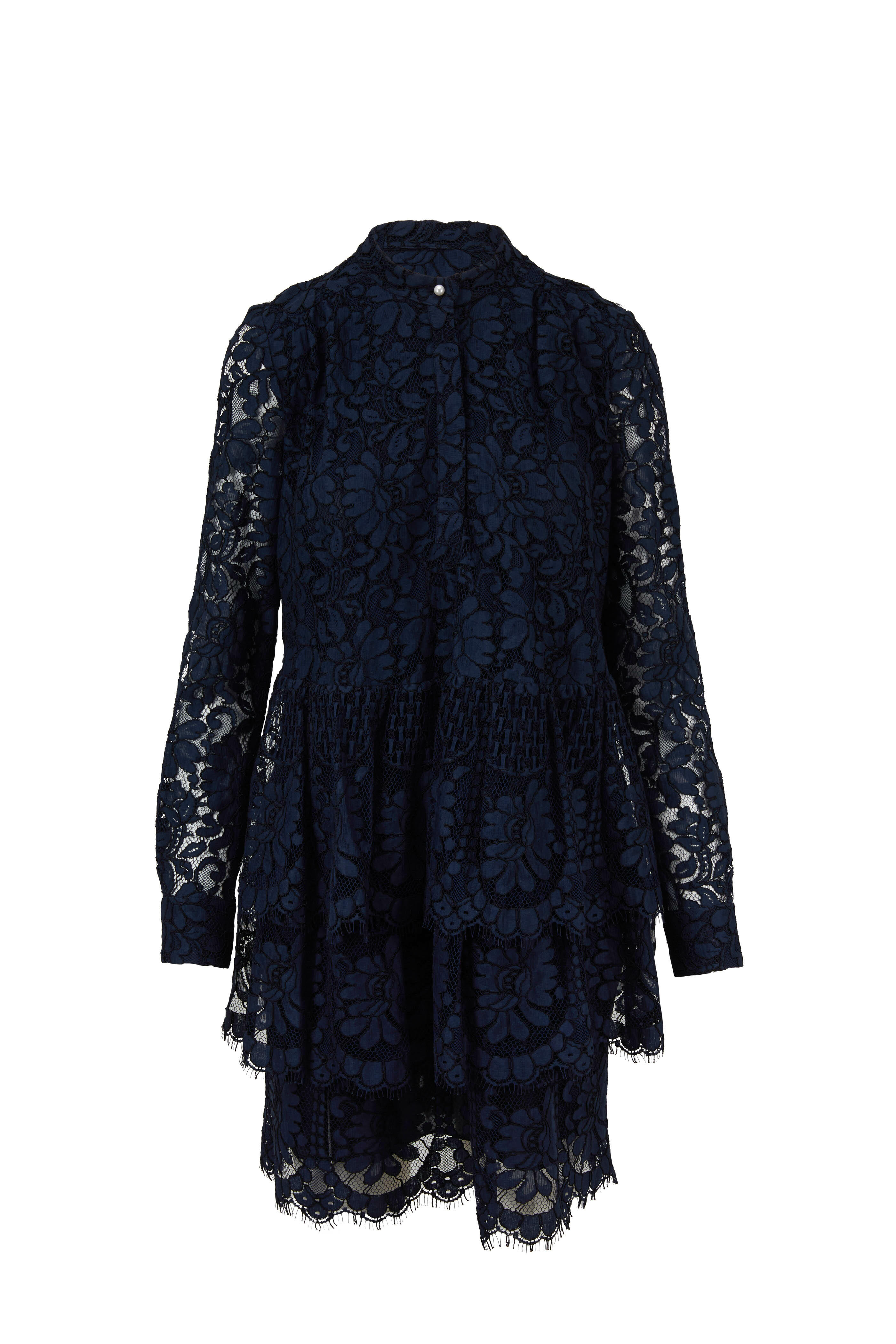 Navy Lace Tiered Ruffled Hem Long Sleeve Dress