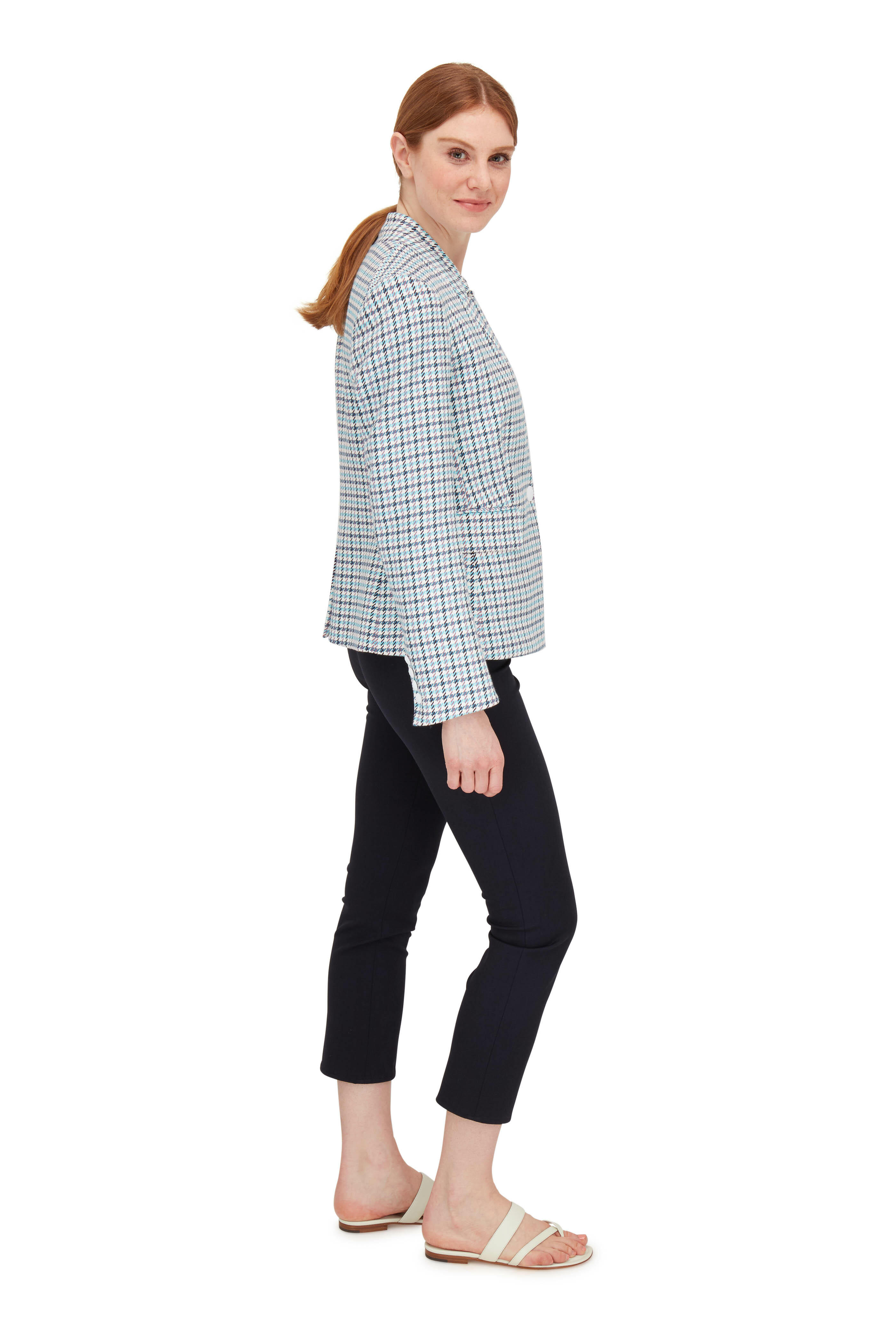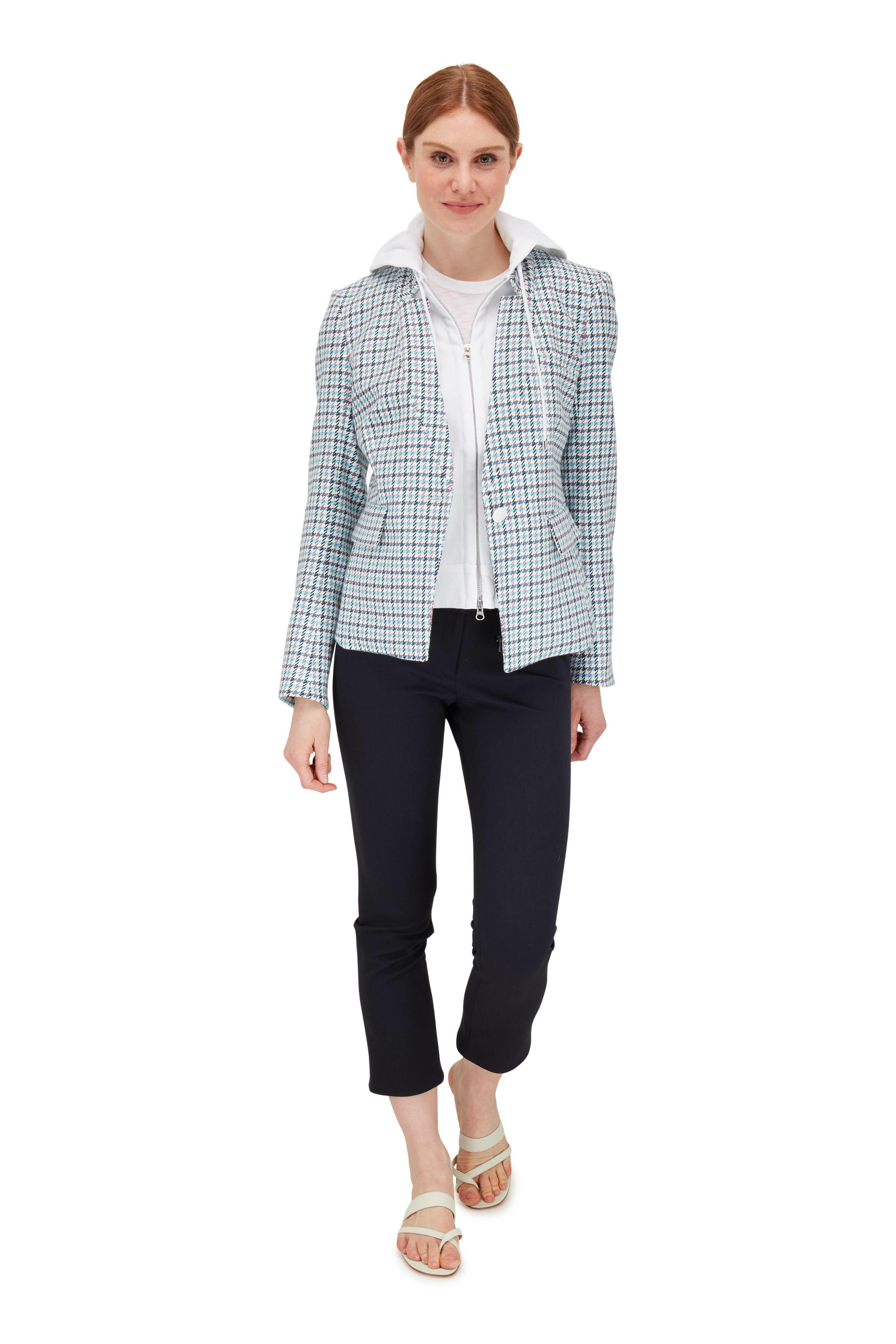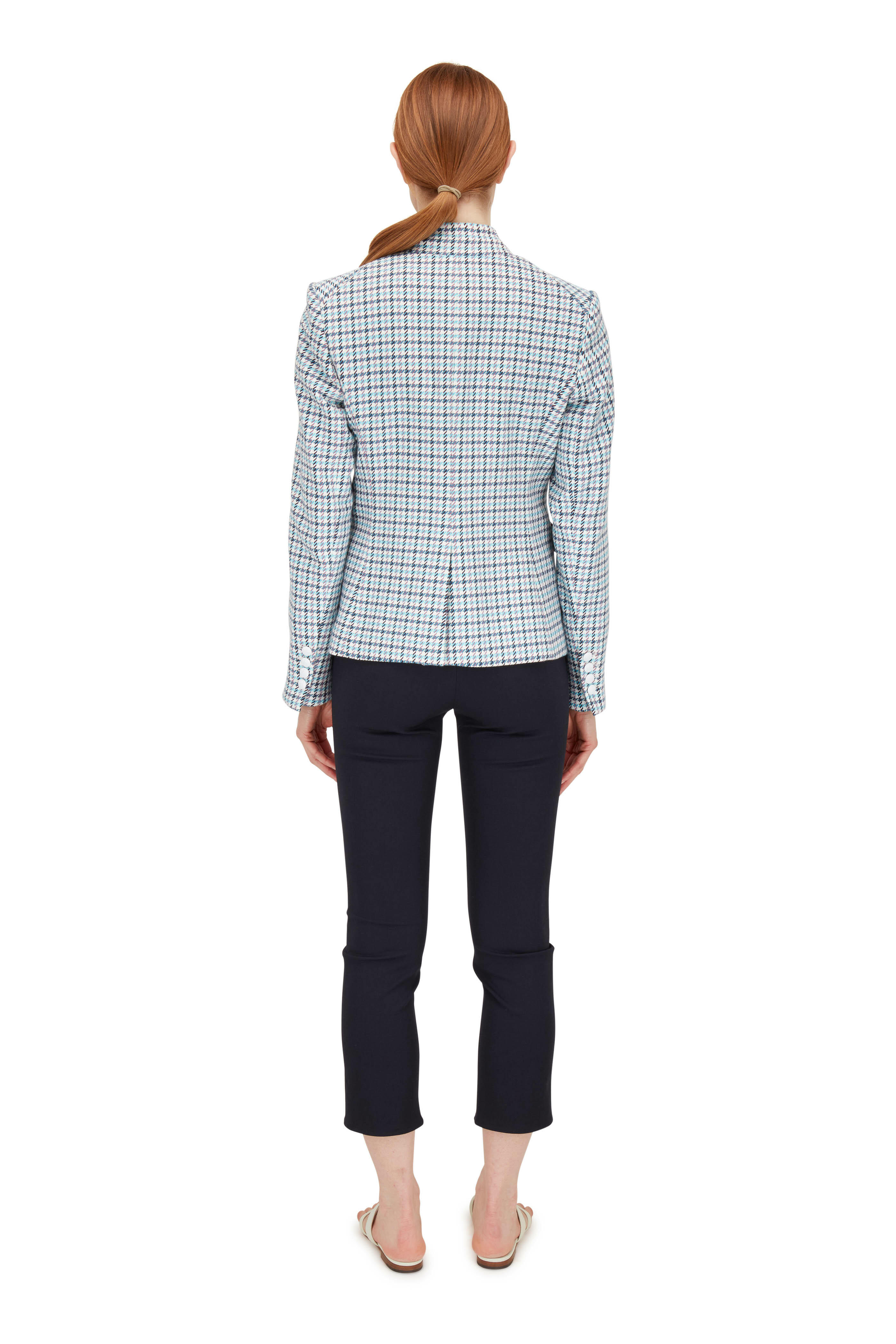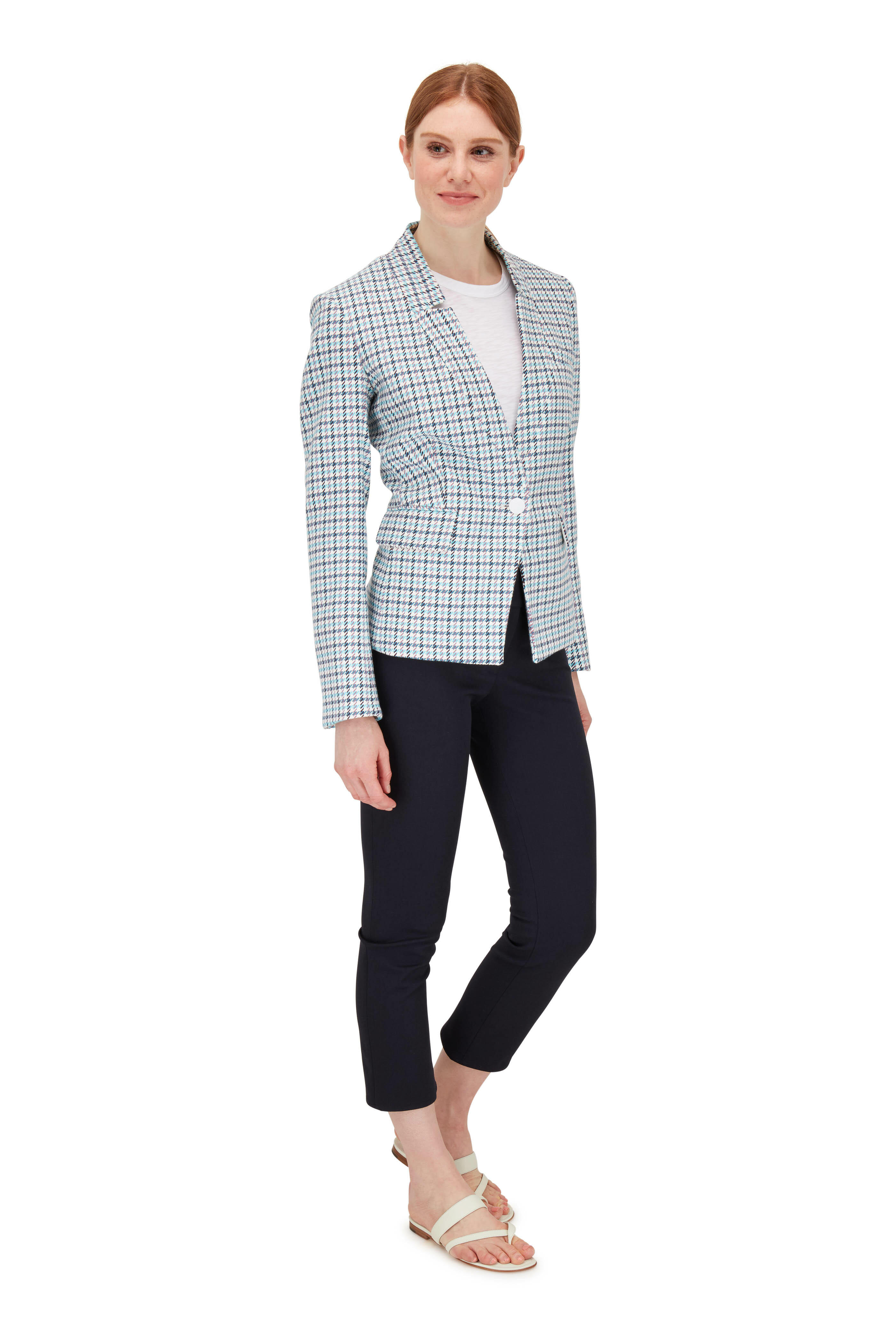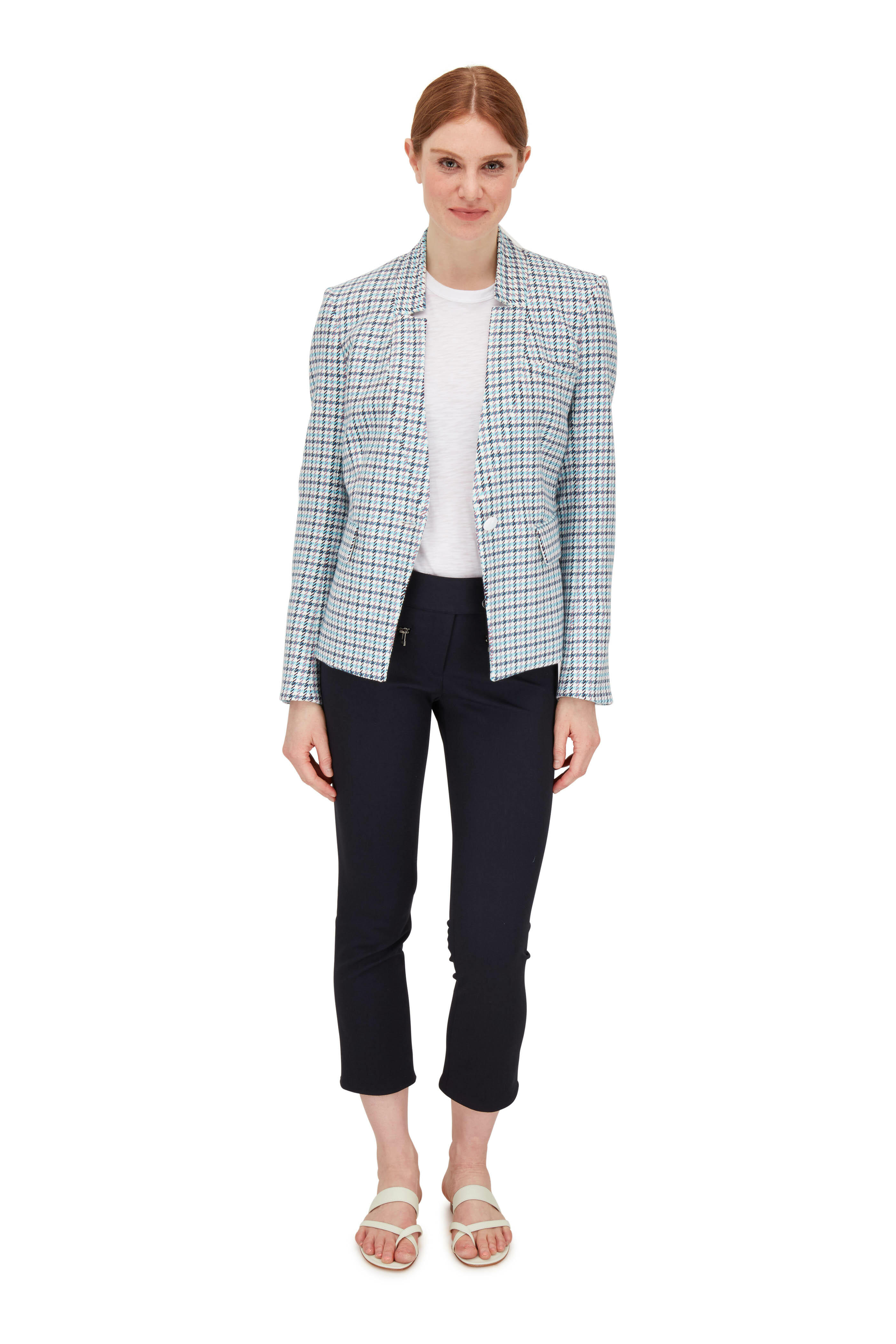 Stand notched collar. Single button front closure. Chest welt pocket, lower flap pockets. Back vent. Made in the USA. Compatible with all Veronica Beard dickeys. 98% cotton, 2% elastane. Dry clean.